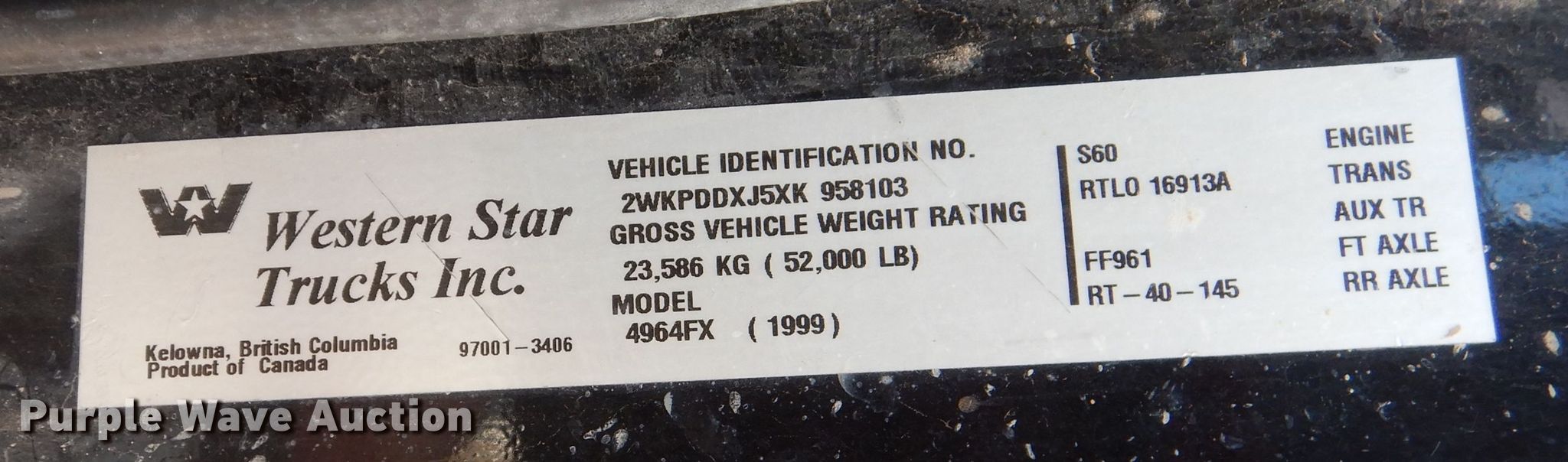 Purple Wave is selling a used Truck Tractor in Texas. This item is a 1999 Western Star 4964FX semi truck with the following: Miles: 692,869 on odometer, VIN: 2WKPDDXJ5XK958103