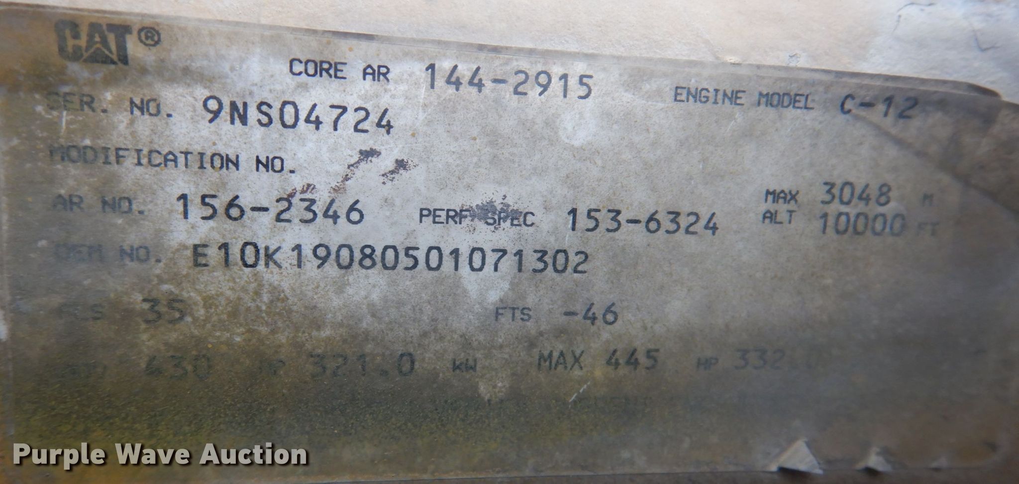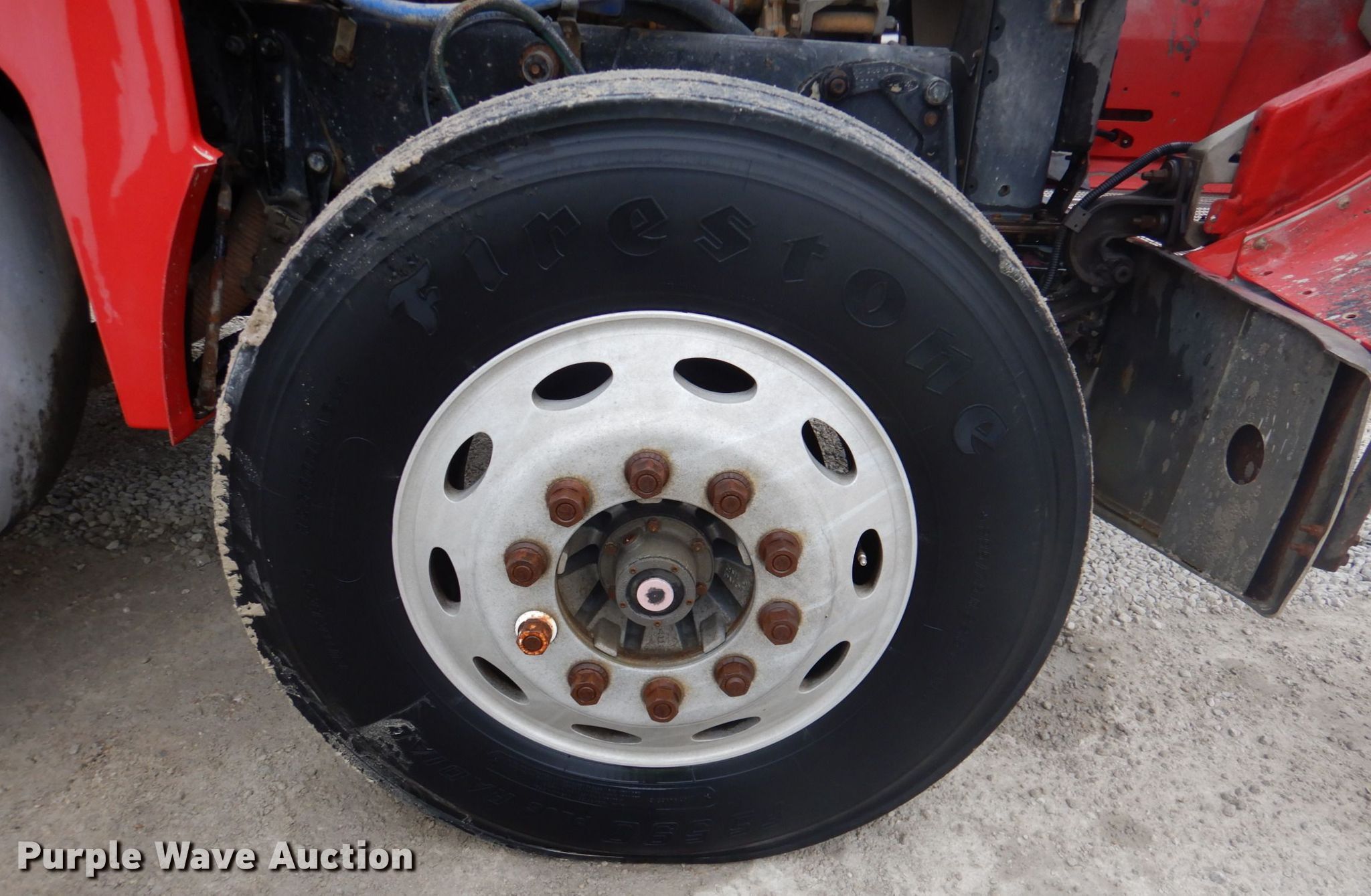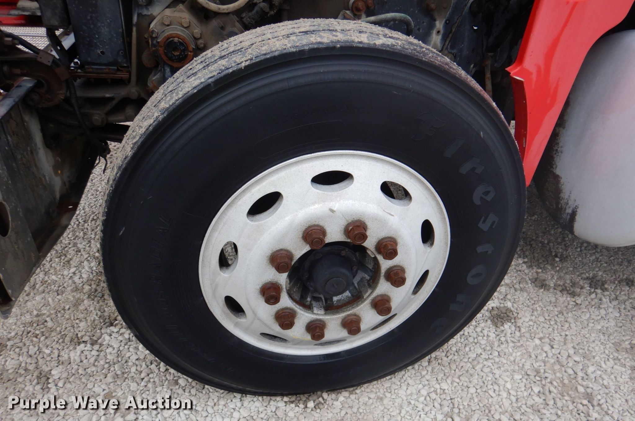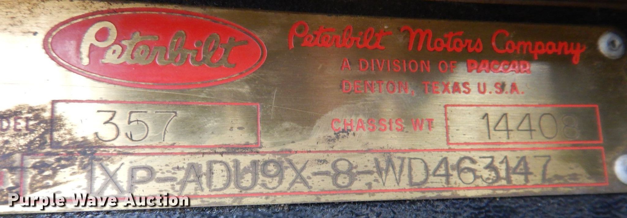 1998 Peterbilt 357 semi truck. Miles: 24,806 on odometer, VIN: 1XPADU9X8WD463147, Unit #: 71.500. Engine Caterpillar C12, Cylinders: 6, Fuel type: Diesel, HP: 430. Transmission Manual, Speed: 10. Chassis Axles: Tandem, Differential lock: Inter-axle, Suspension: Air, Brakes: Air, PTO, Wet kit, GVWR: 52,000 lbs FAWR: 12,000 lbs, IAWR: 20,000 lbs, RAWR: 20,000 lbs, Wheelbase: 200". Interior AC, Heat, Heated mirrors, Cruise control, Air ride cab. Operational Deck plate: Aluminum, Fifth wheel type: Sliding, Fuel tank: Dual. Tires Size: 295/75R22.5. Notes Windshield chipped or cracked. Kansas title. Builders Choice Concrete. Topeka, KS 66616