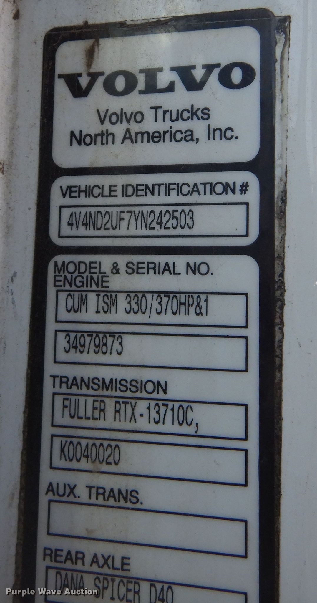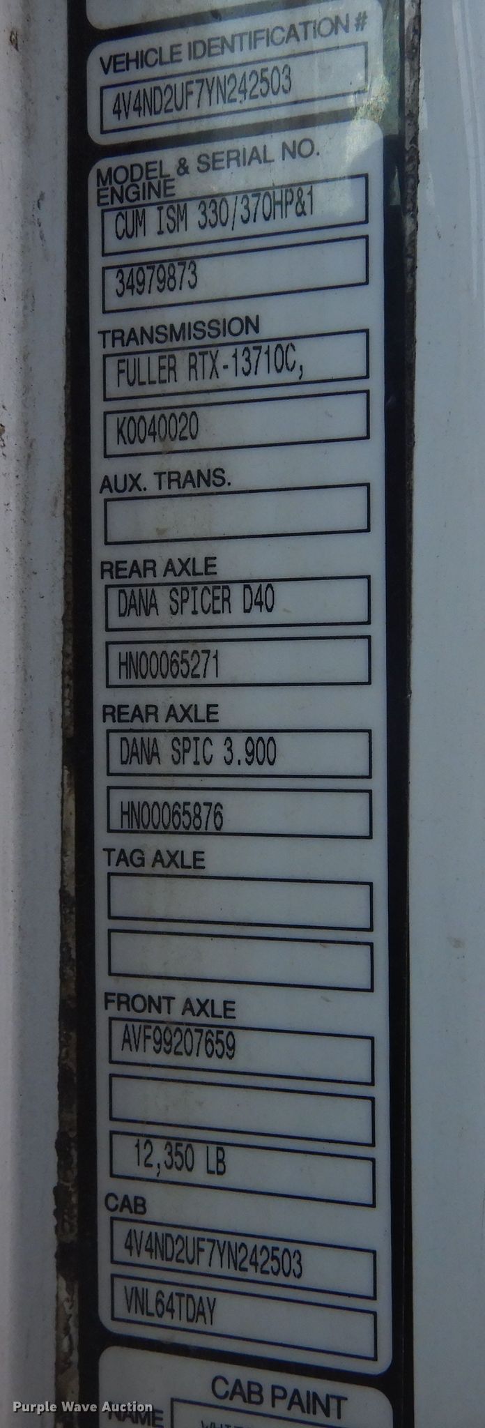 2000 Volvo VNL semi truck. Miles: 806,783 on odometer, VIN: 4V4ND2UF7YN242503. Engine Cummins ISM, Displacement: 10.8L, Cylinders: 6, Fuel type: Diesel. Transmission Eaton Fuller, Manual, Speed: 10. Chassis Axles: Tandem, Differential lock: Inter-axle, Suspension: Air Dump valves, Brakes: Air, GVWR: 50,350 lbs FAWR: 12,350 lbs, IAWR: 19,000 lbs, RAWR: 19,000 lbs. Interior AC, Heat, Heated mirrors, Power windows. Operational Fifth wheel type: Fixed, Fuel tank: Dual. Tires Size: 295/75R22.5. Notes Dash warning indicator: ABS, Windshield chipped or cracked. South Dakota title. Pro Contracting. 1804 W Havens St. Mitchell, SD 57301