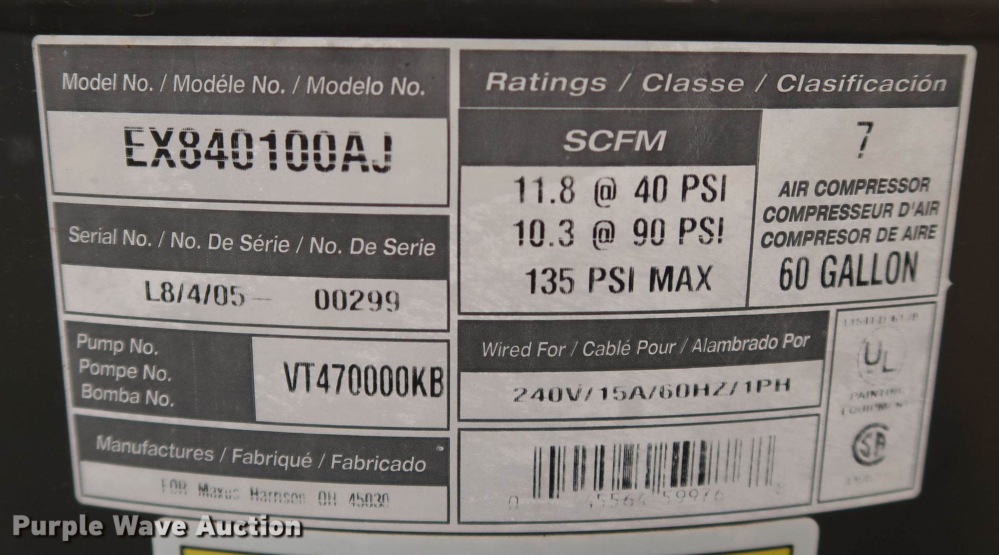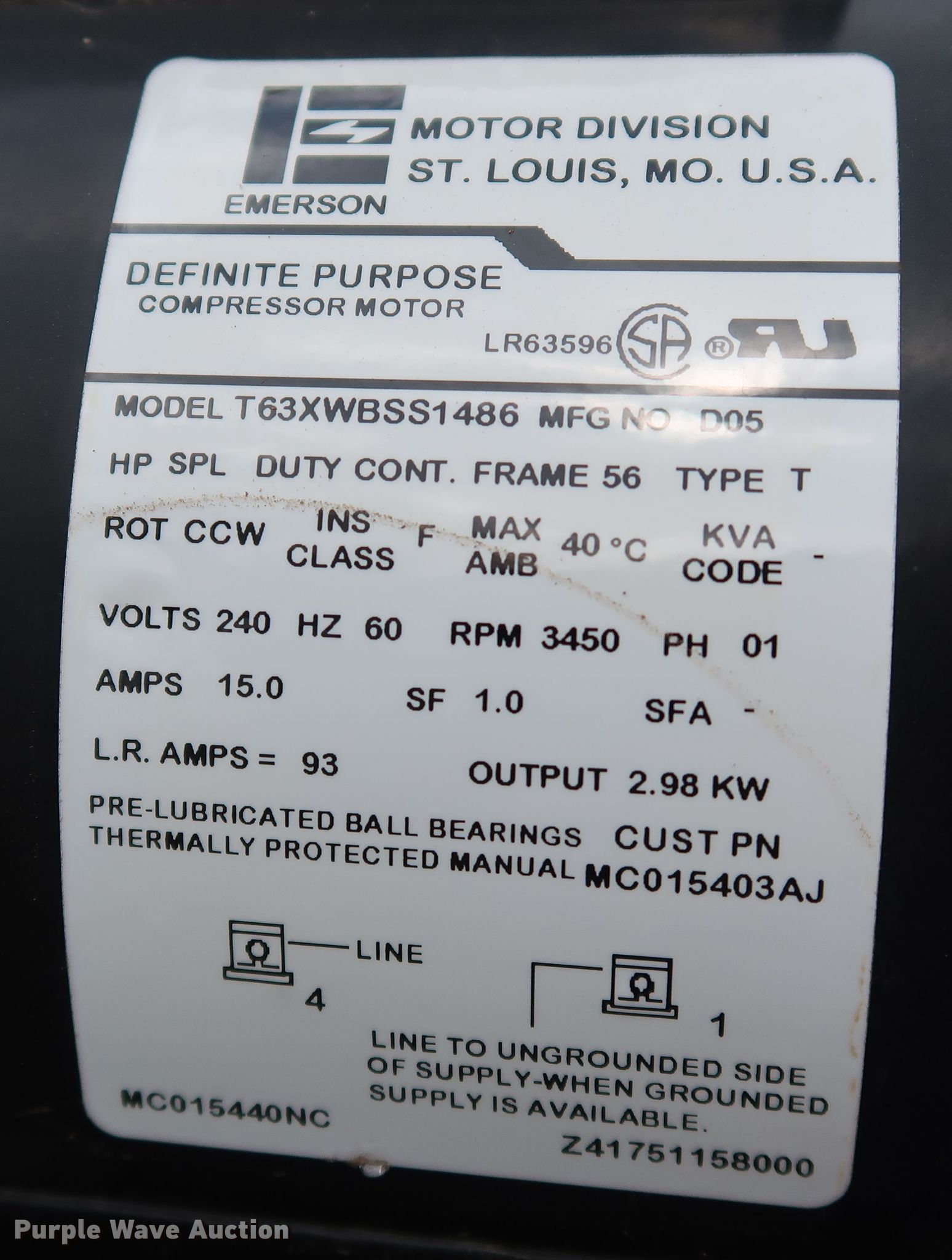 Purple Wave is selling a used Air Compressor in Oklahoma. This item is a Maxus air compressor with the following: Emerson T63XWBSS1486, HP: 7, kW: 2.98, Phase: Single