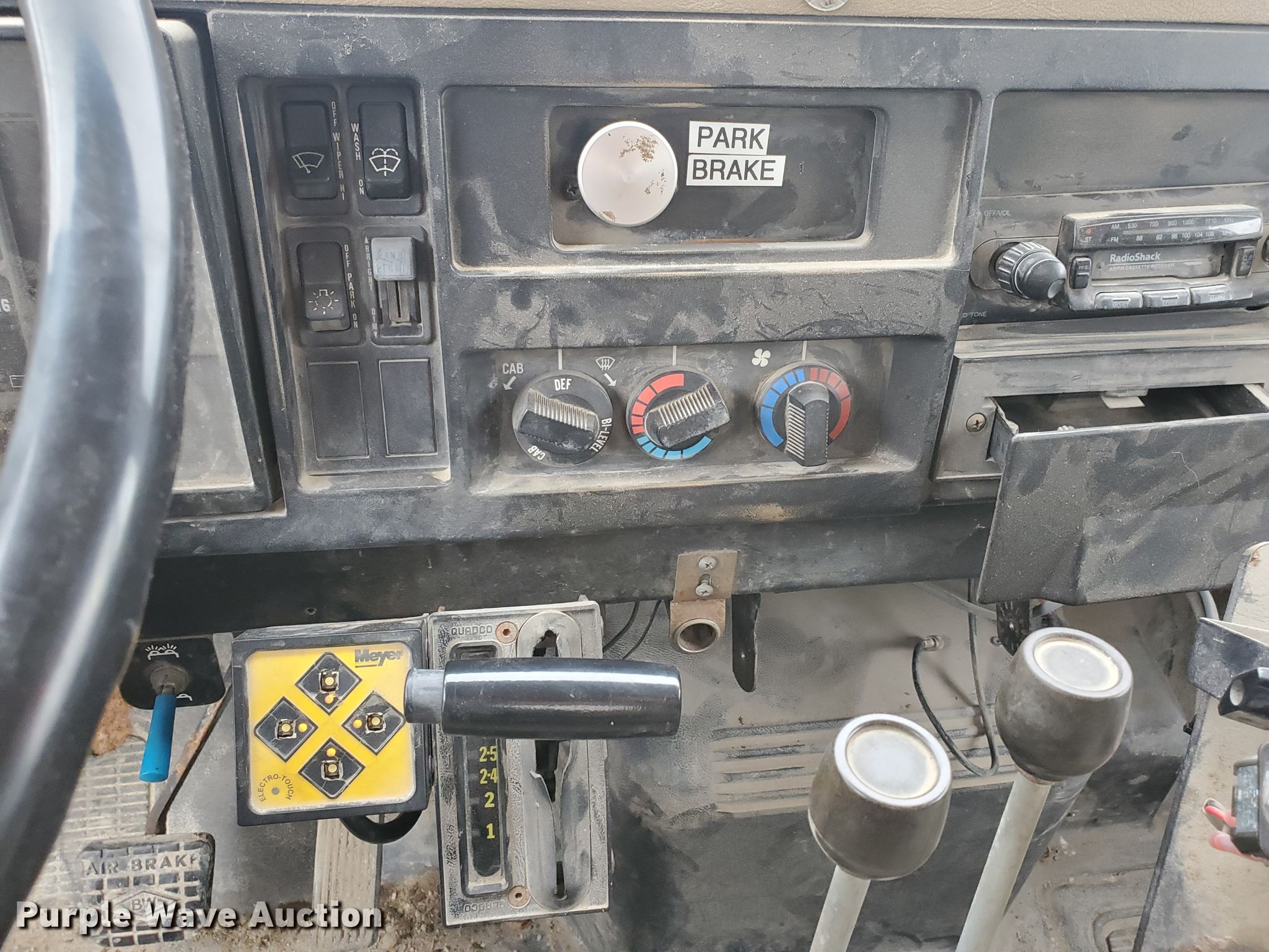 1992 International 4700 dump truck. Miles: 59,289 on odometer, Hours: 8,623 on meter, VIN: 1HTSCPHN4NH439416. Engine International, Displacement: 5.9L, Cylinders: 6, Fuel type: Diesel. Transmission Allison, Automatic. Chassis Axles: Single, Suspension: Spring, Brakes: Air, PTO, GVWR: 32,200 lbs. Interior Heat. Operational Dump bed 14' L x 8' W, Side board height: 14", Bed type: Steel, Ram: Single, Plow Meyer, Width: 120", MT 400 de-icer applicator 1,500 gallon poly tank, Spray bars. Tires Size: 10.00-20. Notes Non-operational hydraulic hoist. Kansas title. City of Hays, KS. 1002 Vine St. Hays, KS 67601