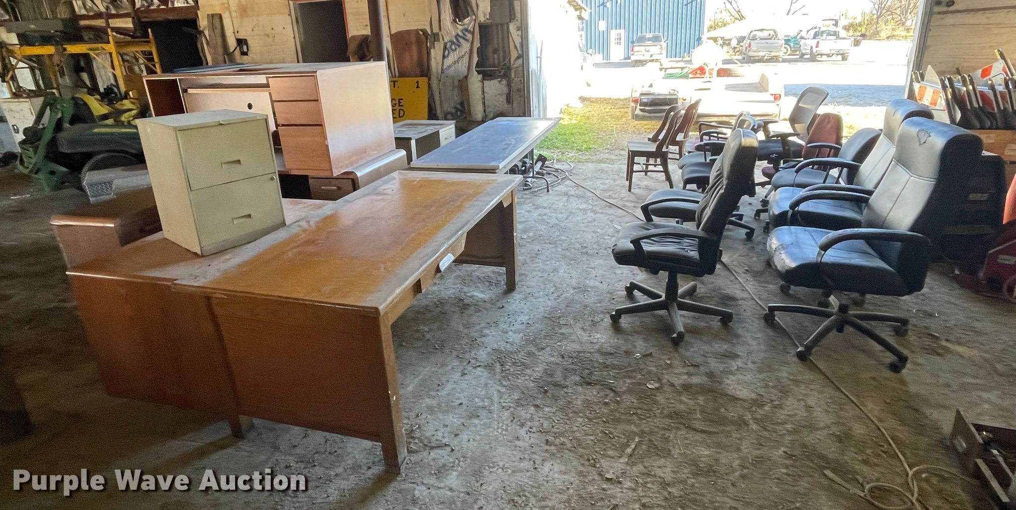 Purple Wave is selling a used Furniture in Oklahoma. This item is a Furniture with the following: (12) chairs, 8'L x 30"W table, (5) desks