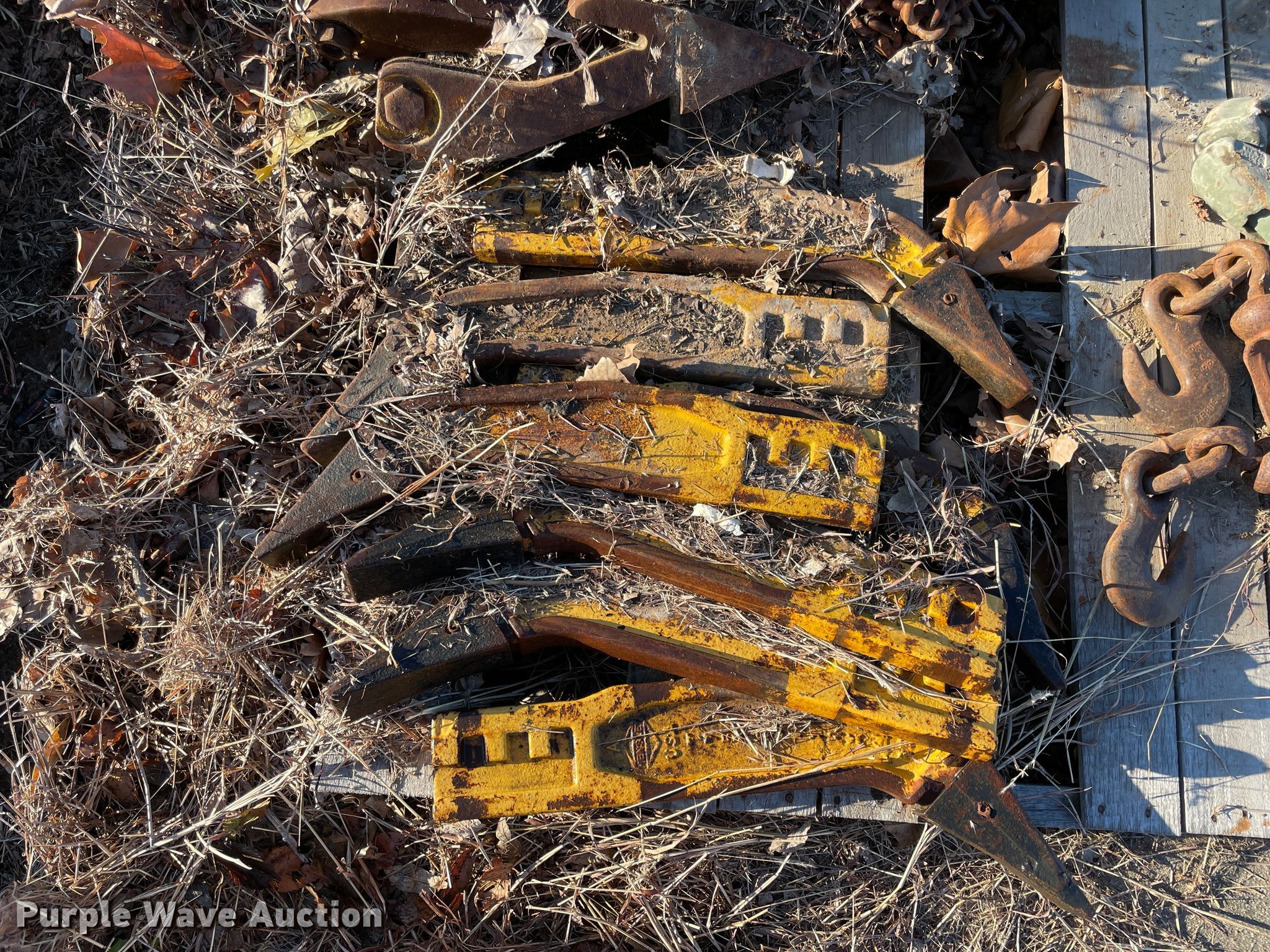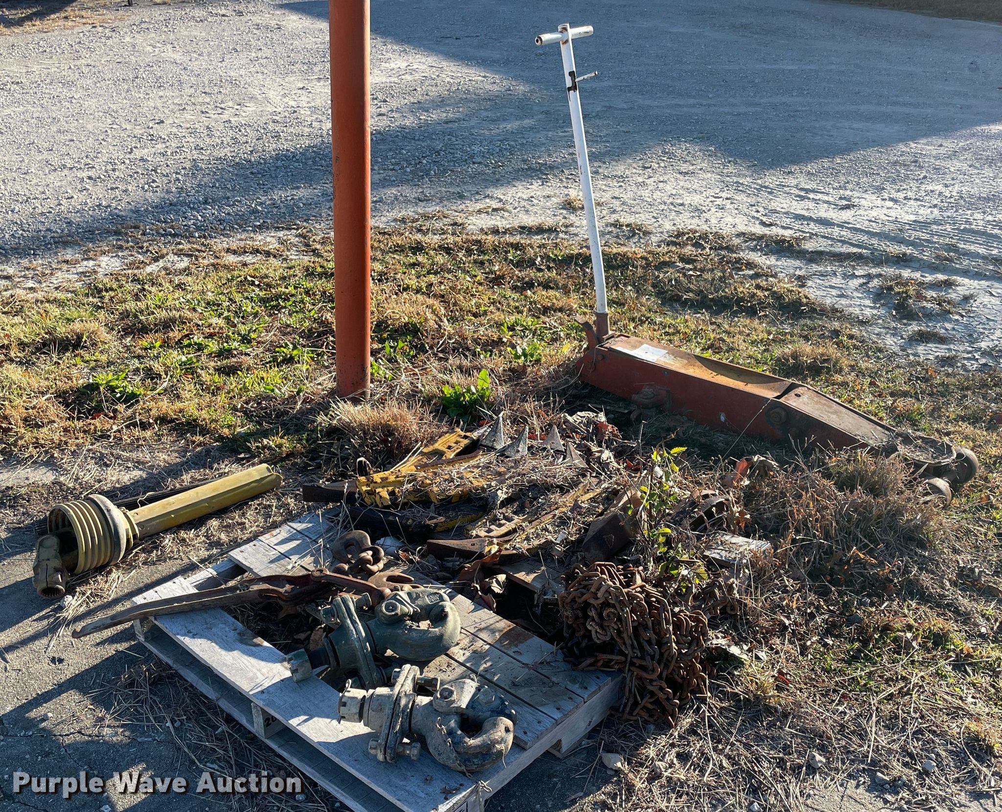 Purple Wave is selling a used Tools in Oklahoma. This item is a Tools with the following: (6) ripper teeth, 1000 PTO shaft, Metal bender, (2) pintle hitches, Jack stand, Unknown operating condition