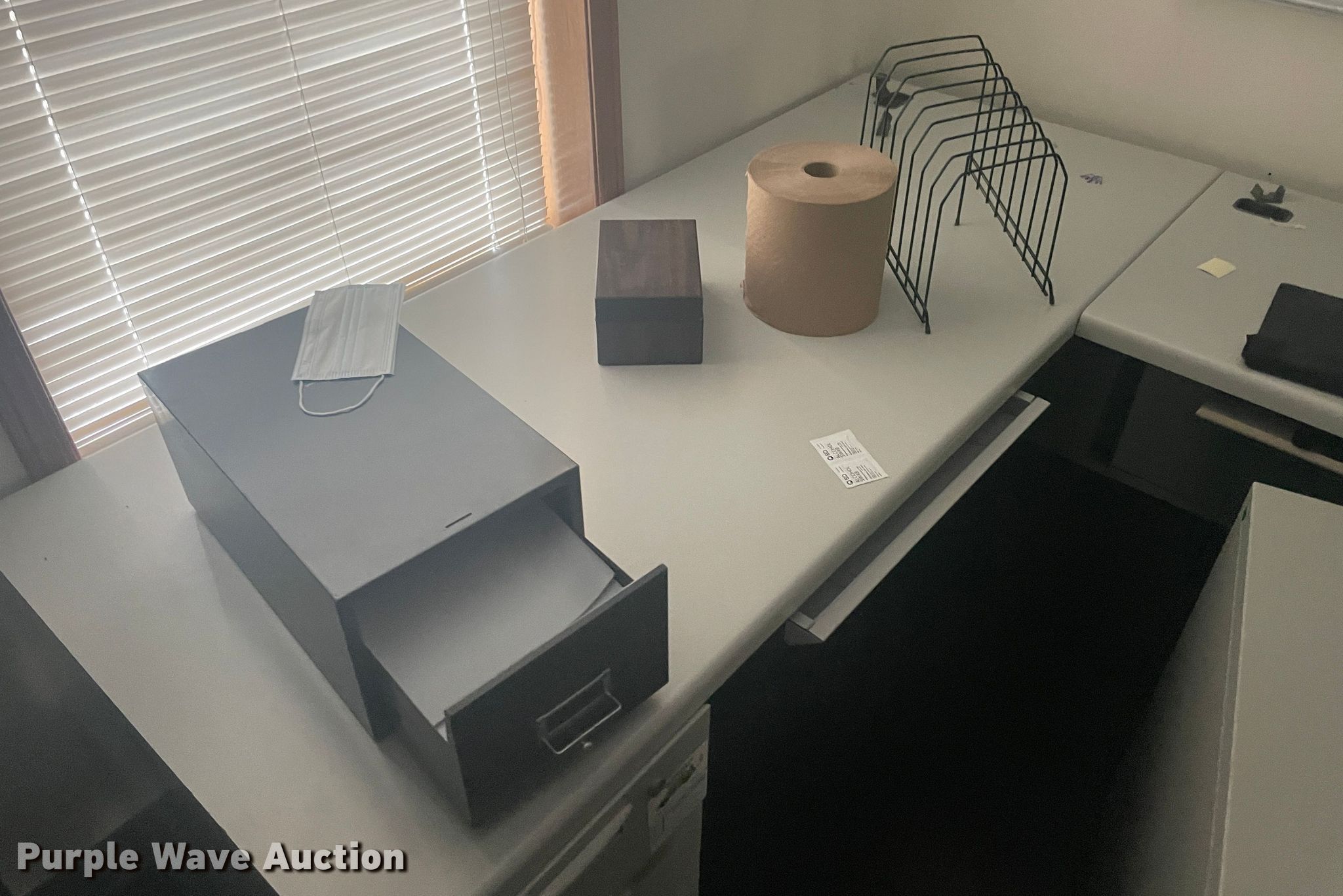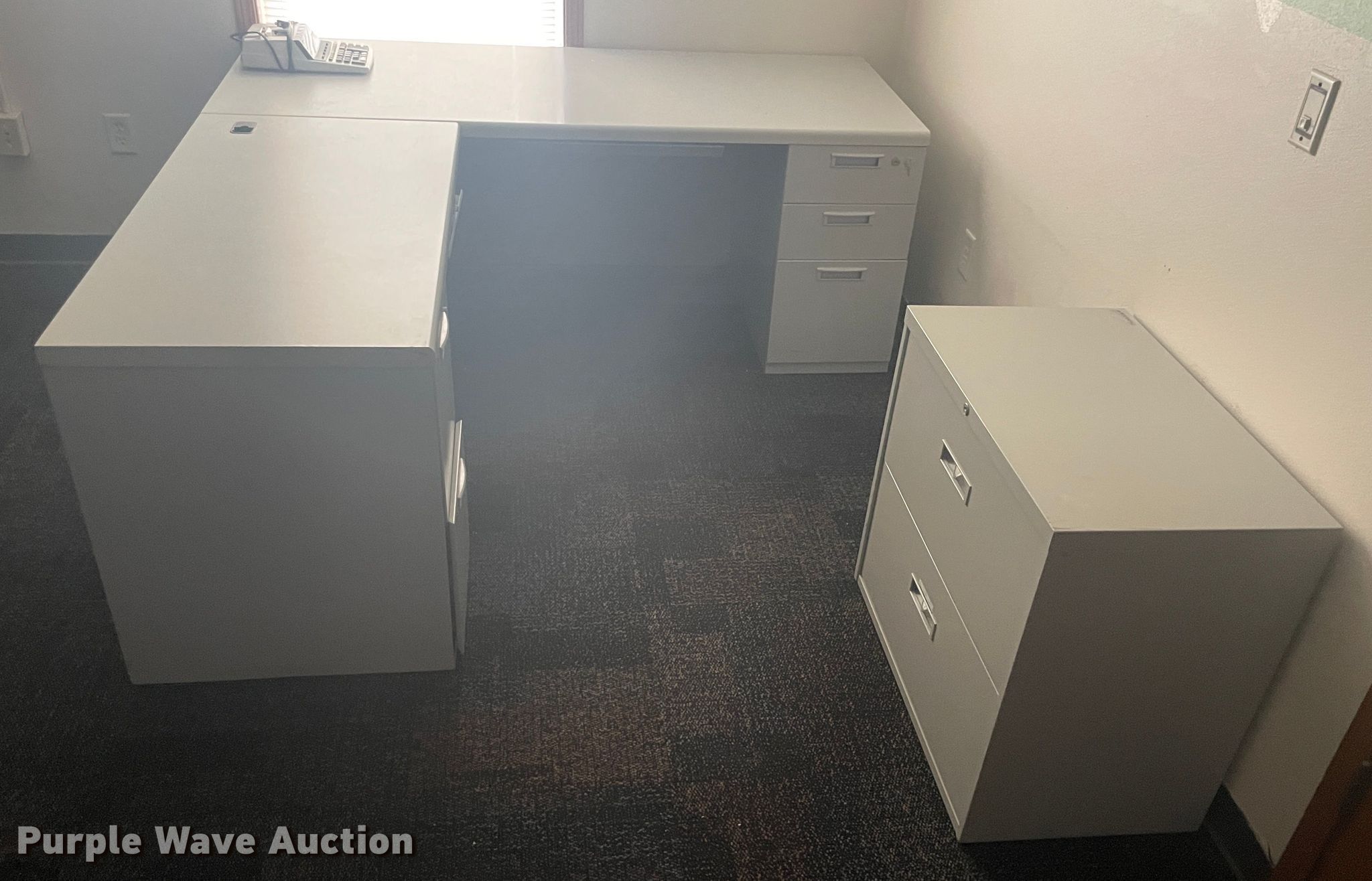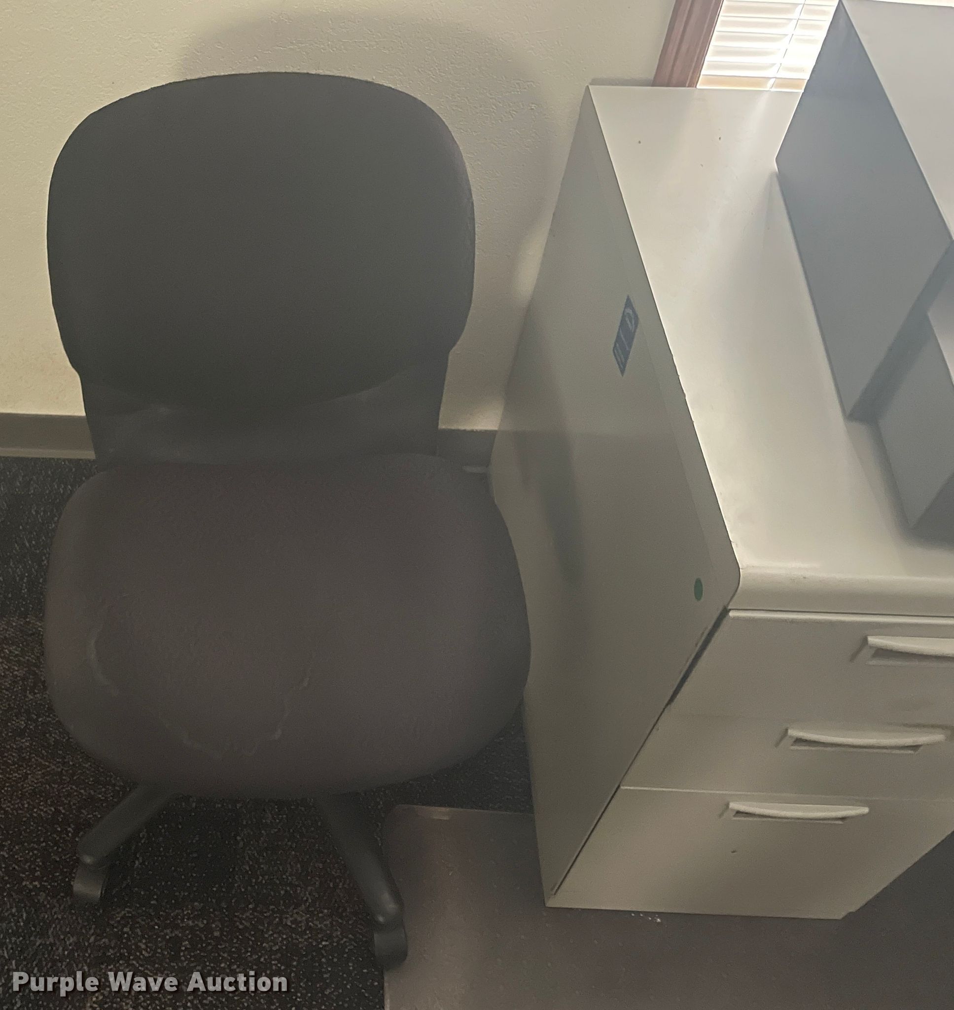 Purple Wave is selling a used Furniture in Kansas. This item is a Furniture with the following: (3) corner desks, (2) chairs, Table, Two drawer file cabinet