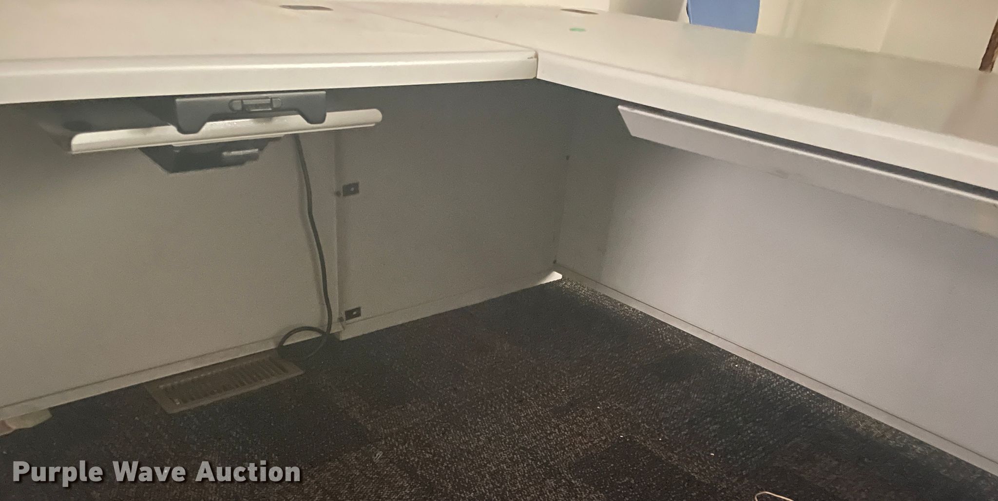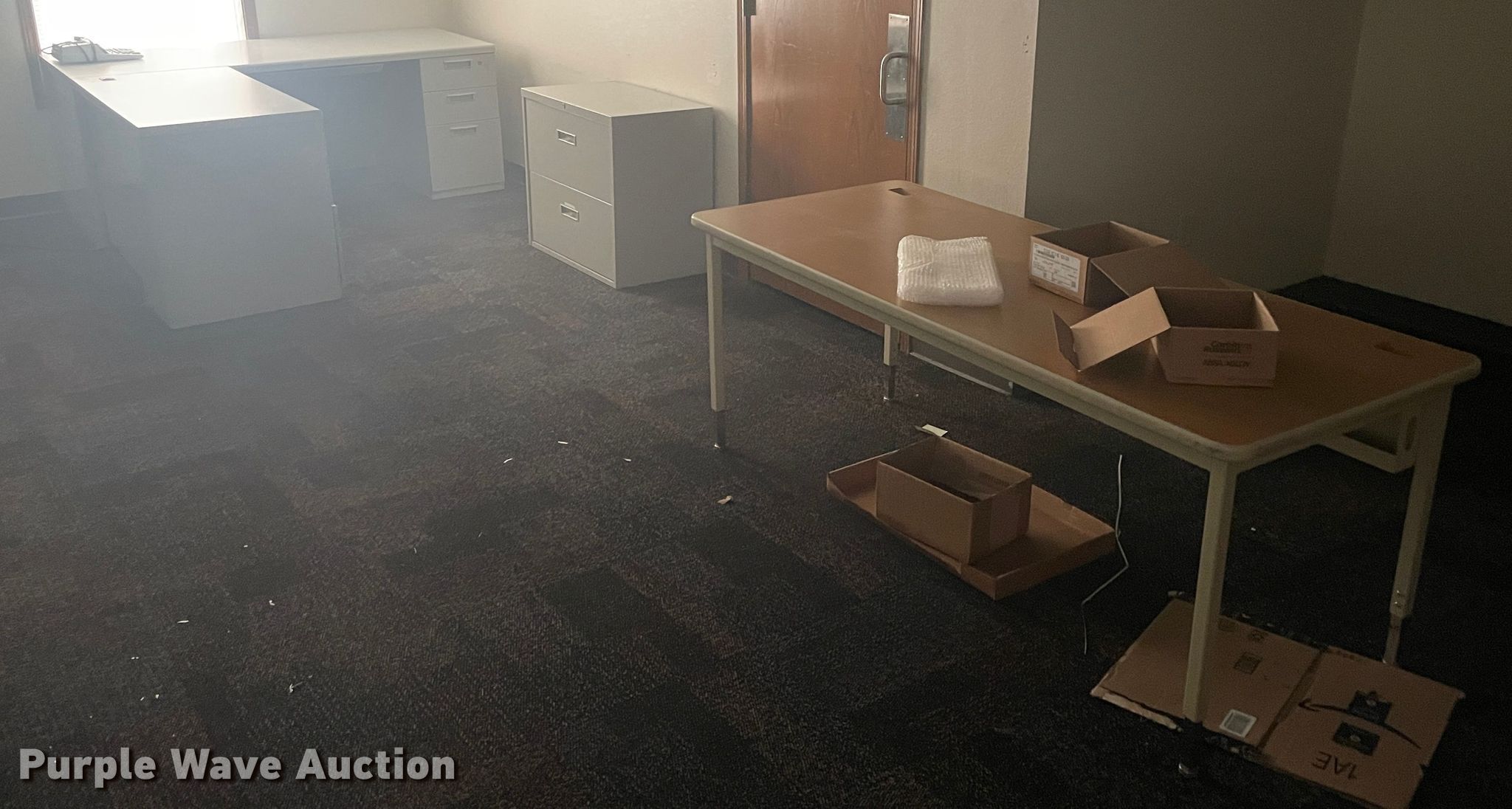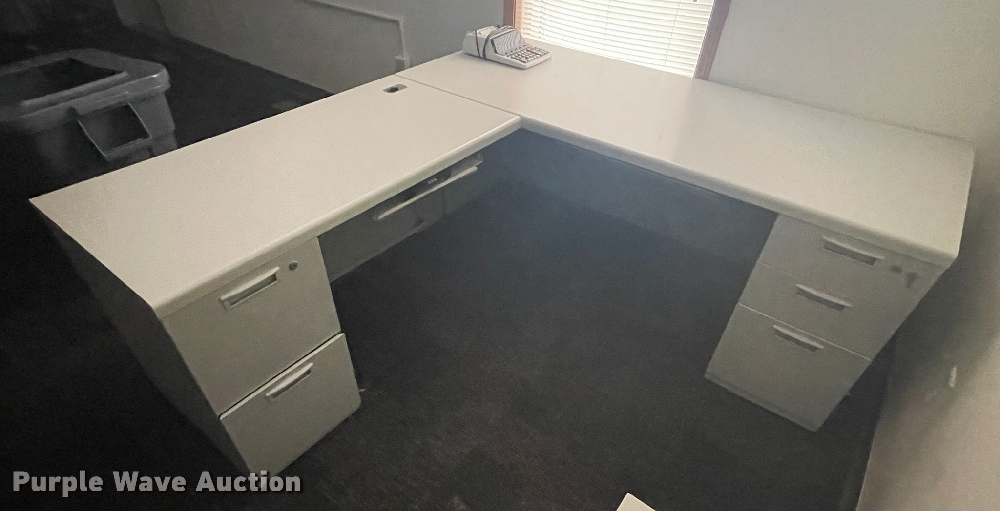 Purple Wave is selling a used Furniture in Kansas. This item is a Furniture with the following: (3) corner desks, (2) chairs, Table, Two drawer file cabinet