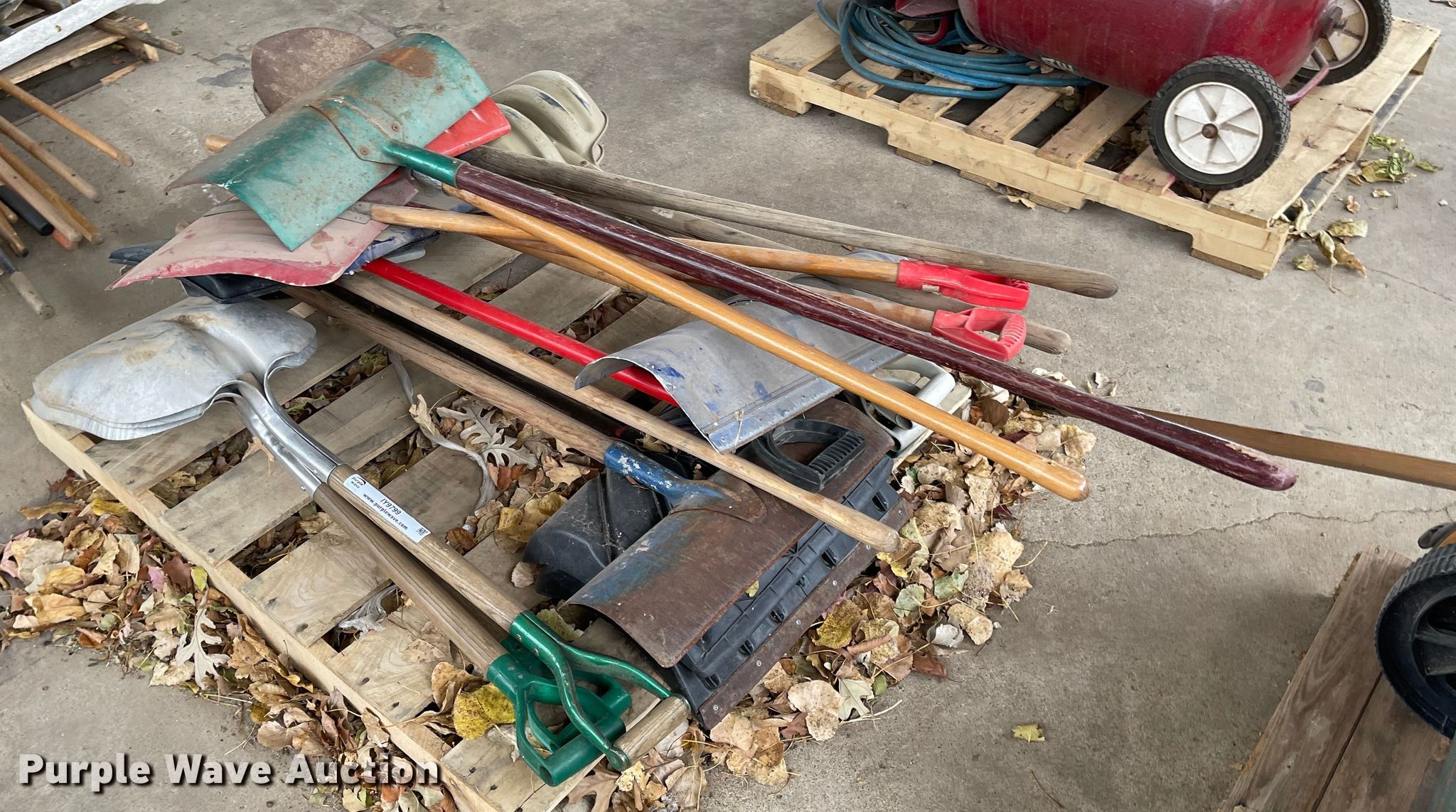 Purple Wave is selling a used Tools in Kansas. This item is a Approximately 18 shovels with the following: Scoop shovels, Snow shovels, Spades