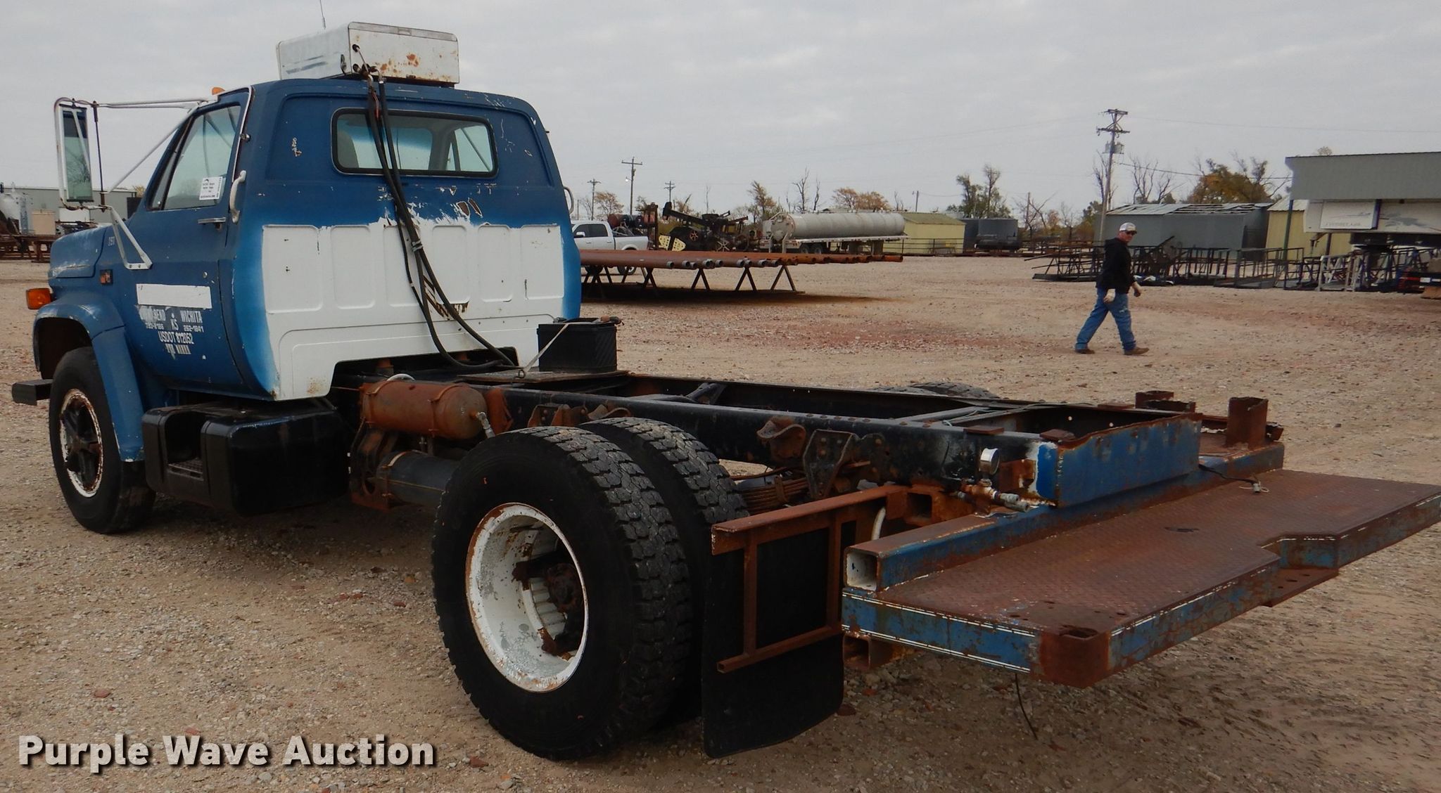 1980 GMC truck cab and chassis. Miles: 58,827 on odometer, VIN: T16DFAV591510. Engine Cylinders: 8, Fuel type: Diesel. Transmission Manual, Speed: 5, plus 2. Chassis Axles: Single, Suspension: Spring, Brakes: Hydraulic, Truck chassis: 131", GVWR: 23,160 lbs. Interior Heat. Operational Fuel tank: Dual. Tires Size: 9.00R20. Notes Windshield chipped or cracked. Kansas title. Herman L Loeb Oil. 5518 Oil Center Rd S. Great Bend, KS 67530