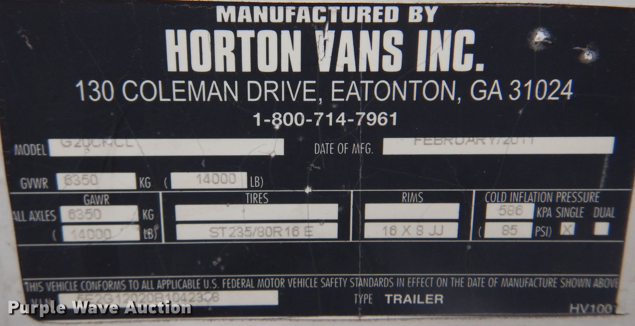 Purple Wave is selling a used Enclosed Cargo Trailer in Oklahoma. This item is a 2011 Horton Van's Inc enclosed cargo trailer with the following: VIN: 5E2G12020B1042388