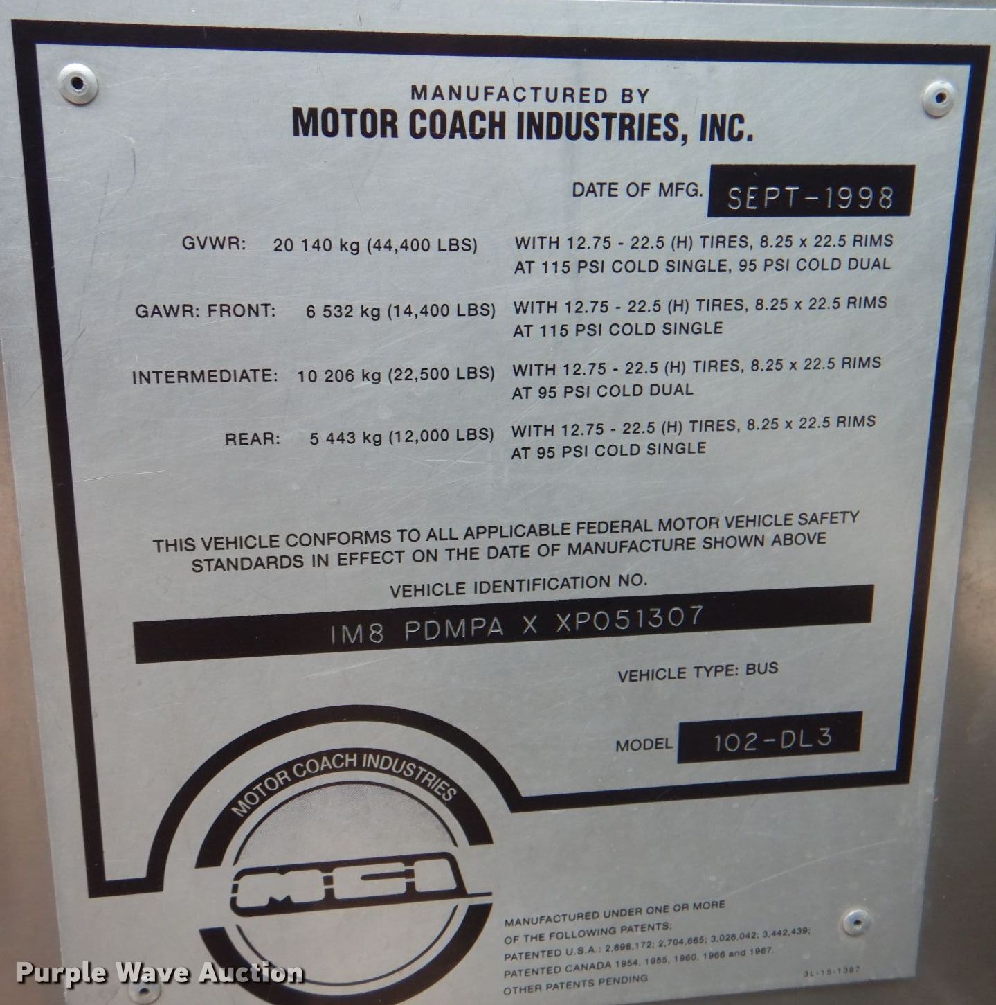 1999 Motor Coach Industries 102-DL3 coach bus. Miles: 19,944 on odometer, VIN: 1M8PDMPAXXP051307. Engine Detroit Diesel Series 60, Displacement: 12.7L, Cylinders: 6, Fuel type: Diesel. Transmission Automatic. Chassis Axles: Tandem, Tag axle, Suspension: Air, Brakes: Air, GVWR: 44,000 lbs. Interior AC, Heat, Heated mirrors, Cruise control, Electric passenger sliding door, Passengers: 57. Tires Size: 315/80R22.5. Nebraska title. Seller is a Nebraska licensed motor vehicle dealer. Title will be assigned and distributed by the dealer. Please contact the seller for distribution questions. Central Nebraska Used Auto Sales. 1212 Rd L. York, NE 68467