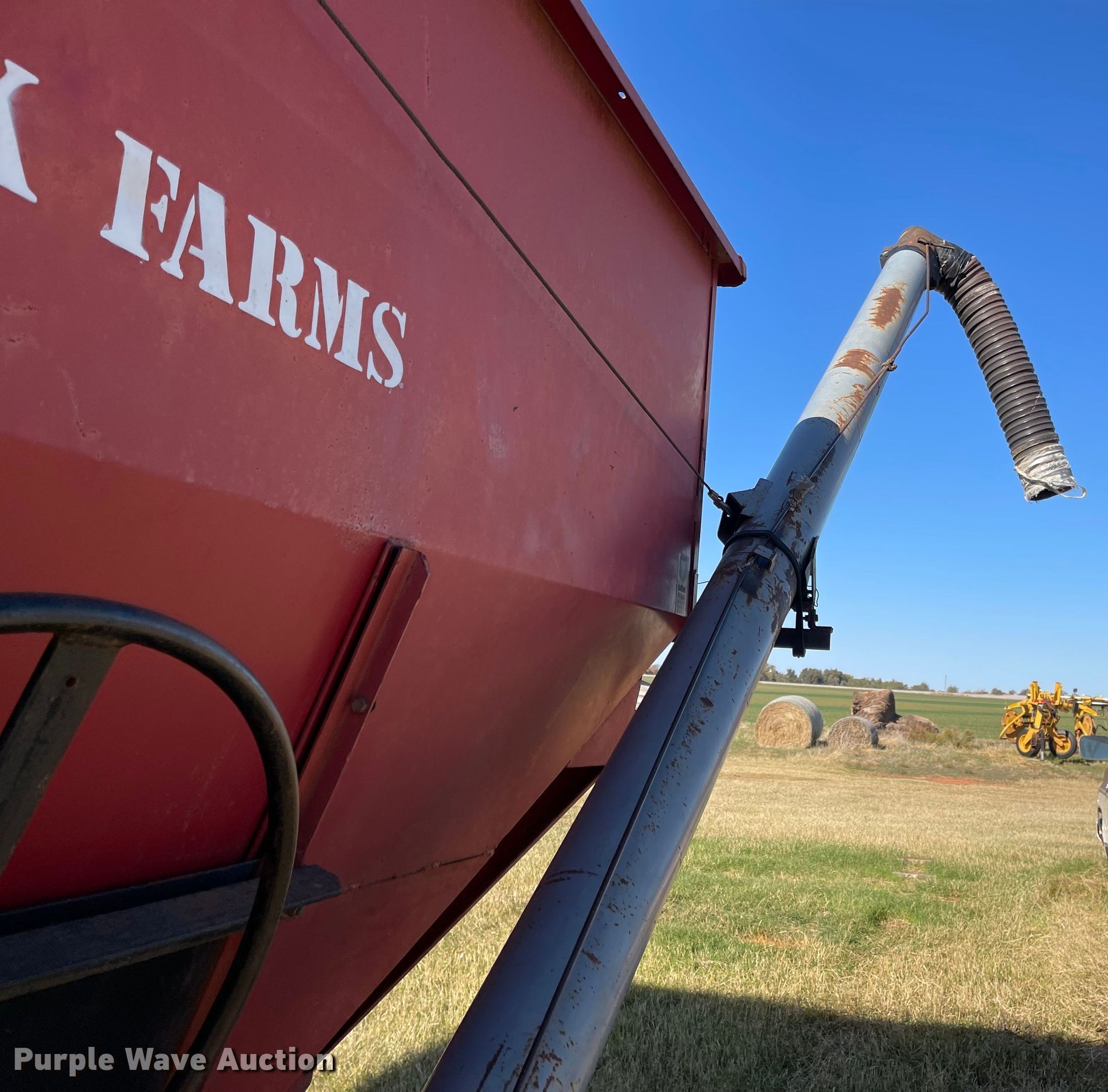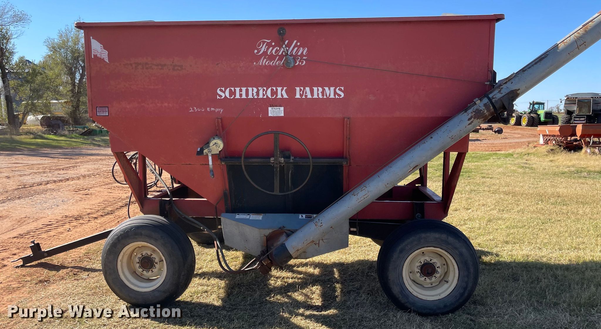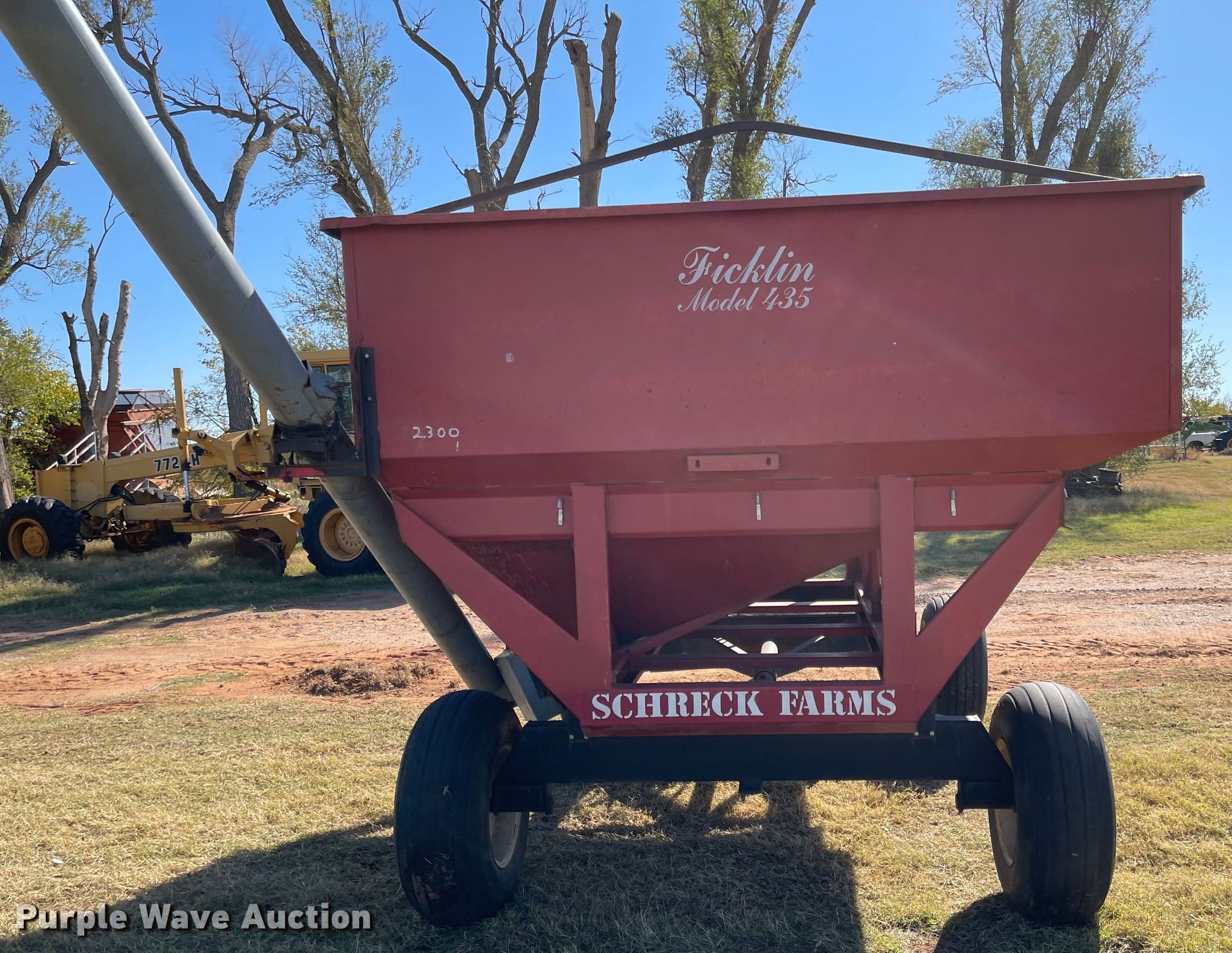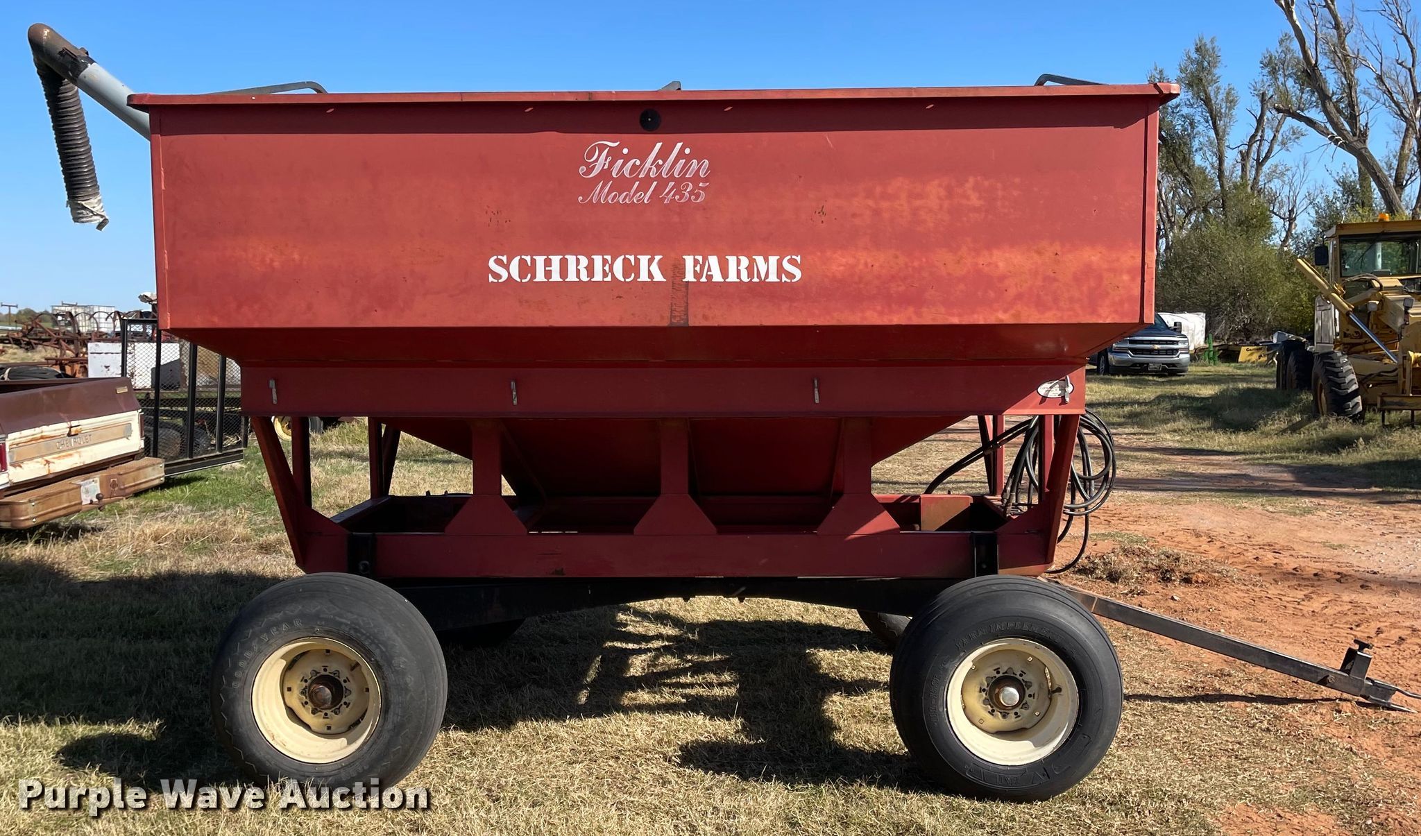 Purple Wave is selling a used Grain Cart or Gravity Wagon in Oklahoma. This item is a Ficklin 435 gravity wagon with the following: Capacity: 400 bushels, Auger diameter: 6", Shut-off gate: Manual