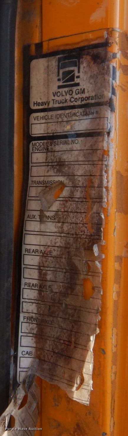 1994 White GMC WG dump truck. Miles: 247,732 on odometer, VIN: 4V2JCBME7RR829103, Unit #: 50-71. Engine Cummins L10, Serial: 34709020, Cylinders: 6, Fuel type: Diesel, HP: 300. Transmission Eaton Fuller, Manual. Chassis Axles: Tandem, Differential lock: Inter-axle, Suspension: Spring over walking beam, Brakes: Air, PTO, Wheelbase: 151". Interior Heat. Operational Dump bed Diversified Metal Fabricaton ROTO 180, 12' L x 8' W, Side board height: 43", Bed type: Steel, Ram: Single , End gate: Manual. Tires Size: 11R22.5. Missouri title. Capital Railroad Contracting Inc... 8500 E Trade Center Dr. Columbia, MO 65201
