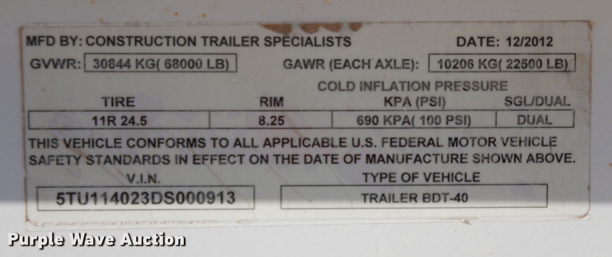 Purple Wave is selling a used Bottom Dump Trailer in Texas. This item is a 2013 CTS BDT-40 bottom dump trailer with the following: VIN: 5TU114023DS000913, Unit #: 110