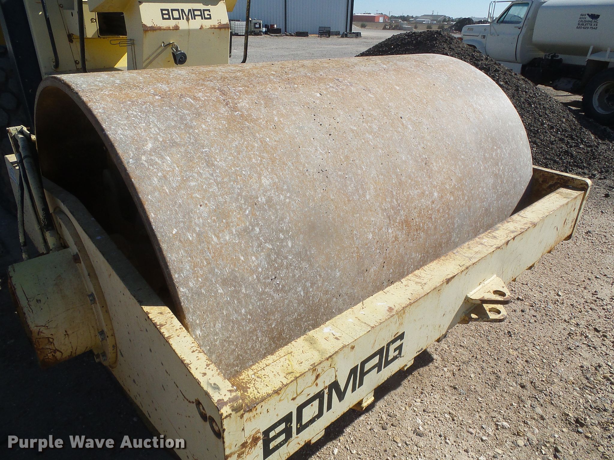 1996 Bomag BW213DH-2 single drum vibratory roller. Hours: 5,464 on meter, Serial: 109400890125T. Engine Deutz, Cylinders: 6, Fuel type: Diesel. Transmission Hydrostatic, Two speed travel. Operators station OROPS. Operational Drum: Smooth, Vibratory system: Single, Front drum Width: 82", Diameter: 59", Drum scrapers: Front, Rear. Tires Size: 23.1-26. S&S Rock Crushing Inc.. 1355 Rd 185. Sublette, KS 67877