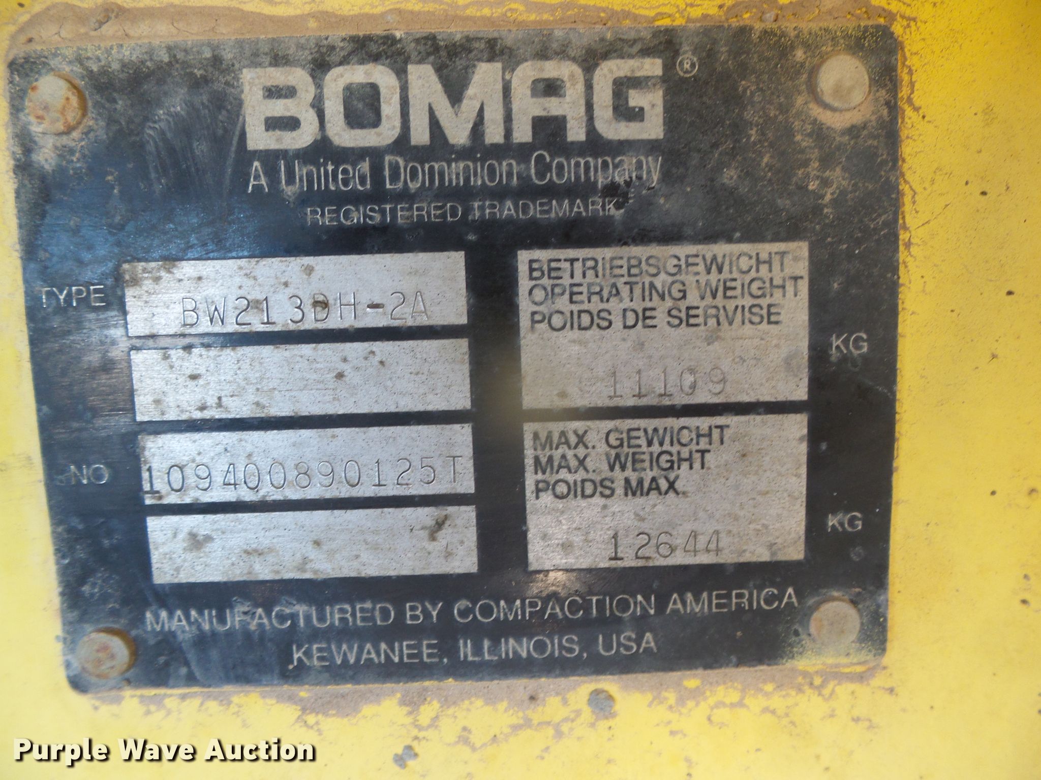 Purple Wave is selling a used Single Drum Roller Compactor in Kansas. This item is a 1996 Bomag BW213DH-2 single drum vibratory roller with the following: Hours: 5,464 on meter, Serial: 109400890125T
