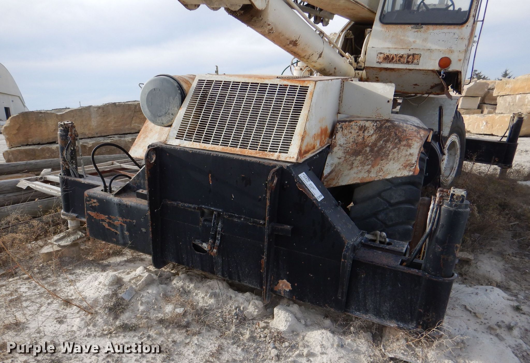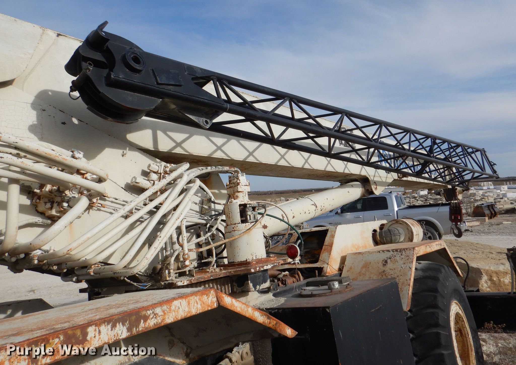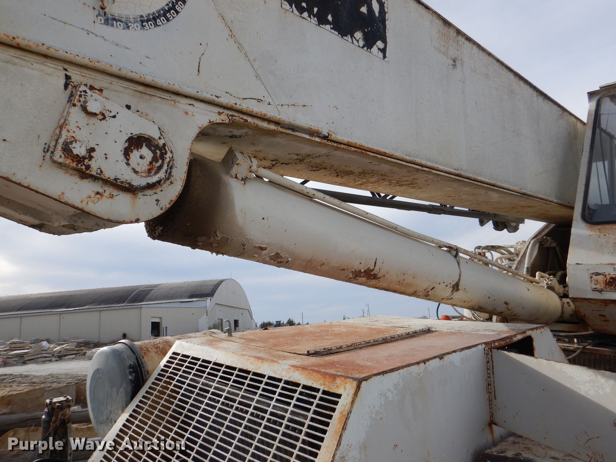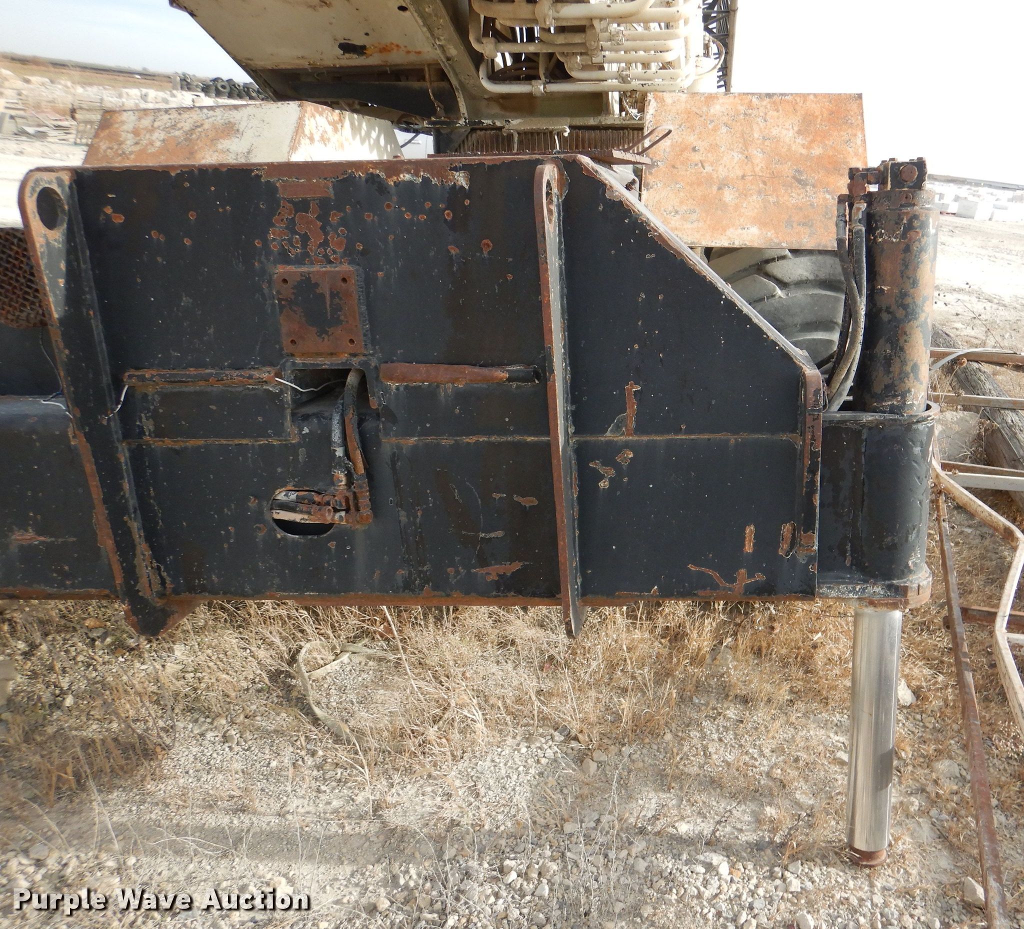 P&H Omega crane. Hours: 1,867 on meter. Engine Detroit Diesel, Cylinders: 4, Fuel type: Diesel. Transmission Powershift, 3F - 3R. Operators station Enclosed cab, Crane controls: Stick. Operational Boom Telescopic, Boom length: 80', Sections: 3, Maximum lift height: 85', Jib: 30', Stabilizers: 4, Boom controls In-cab, Winches: 2, Crane block Sheaves: 3. Tires Size: 20.5-25. Notes Glass cracked, Non-operational unit. US Stone Industries LLC. Herington, KS 67449
