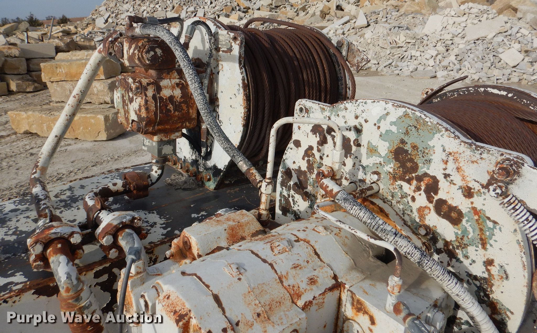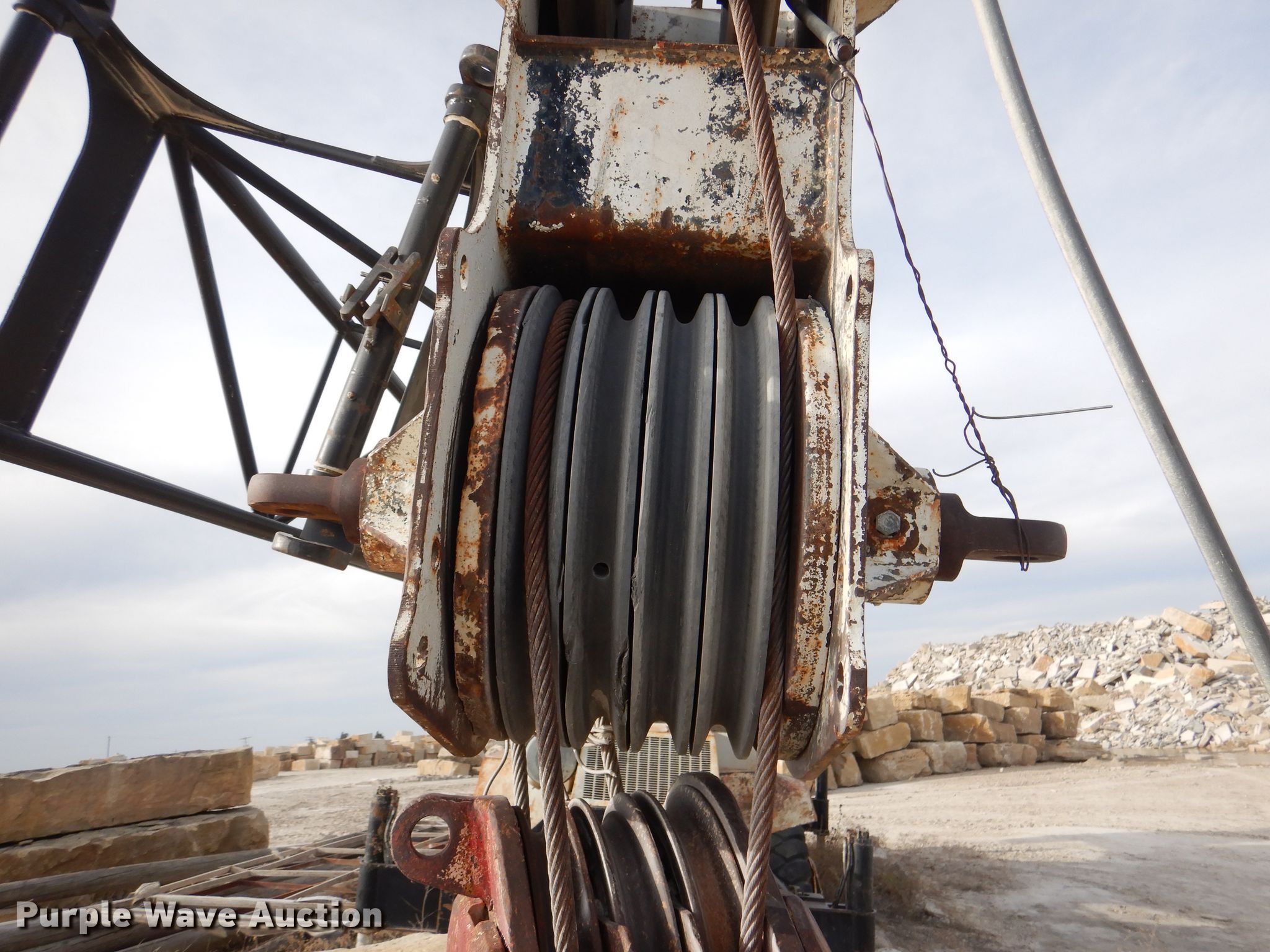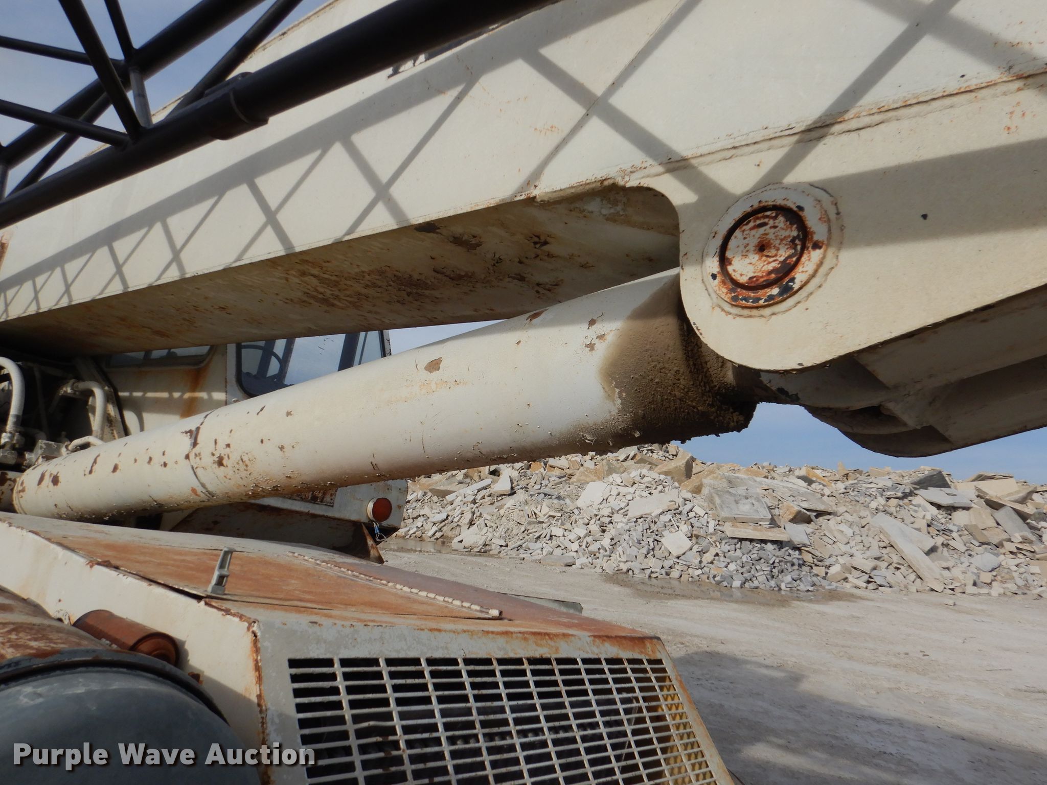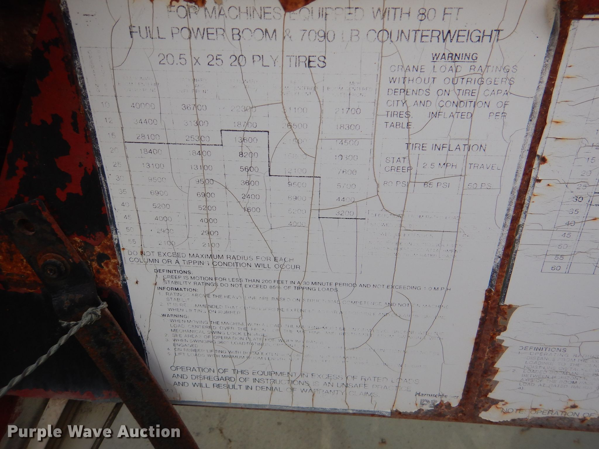 P&H Omega crane. Hours: 1,867 on meter. Engine Detroit Diesel, Cylinders: 4, Fuel type: Diesel. Transmission Powershift, 3F - 3R. Operators station Enclosed cab, Crane controls: Stick. Operational Boom Telescopic, Boom length: 80', Sections: 3, Maximum lift height: 85', Jib: 30', Stabilizers: 4, Boom controls In-cab, Winches: 2, Crane block Sheaves: 3. Tires Size: 20.5-25. Notes Glass cracked, Non-operational unit. US Stone Industries LLC. Herington, KS 67449
