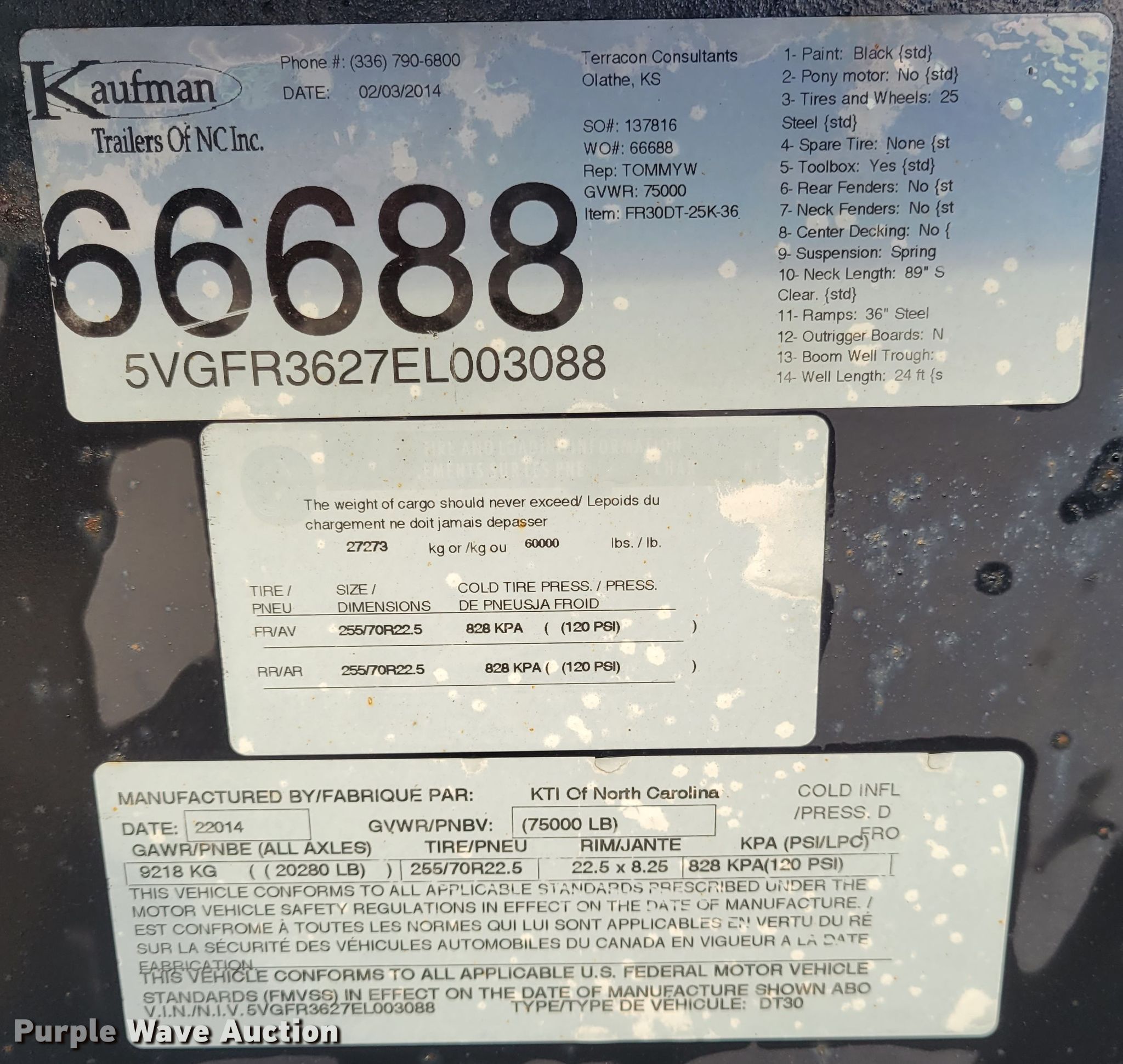 2014 Kaufman DT30 lowboy equipment trailer. VIN: 5VGFR3627EL003088. Dimensions Overall: 46' L x 102" W, Deck: 24' L x 102" W, Rear deck length: 103", Deck height: 26", Ramps: Manual Length: 30". Operational Deck type: Wood, Outriggers: Swing-out, Neck type: Detachable, Hydraulic controls: Manual. Chassis Suspension: Spring, Brakes: Air, Axles: Tandem, GVWR: 75,000 lbs, GAWR: 20,280 lbs. Tires Steel wheels, Size: 255/70R22.5. Ohio title. Terracon. 7770 W New York St. Indianapolis, IN 46214