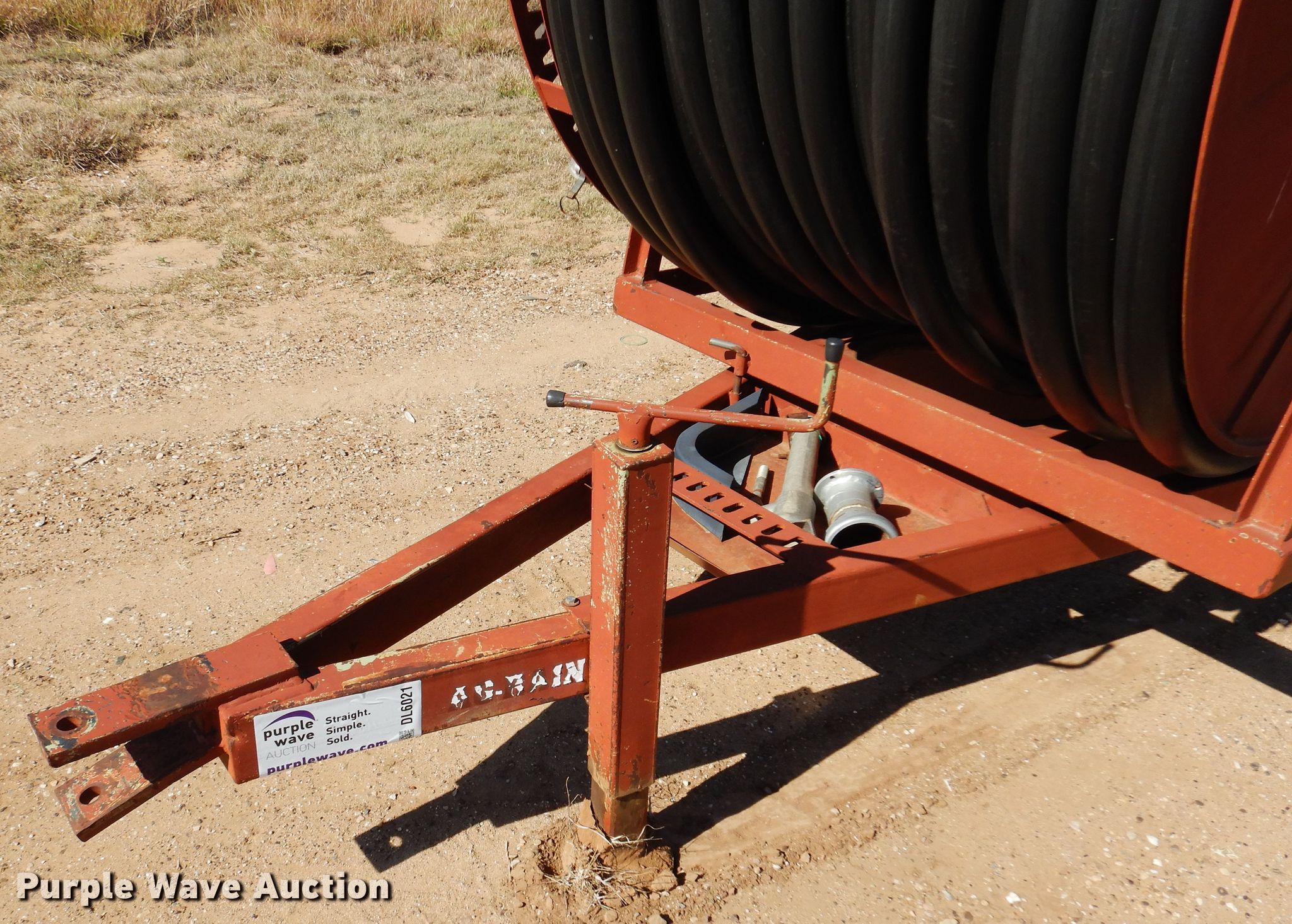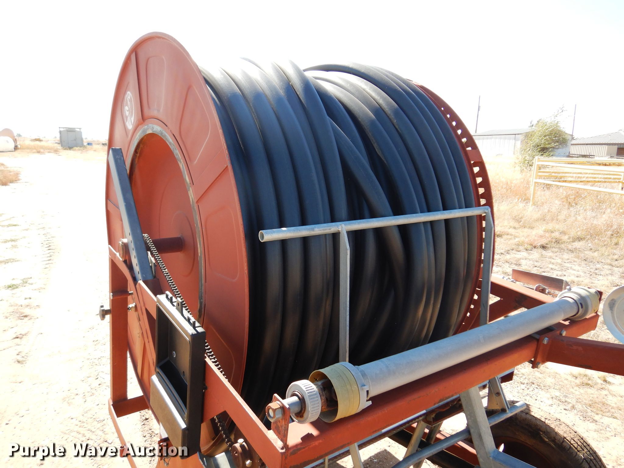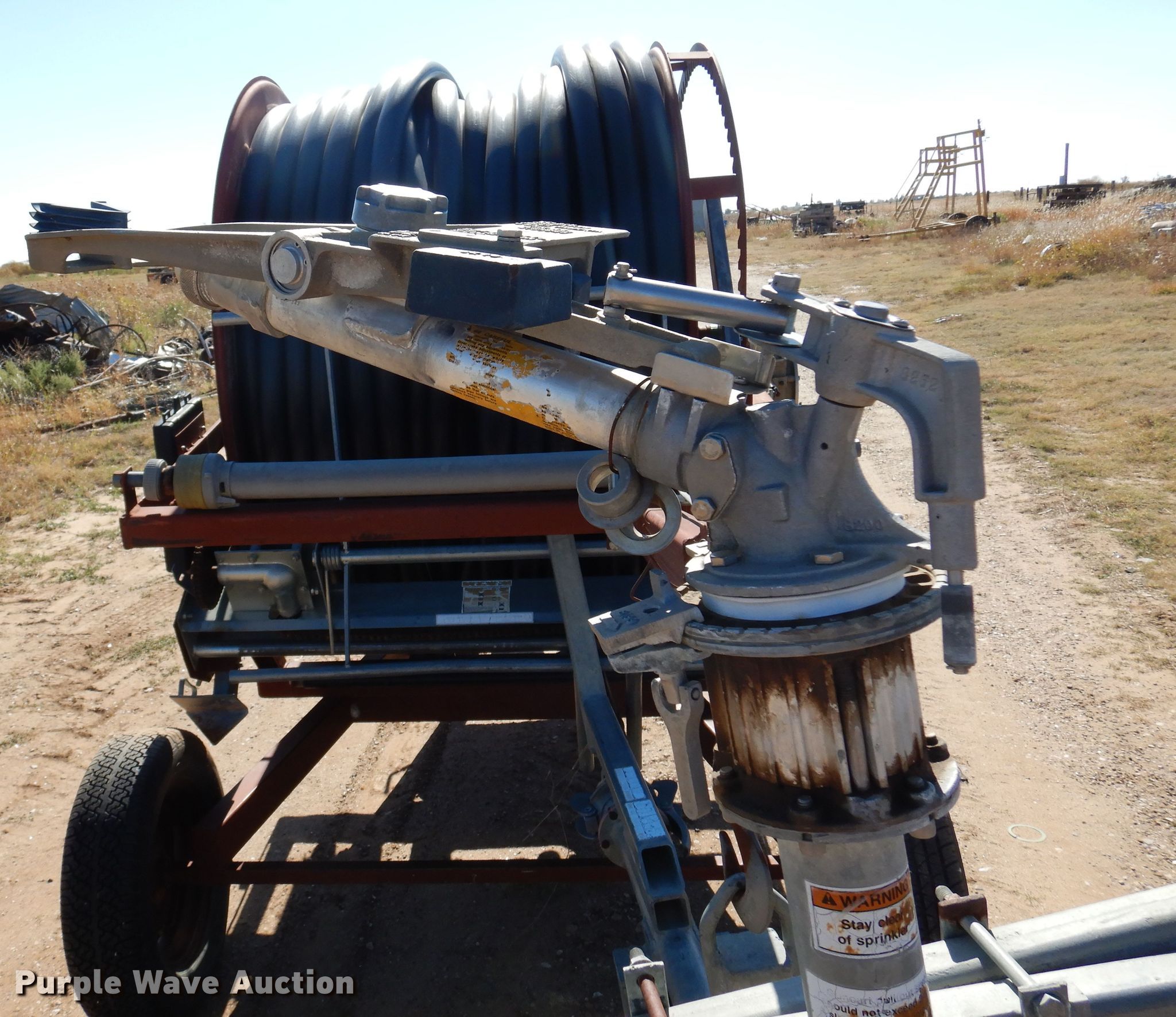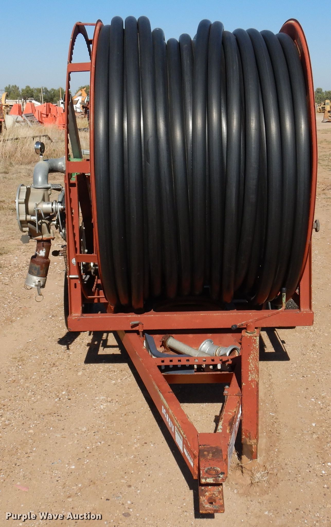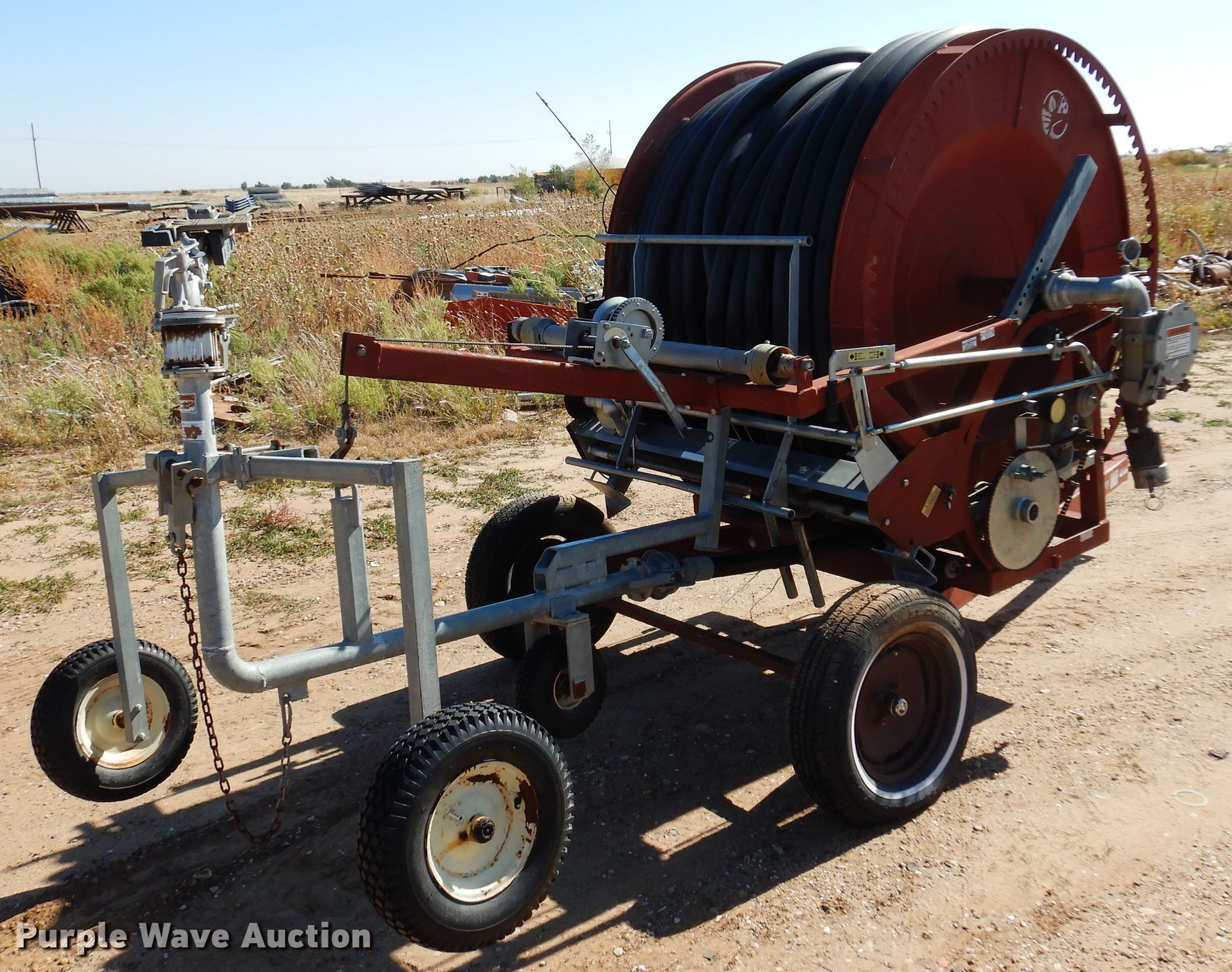 Purple Wave is selling a used Hose Reel in Oklahoma. This item is a Smith Irrigation Equipment water reel with sprinkler with the following: 2" hose, Big Gun sprinkler, Front tires: 185/70R14, Rear tires: 4.80-8, Serial: 330077