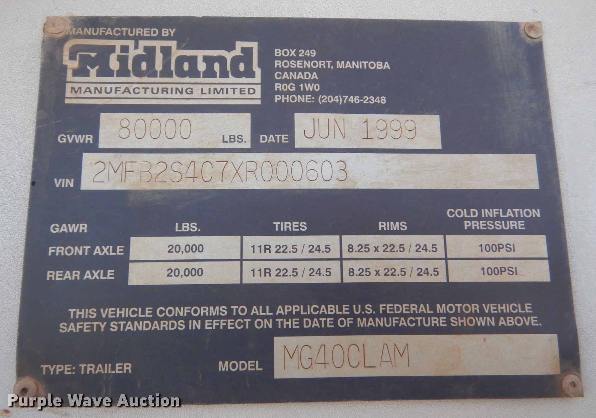1999 Midland MG4OCLAM bottom dump trailer. VIN: 2MFB2S4C7XR000603. Dimensions Overall: 40' L x 101" W. Operational Body type: Steel, Ram: Single, Clamshell gate: Air operated, Rear push block, Roll tarp. Chassis Landing gear: Dual, Suspension: Spring, Brakes: Air, Axles: Tandem, GVWR: 80,000 lbs. Tires Steel wheels, Size: 11R24.5. Oklahoma title. HW 270 S 14305 N, OK-23. Beaver, OK 73932