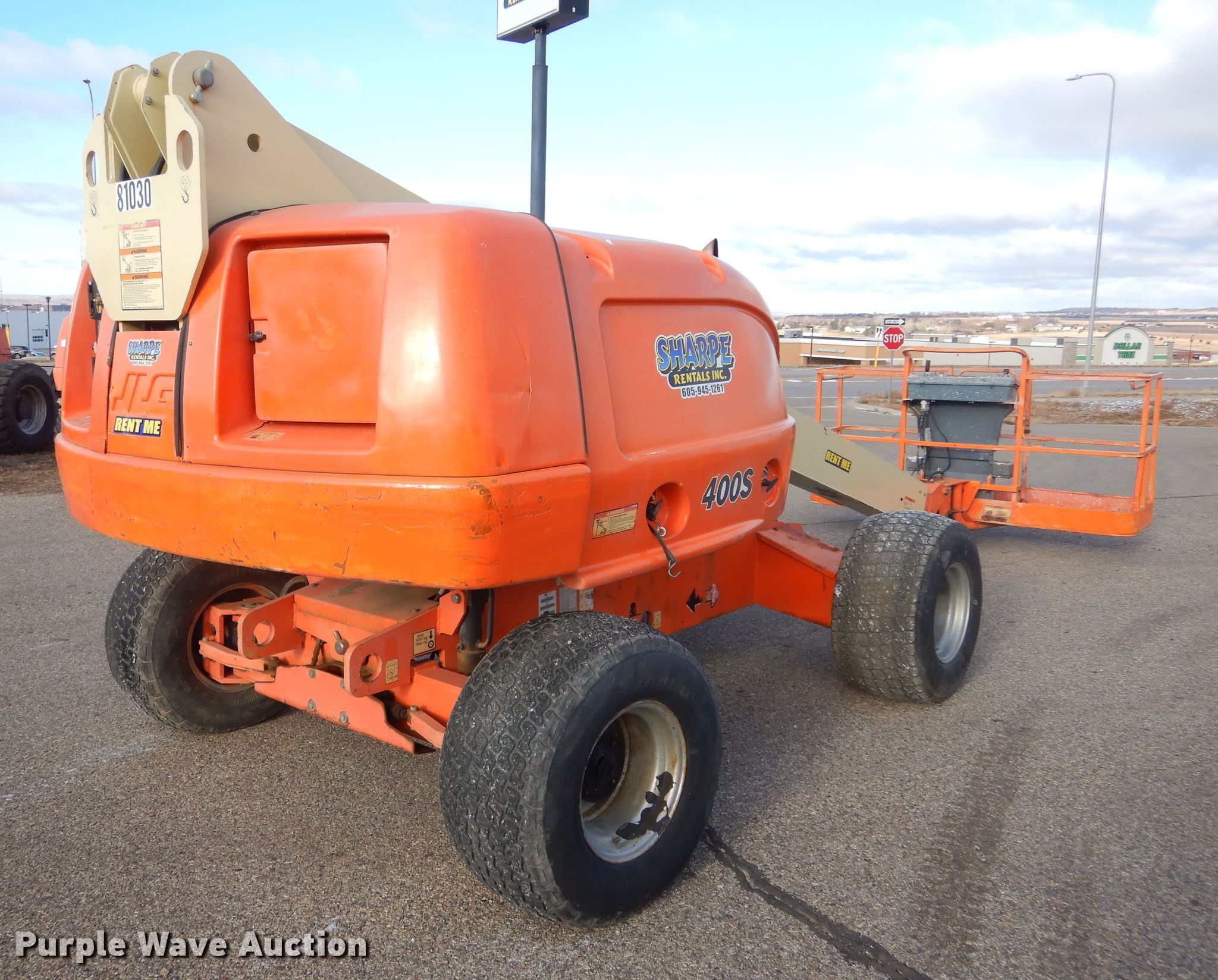 2001 JLG 400S boom lift. Hours: 4,741 on meter, Serial: 139699-0300055573. Engine Deutz, Cylinders: 3, Fuel type: Diesel. Chassis Four wheel drive. Operational Rough terrain, Maximum lift capacity: 500 lbs, Maximum reach length: 34', Maximum lift height: 40', Hydraulic leveling, Platform: 96" L x 30" W, AC power outlet, Controls: Platform, Ground, Platform rotation: Hydraulic. Tires Tire size: 33x16LL-16.1. Sharpe Rentals, Inc.. 1908 N Garfield Ave. Pierre, SD 57501