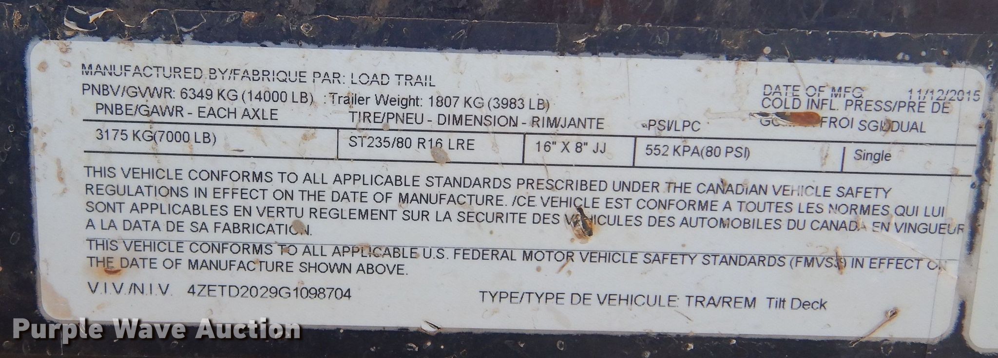 Purple Wave is selling a used Car or Utility Trailer in South Dakota. This item is a 2016 Load Trail tilt deck utility trailer with the following: VIN: 4ZETD2029G1098704