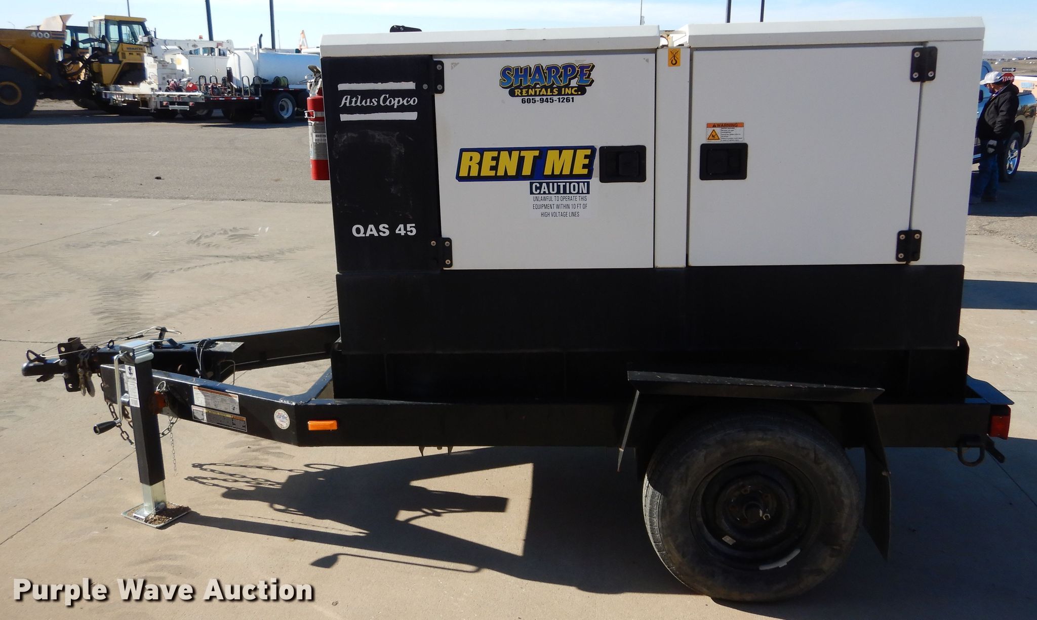2013 Atlas Copco QAS45 generator. Hours: 5,332 on meter, VIN: 16MPF0718DD068226, Serial: HCP102403, Unit #: 93023. Engine Kubota, Cylinders: 4, Fuel type: Diesel. Operational kVA: 45, kW: 41.3, Electric start. Trailer 12' L x 62" W, Suspension: Spring, Brakes: Hydraulic, Axles: Single, Tire size: ST205/75R14. Transfer of ownership documentation will be a bill of sale. Sharpe Rentals, Inc.. 1908 N Garfield Ave. Pierre, SD 57501