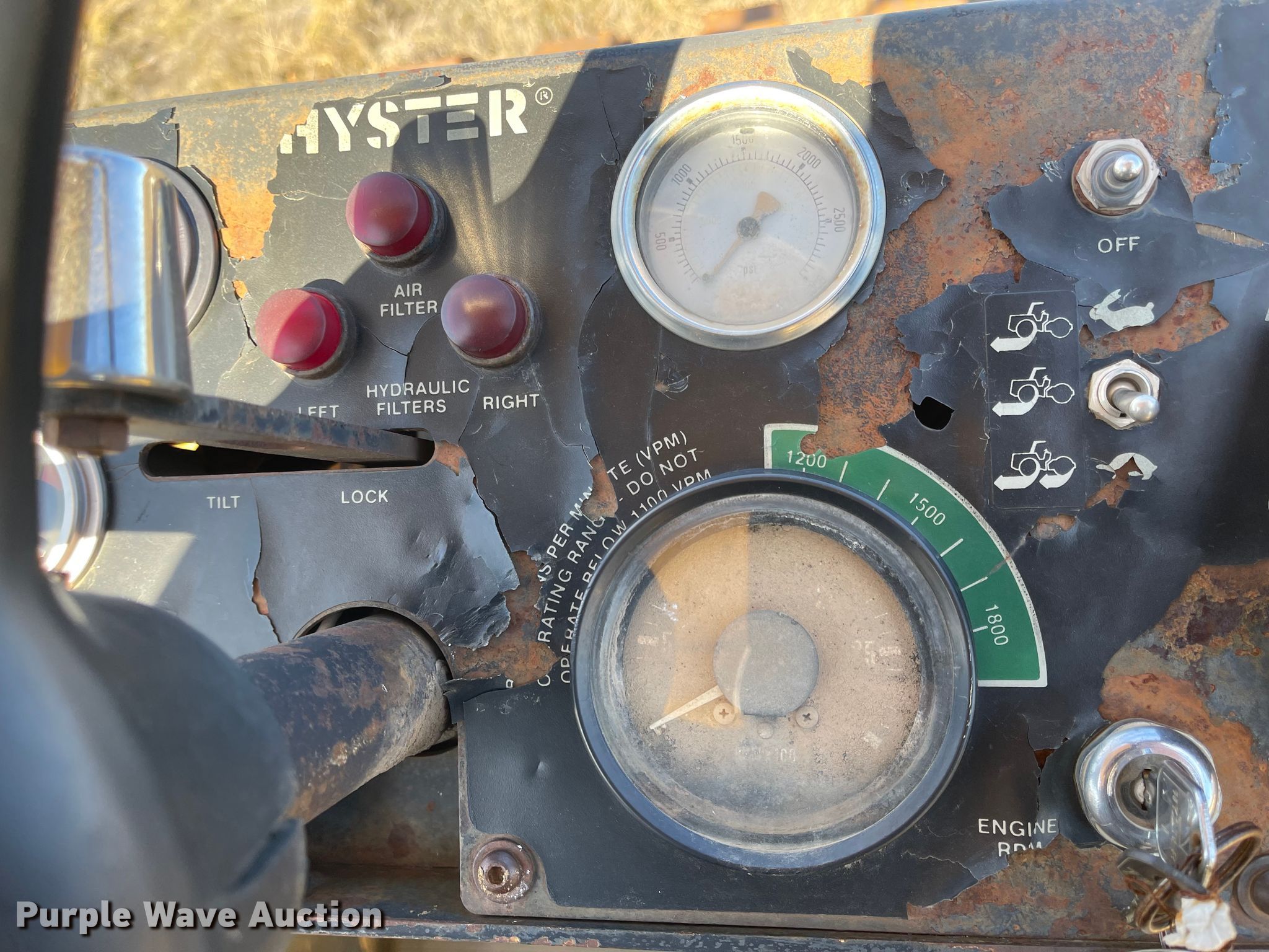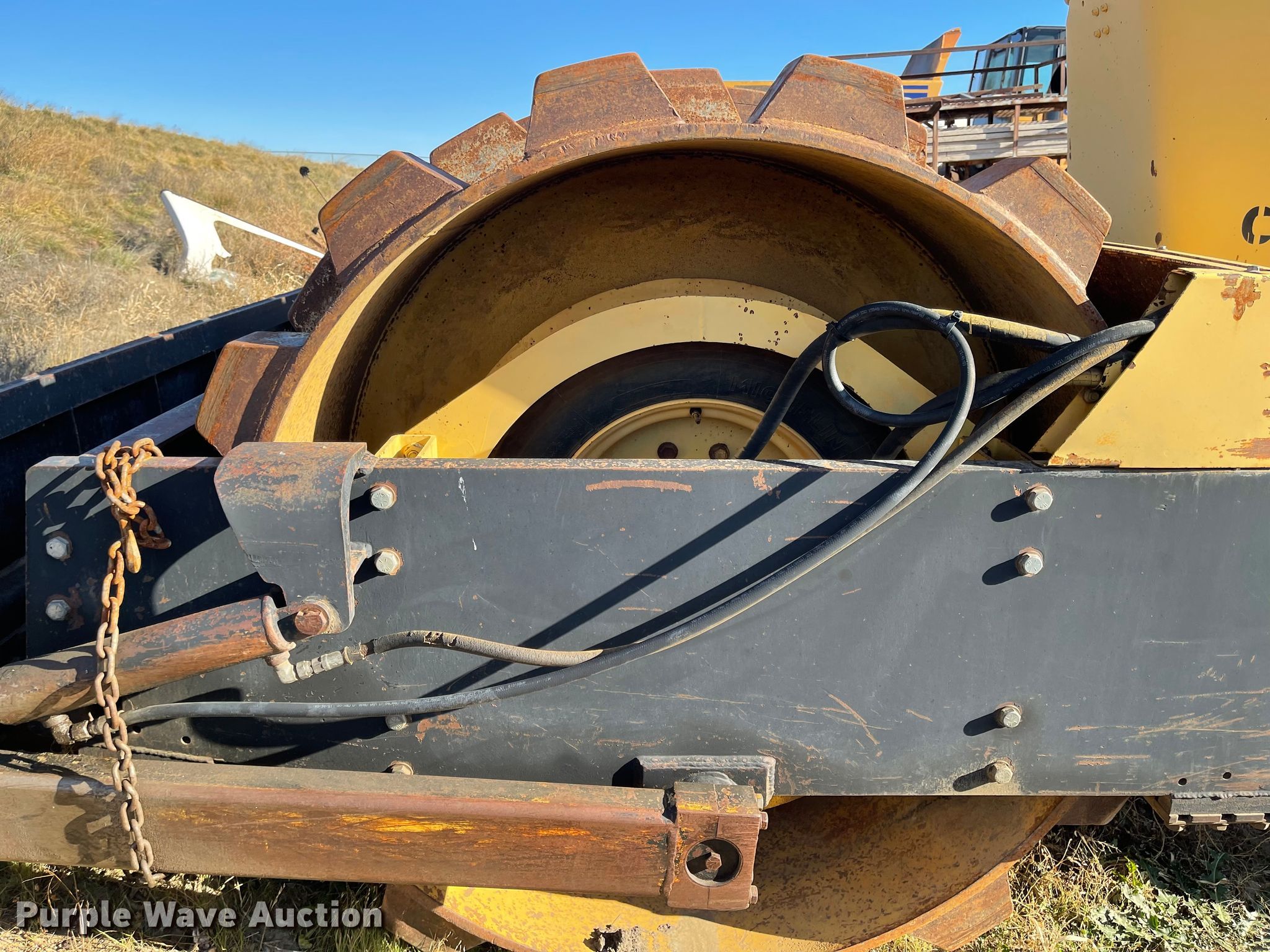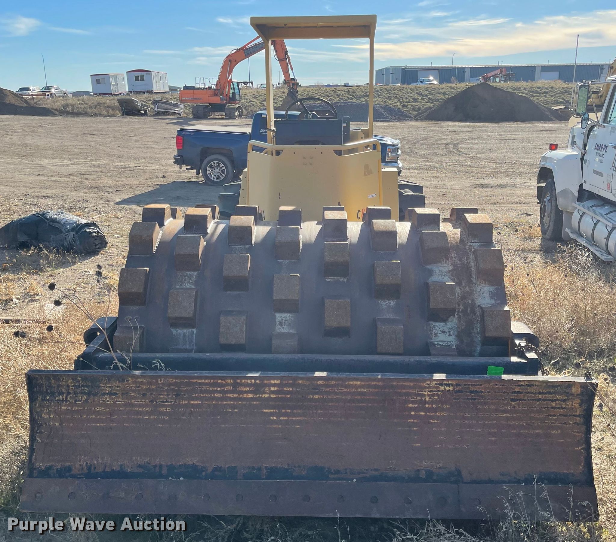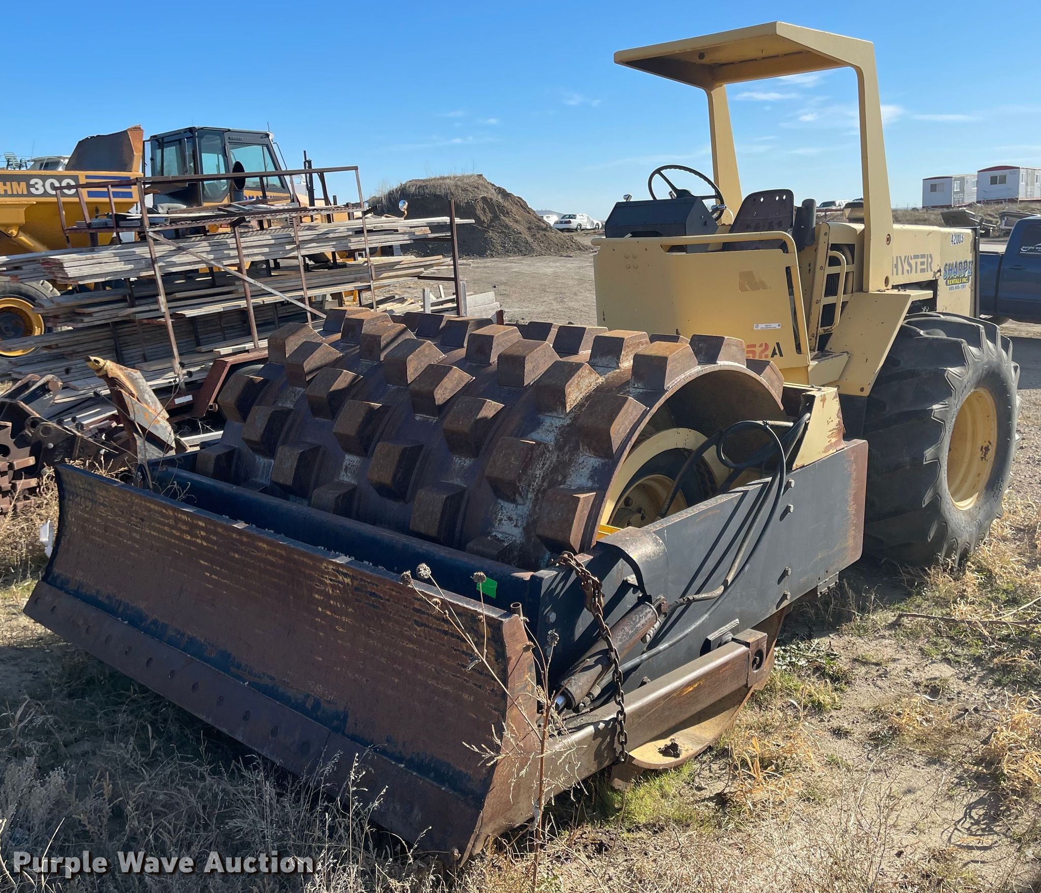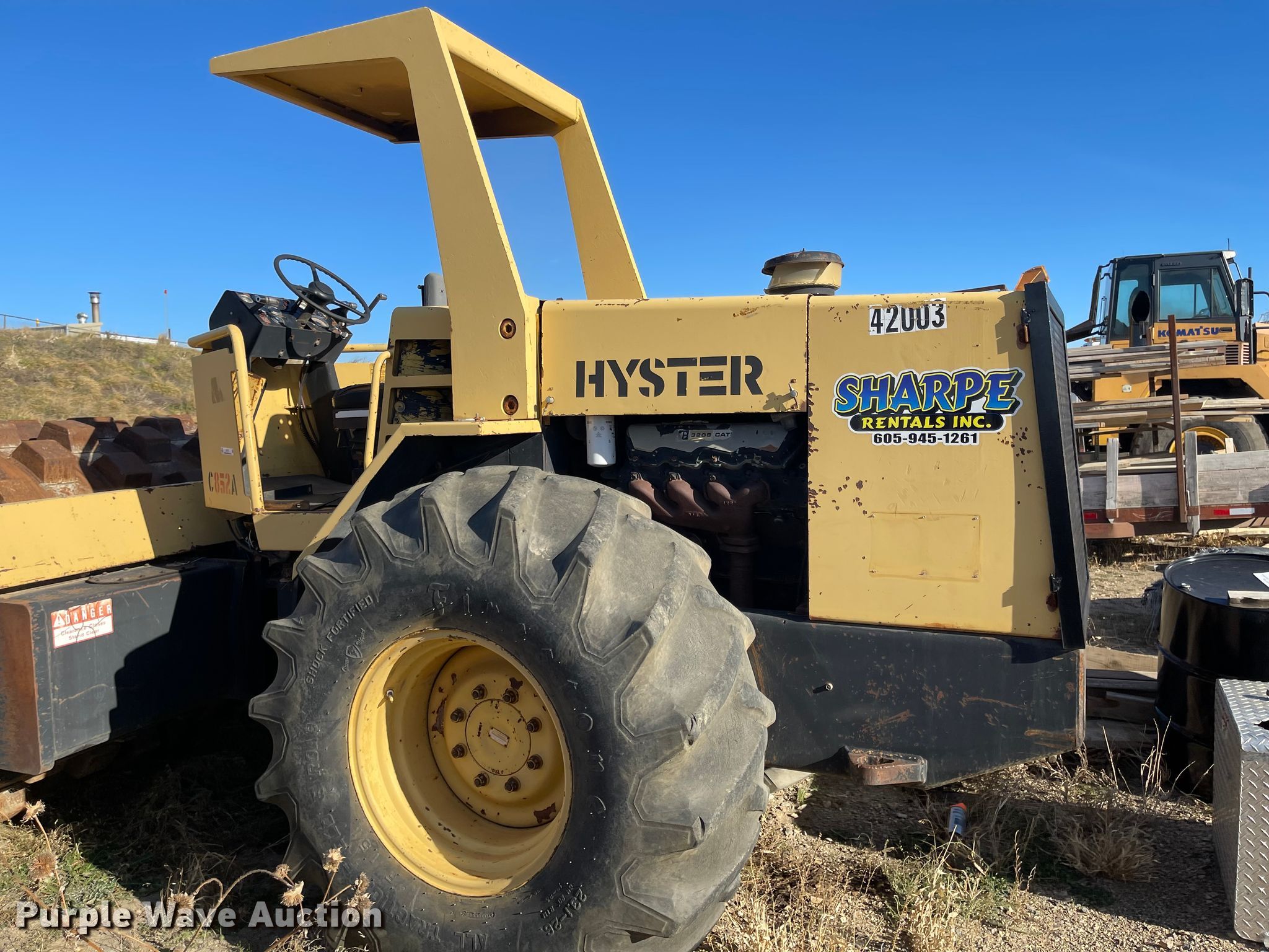 Hyster C852A single drum vibratory roller. Hours: 2,976 on meter, Serial: A188E5001G, Unit #: 42003. Engine Caterpillar 3208, Cylinders: 8, Fuel type: Diesel. Transmission Hydrostatic. Operators station OROPS. Operational Drum: Padfoot, Vibratory system: Single, Front drum Width: 84", Diameter: 59", Front blade width: 102". Tires Size: 23.1-26. Notes Non-operational unit. Sharpe Rentals, Inc.. 1908 N Garfield Ave. Pierre, SD 57501