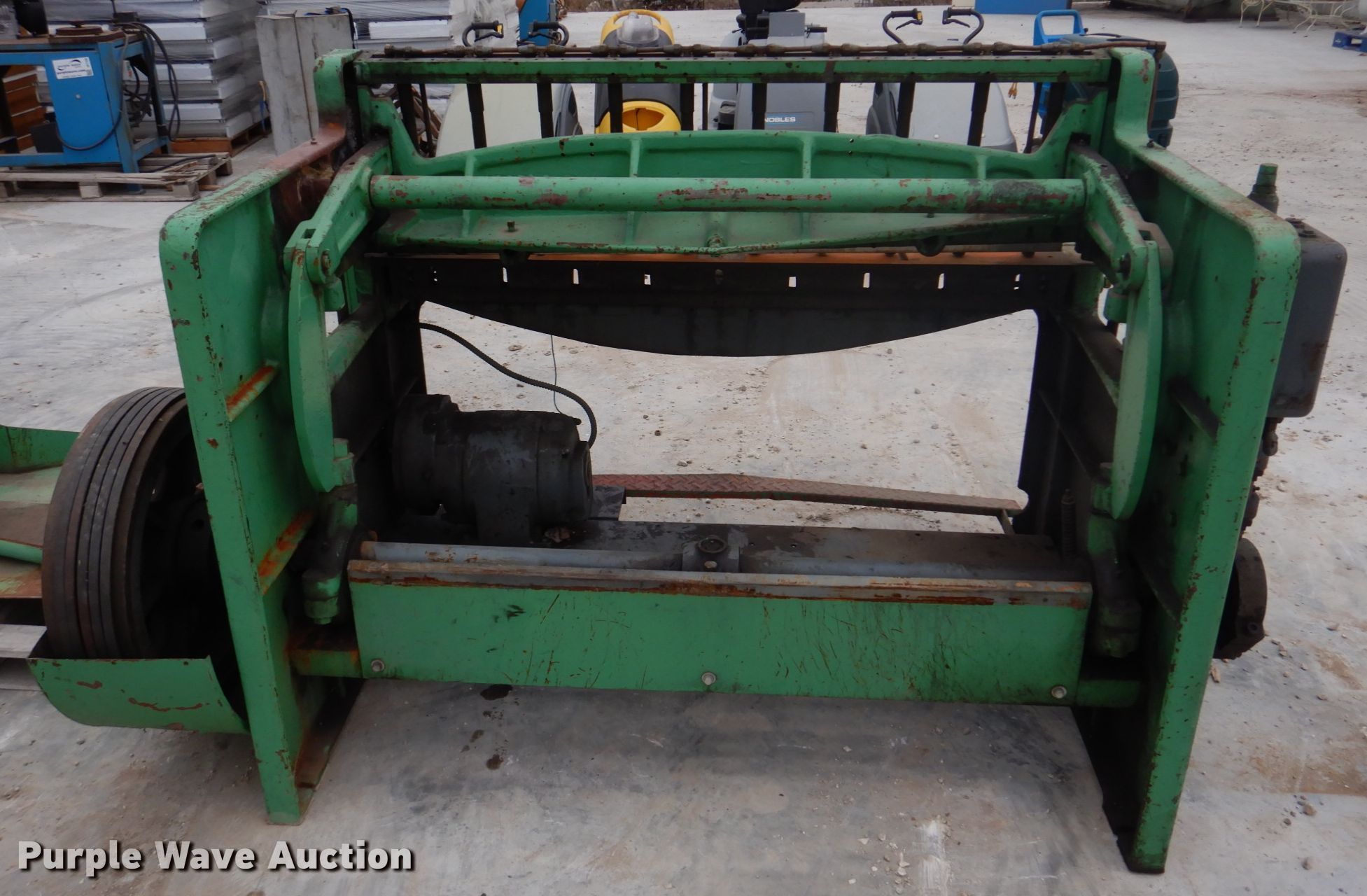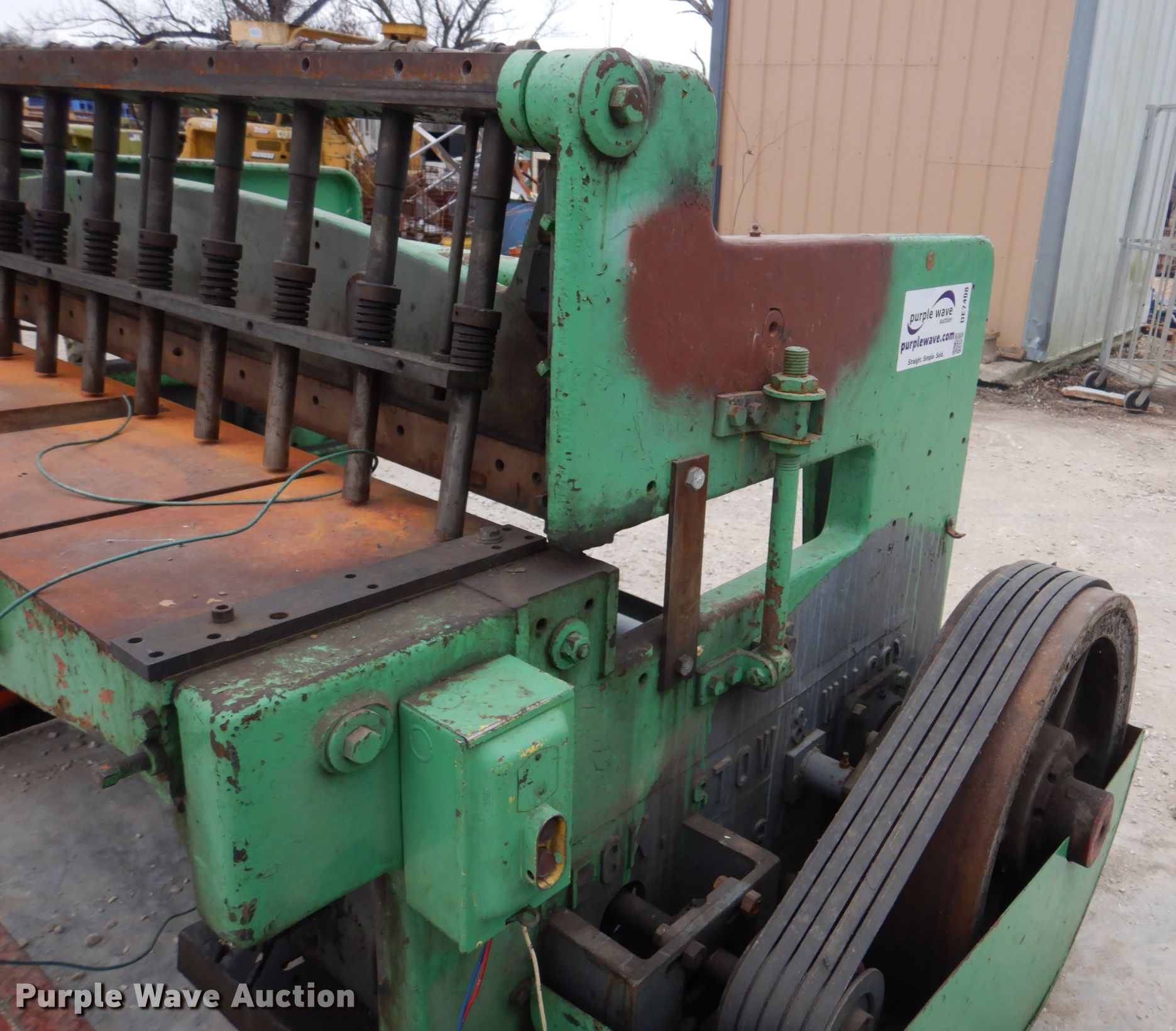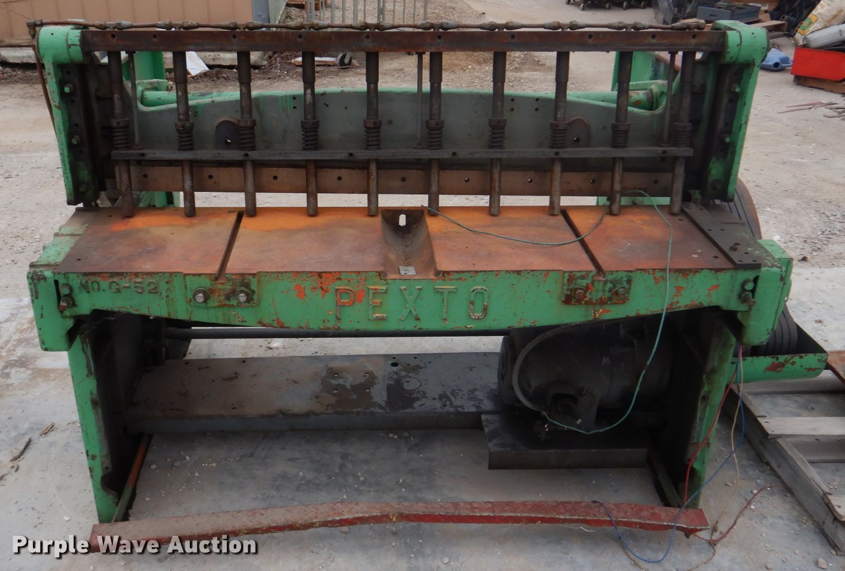 Purple Wave is selling a used Machine Shop Tools and Equip. in Missouri. This item is a Pexto G-52 sheet metal shear with the following: 53.5"W cutting capacity, (10) down force rods, Master electric motor, Three phase, Unknown operating condition, Serial: PG774