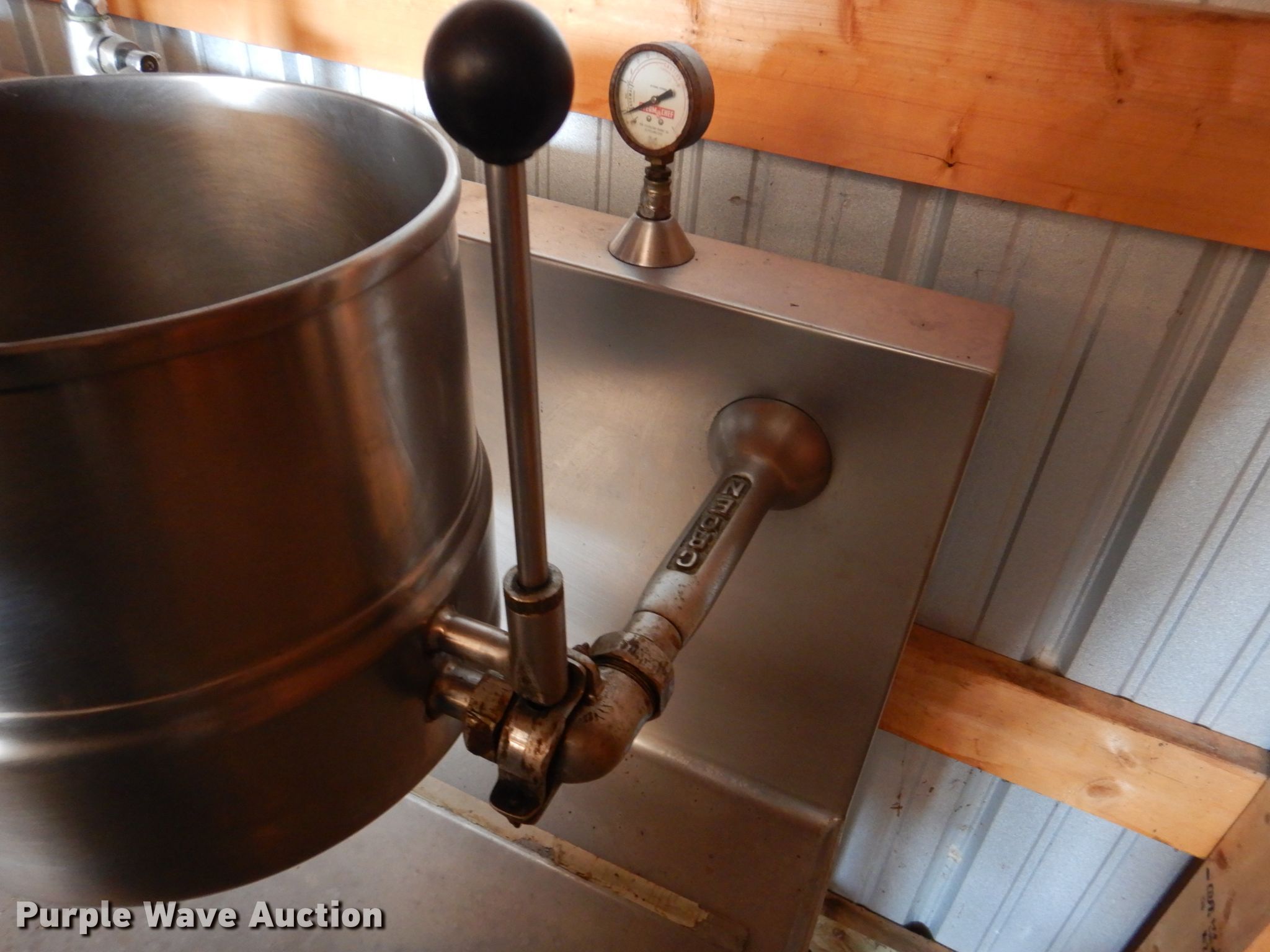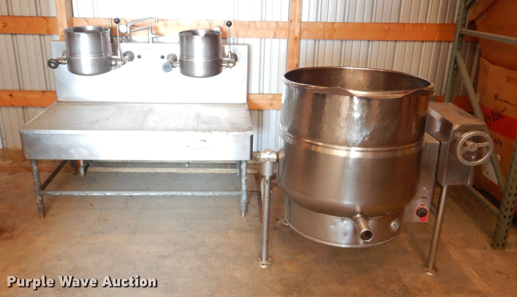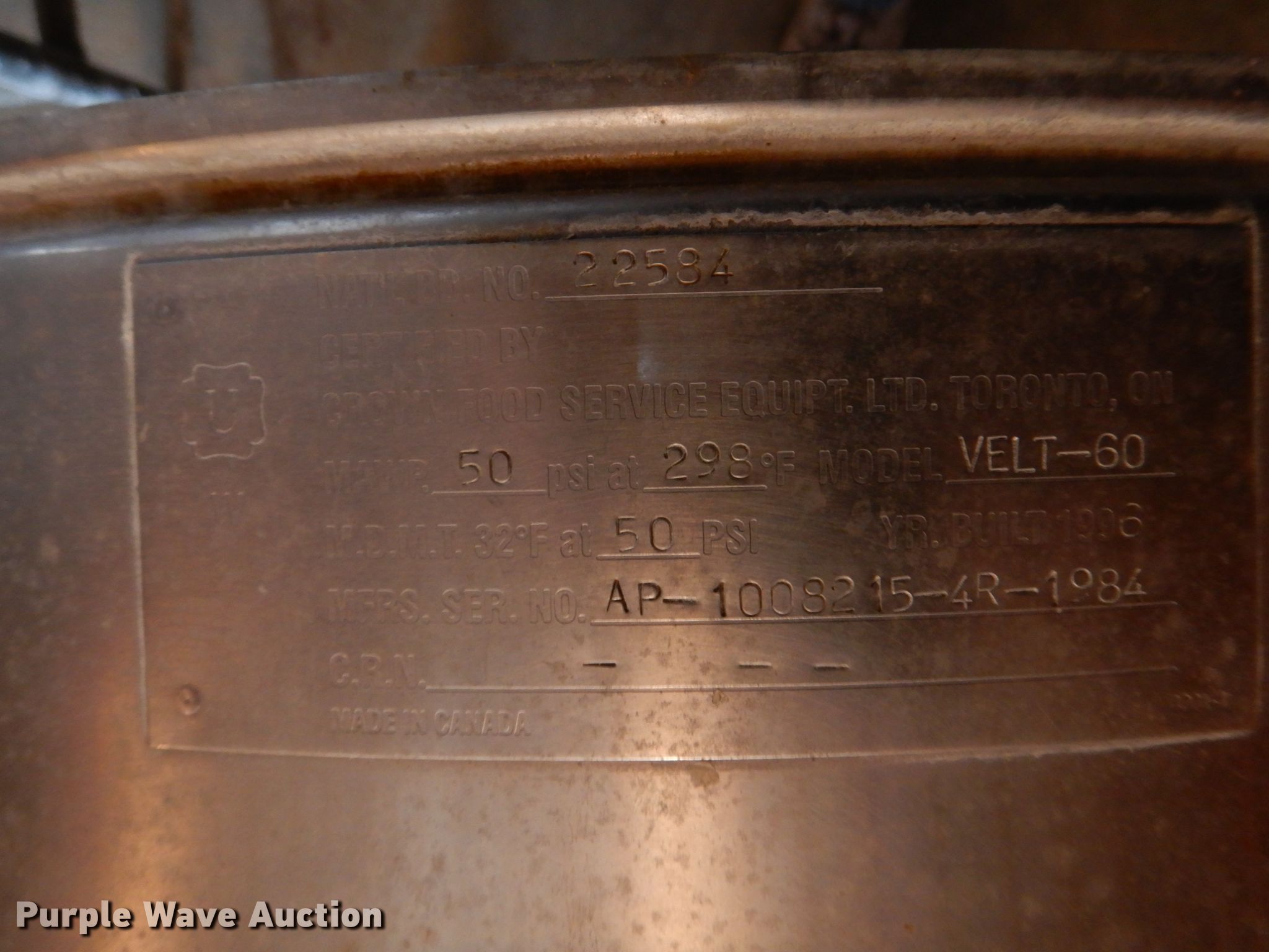 Purple Wave is selling a used Restaurant Equip. in Missouri. This item is a Restraunt equipment with the following: Groen TDA-S0 table, 60"W x 35"D x 44"H, (2) 12" diameter pots, Spout, Serial: 124801, Crown Velt-60 Pot, Approx. 36"H x 30" diameter, Approx. 40"W base, Serial: AP-1008215-4R-1984, Unknown operating conditions