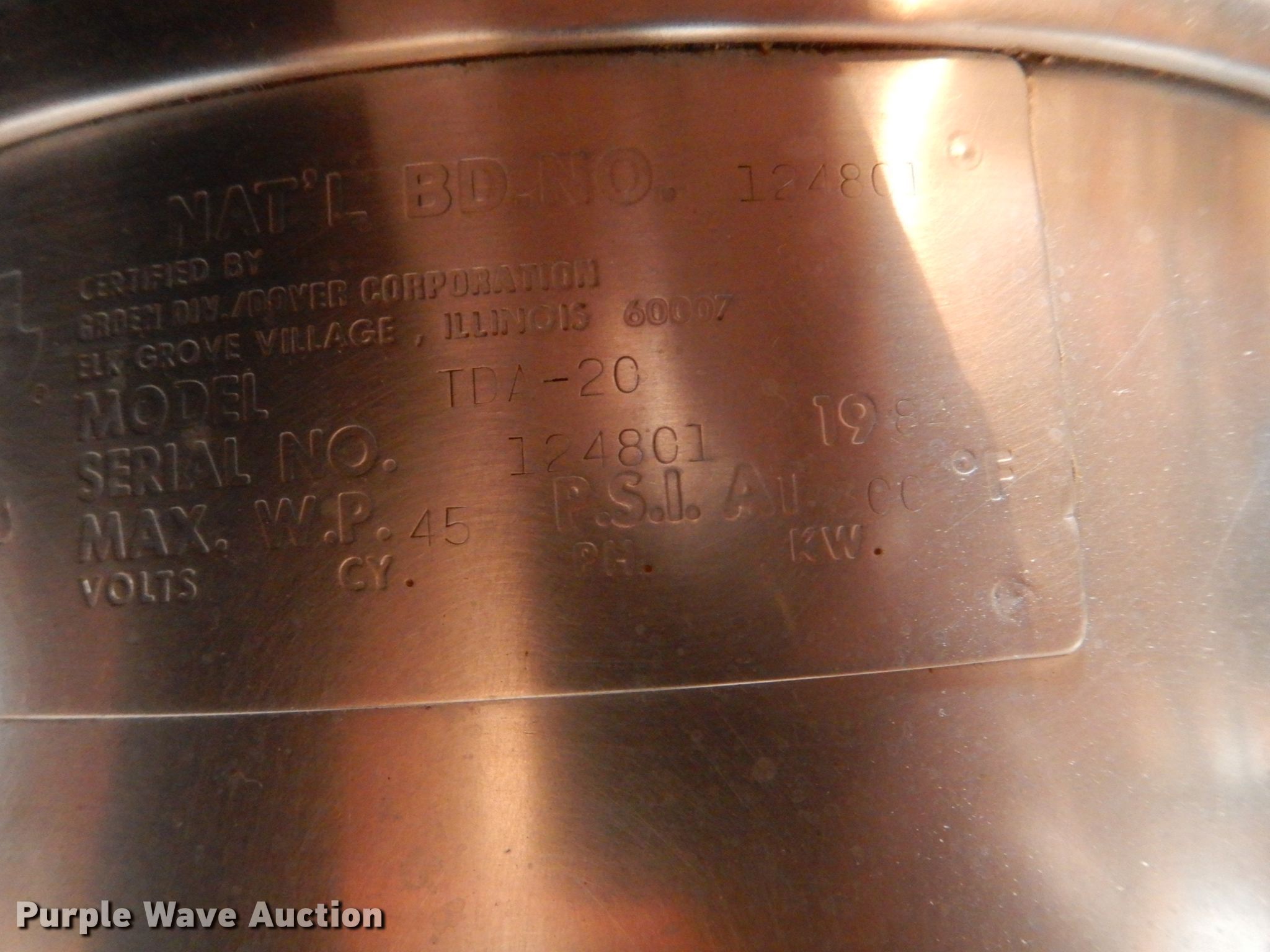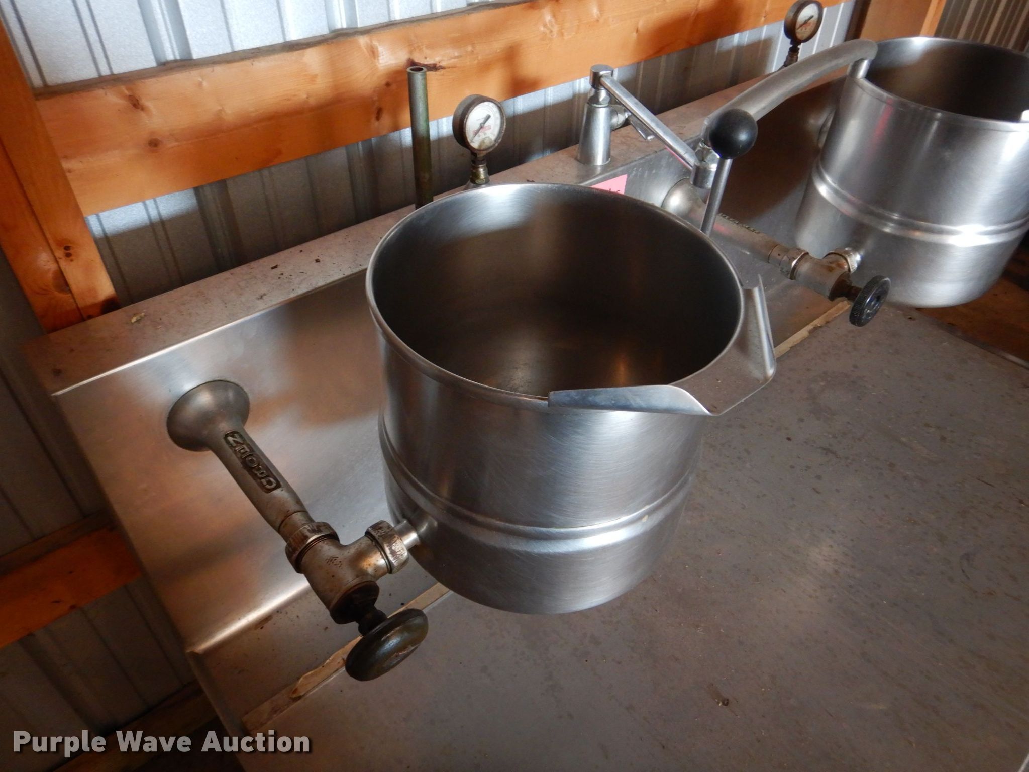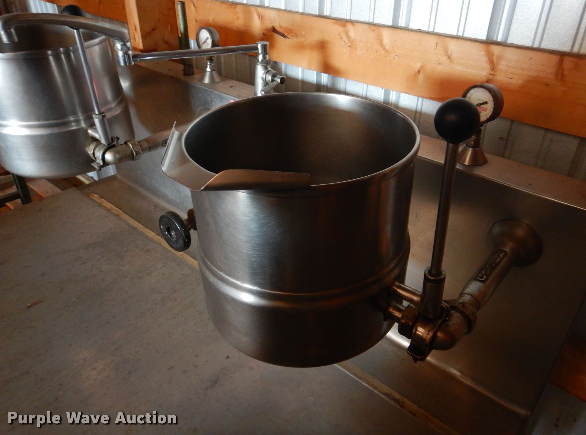 Purple Wave is selling a used Restaurant Equip. in Missouri. This item is a Restraunt equipment with the following: Groen TDA-S0 table, 60"W x 35"D x 44"H, (2) 12" diameter pots, Spout, Serial: 124801, Crown Velt-60 Pot, Approx. 36"H x 30" diameter, Approx. 40"W base, Serial: AP-1008215-4R-1984, Unknown operating conditions