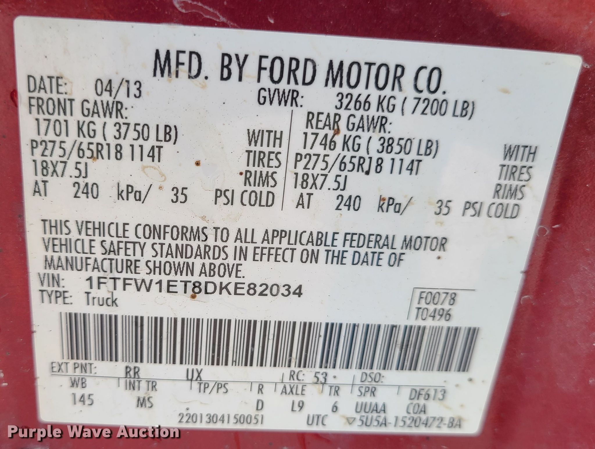 - VIN: 1FTFW1ET8DKE82034