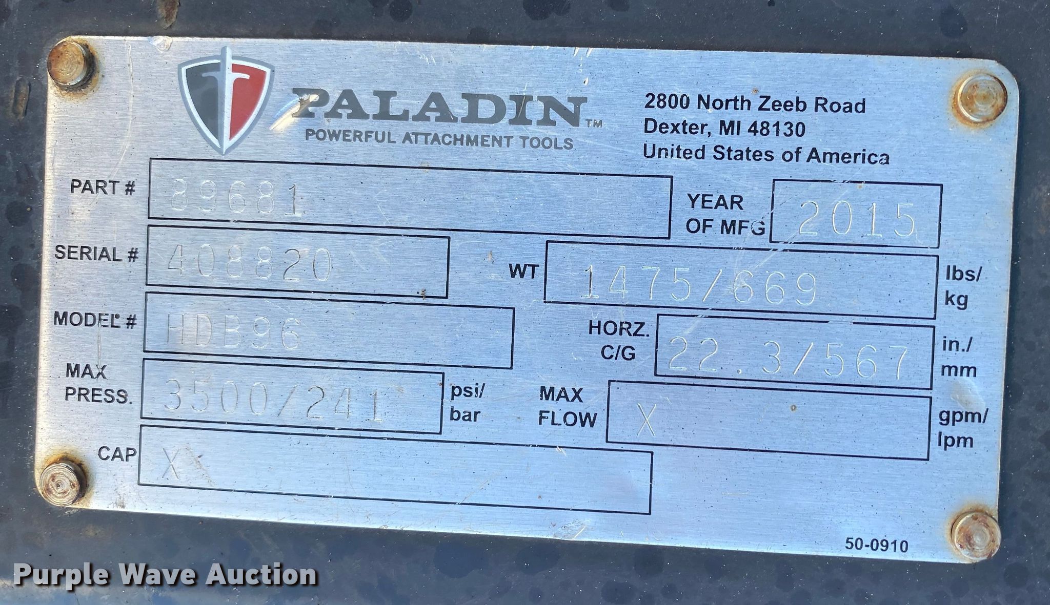 Purple Wave is selling a used Skid Steer Attach. in Oklahoma. This item is a 2015 Paladin HDB96 skid steer dozer blade with the following: Width: 96", Serial: 408820