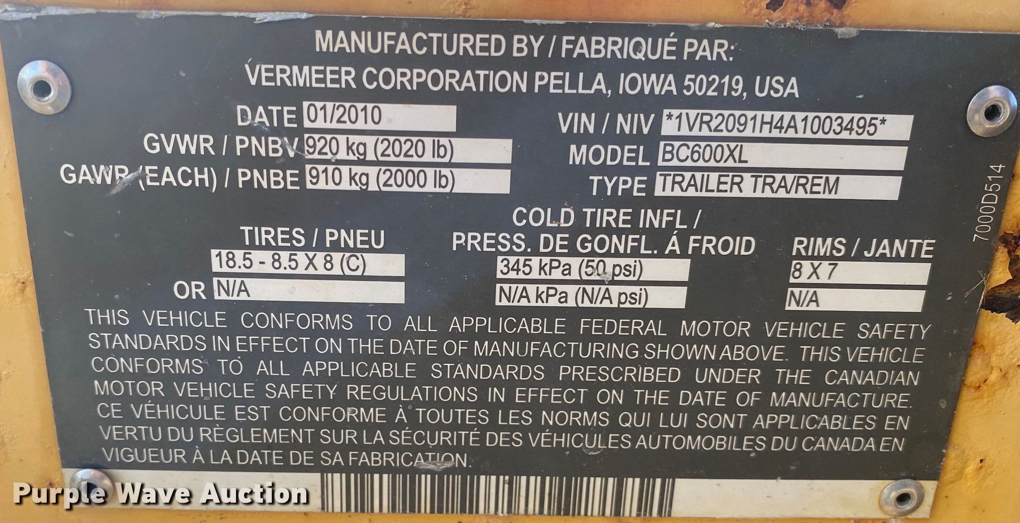 Purple Wave is selling a used Wood Chipper or Stump Grinder in Oklahoma. This item is a 2010 Vermeer BC600XL wood chipper with the following: Hours: 561 on meter, VIN: 1VR2091H4A1003495