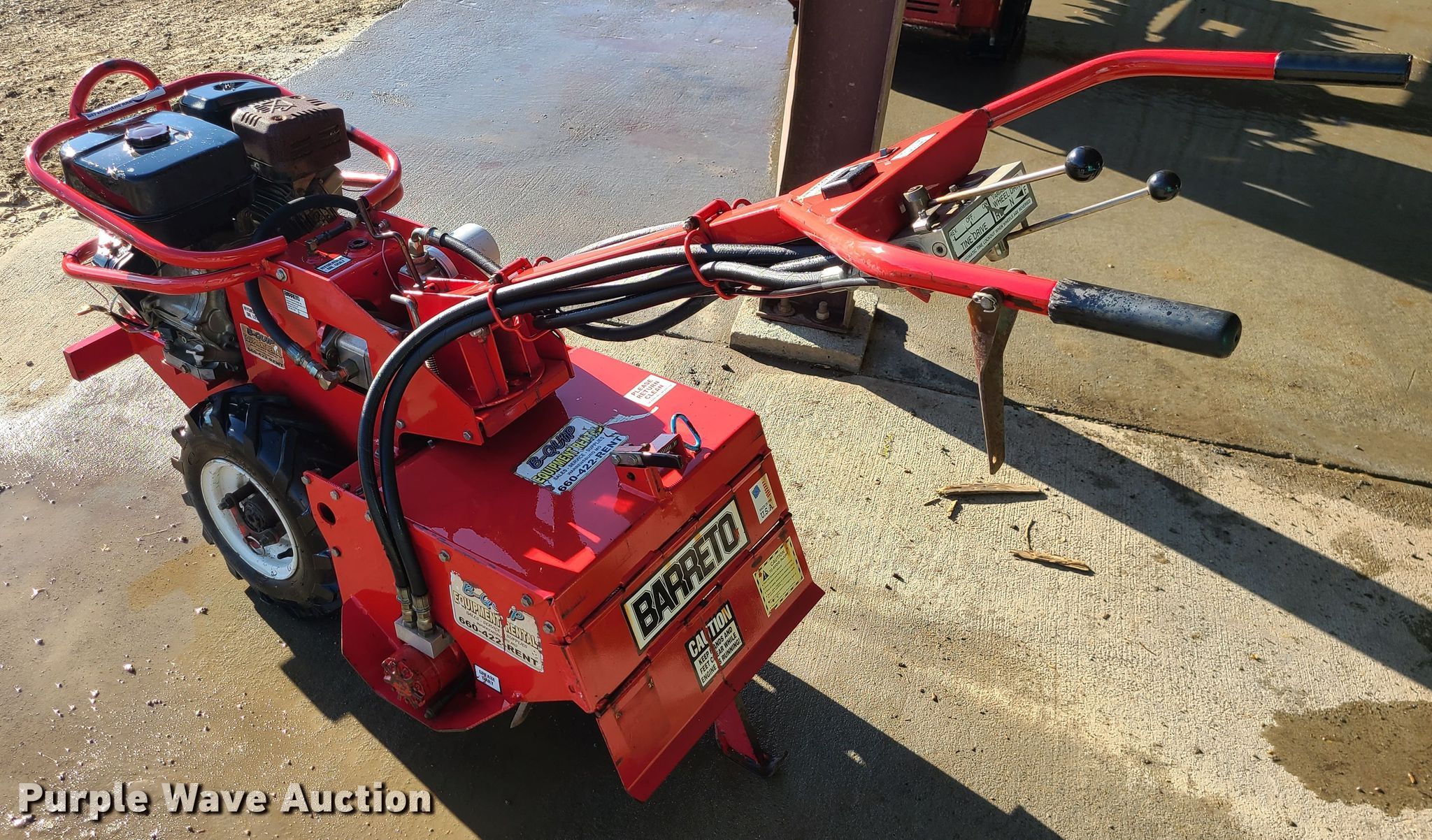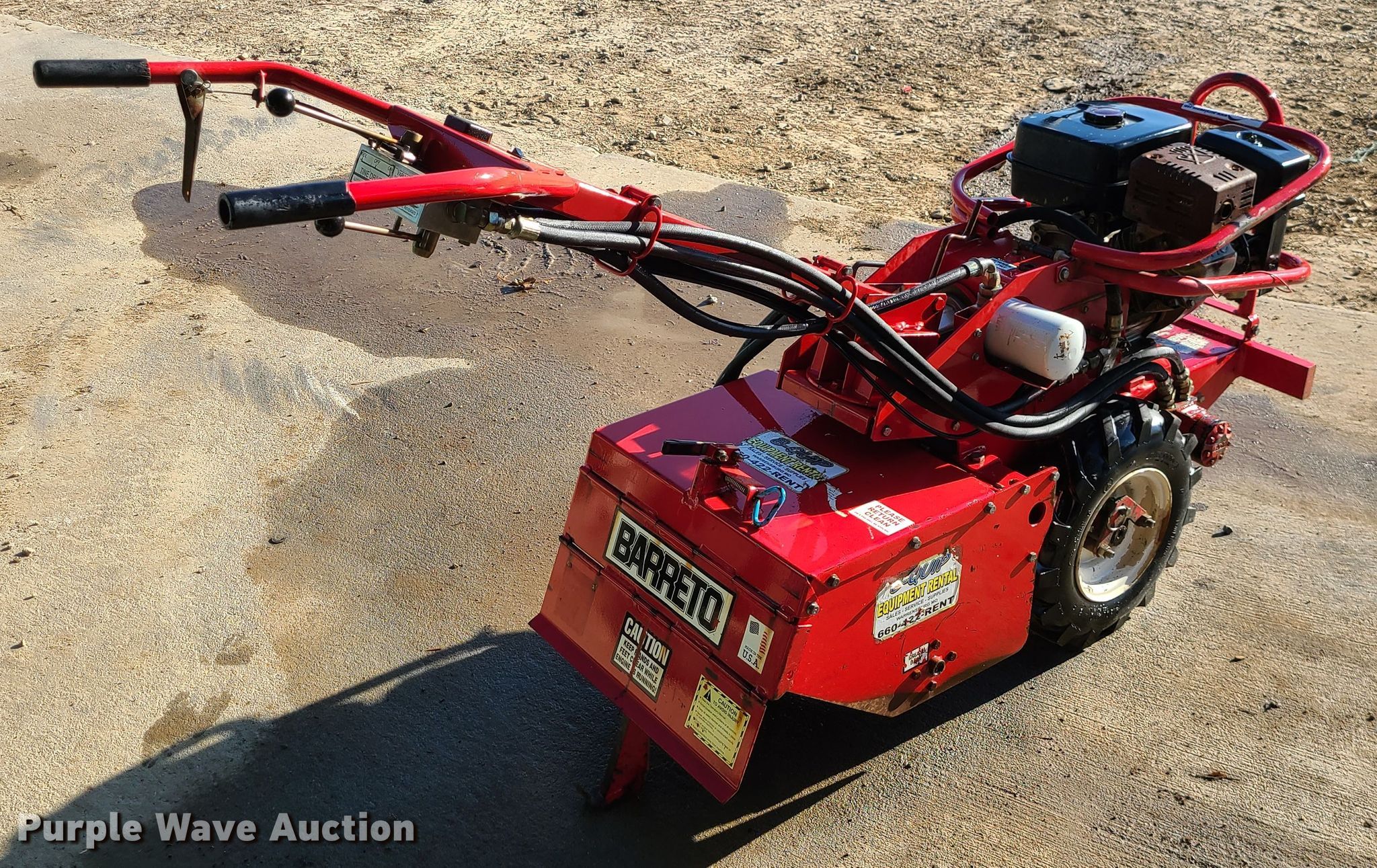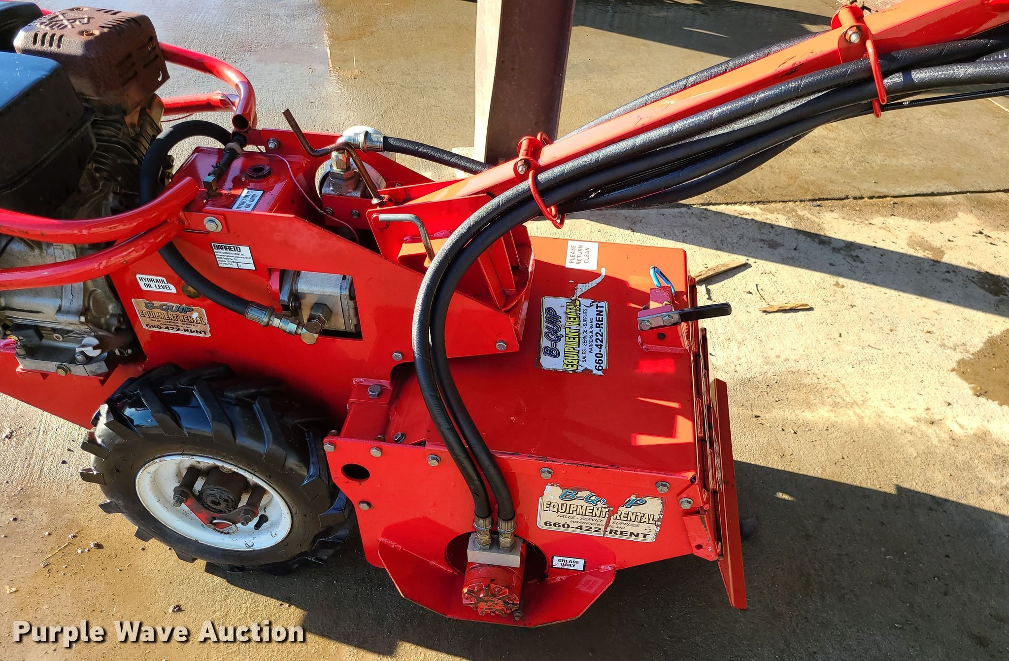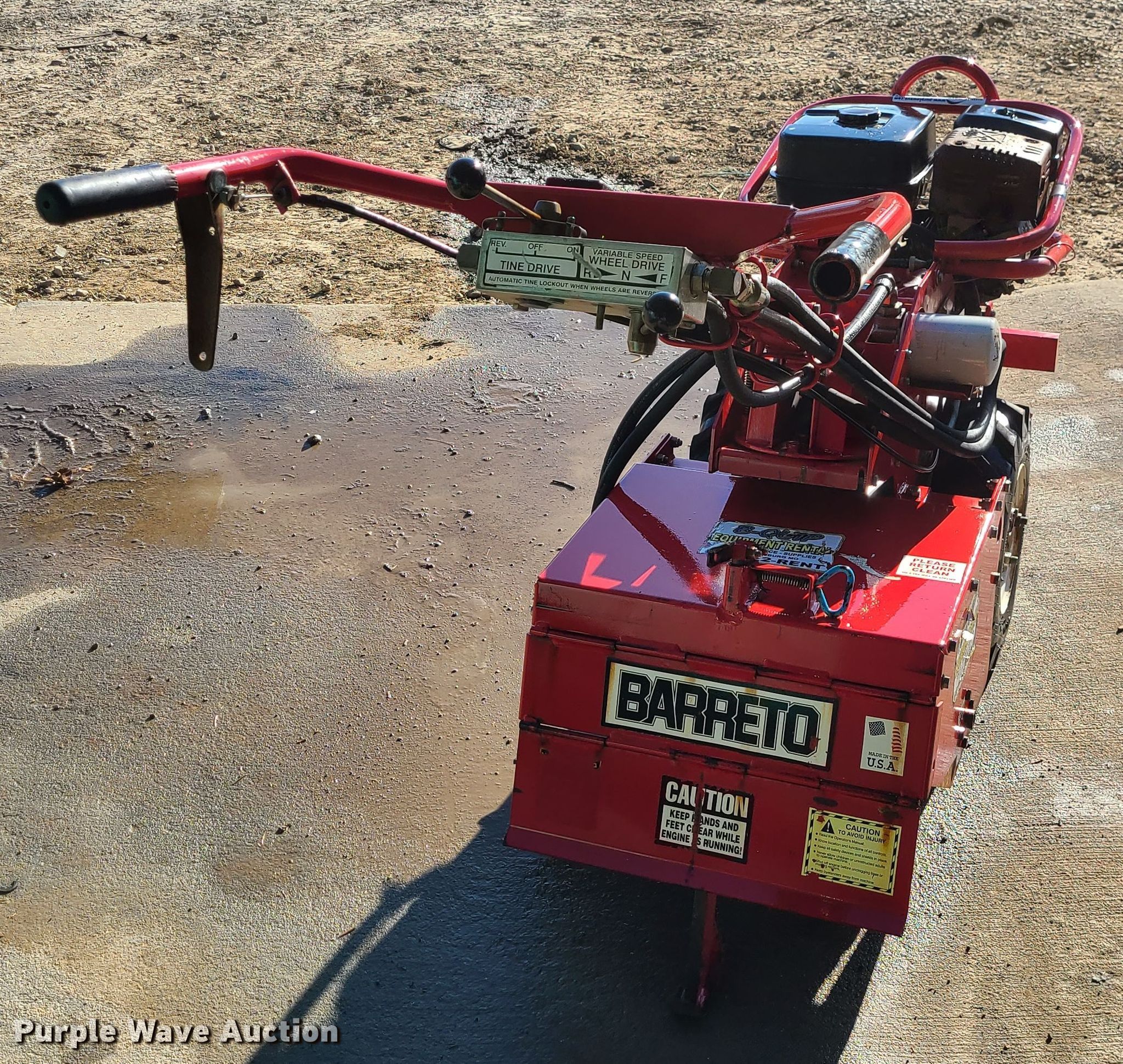 Purple Wave is selling a used Lawn and Garden in Missouri. This item is a Barreto rear tine tiller with the following: 9 HP gas engine, Hydrostatic transmission, 20"W, 4.80/4-8 tires, Serial: U0851