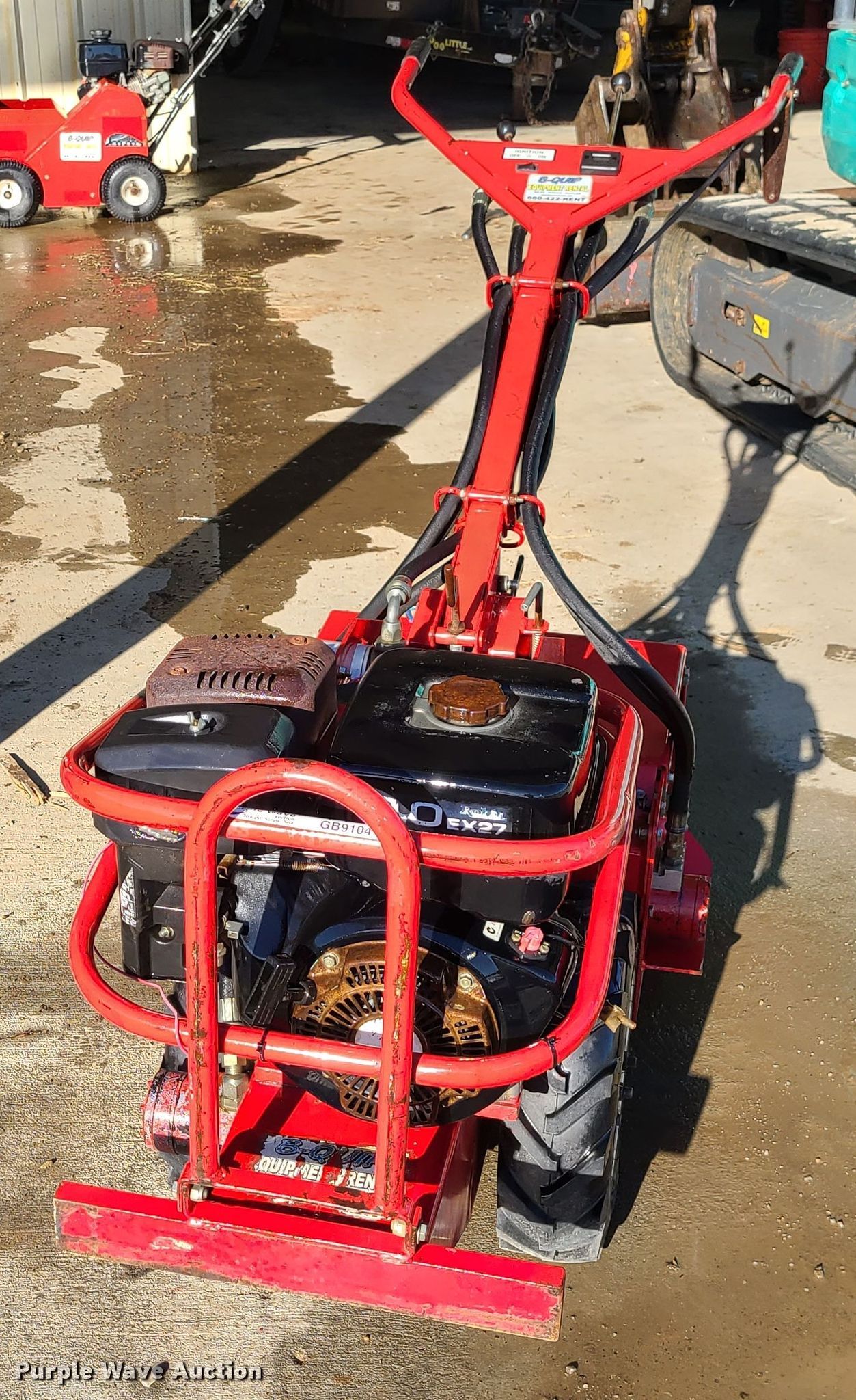 Barreto rear tine tiller. 9 HP gas engine, Hydrostatic transmission, 20"W, 4.80/4-8 tires, Serial: U0851. B-Quip Equipment Rental. 82 NW 151st Rd. Centerview, MO 64019