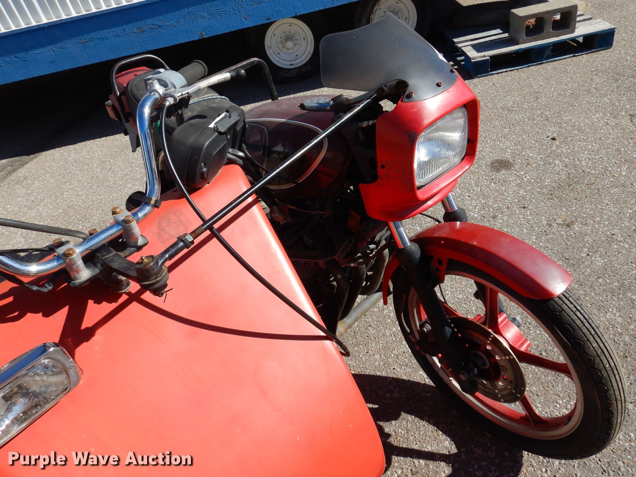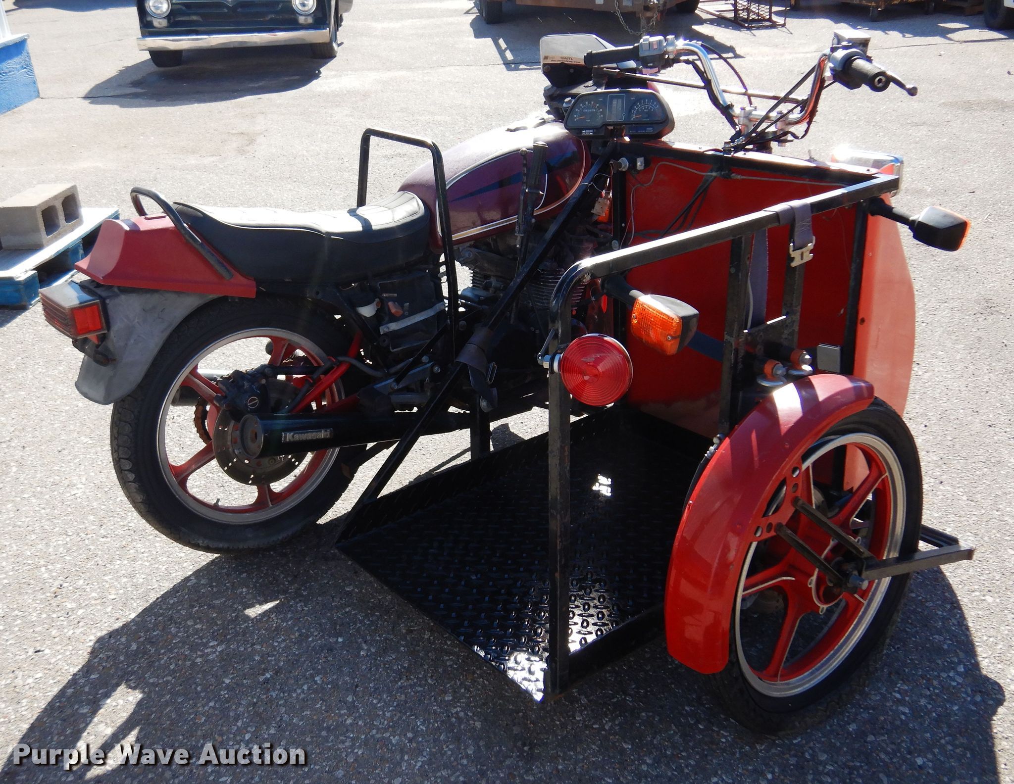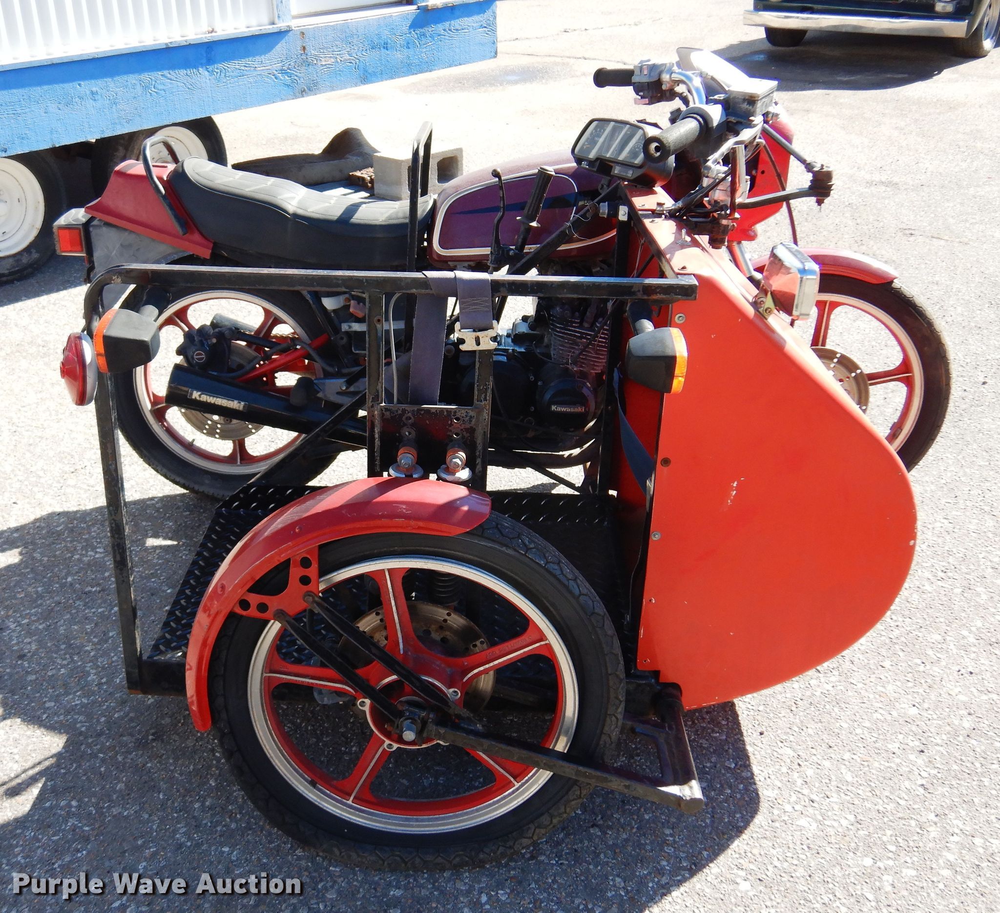 1982 Kawasaki 750 motorcycle. Miles: 98,267 on odometer, VIN: JKAKZFH12CA007653. Engine Displacement: 750 cc, Cylinders: 4, Fuel type: Gas. Transmission Speed: 5. Operational Wheelchair side car. Tires Front: 3.25/H19, Rear: 4.25/85R18. Notes Unknown operating condition. Kansas title. 6125 N Broadway Ave. Park City, KS 67219