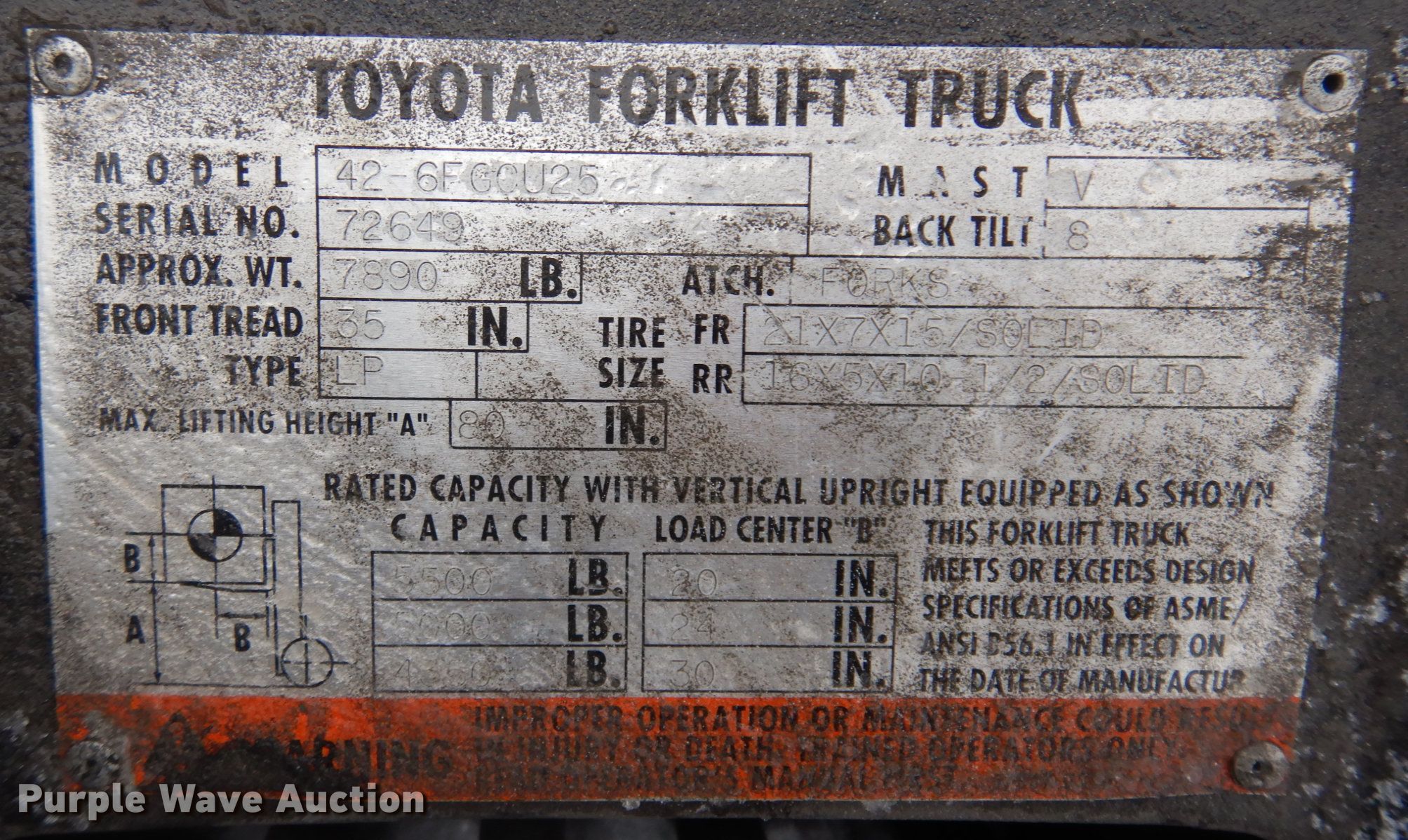 Purple Wave is selling a used Warehouse Forklift in Montana. This item is a Toyota 42-6FGCU25 forklift with the following: Hours: 43,084 on meter, Serial: 72649