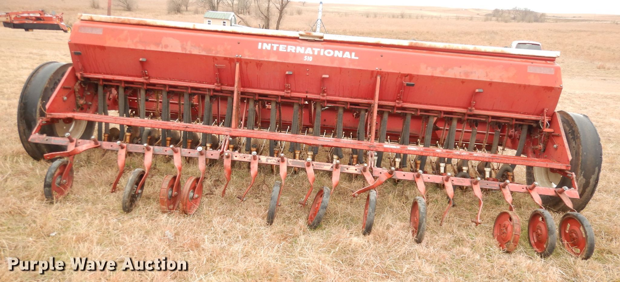 Purple Wave is selling a used Grain Drill or Seeder in Kansas. This item is a International 510 grain drill with the following: Width: 13'6", Row units: 20, Row spacing: 9"