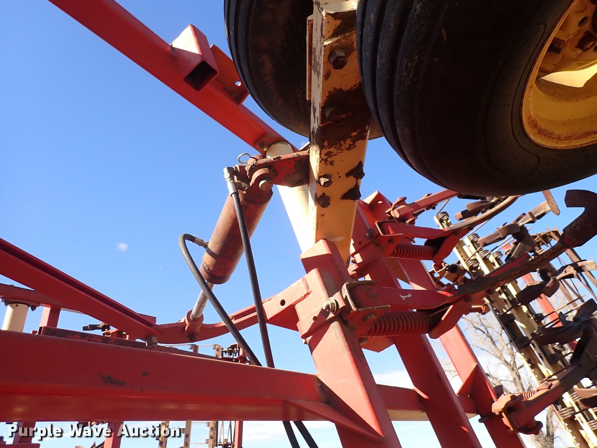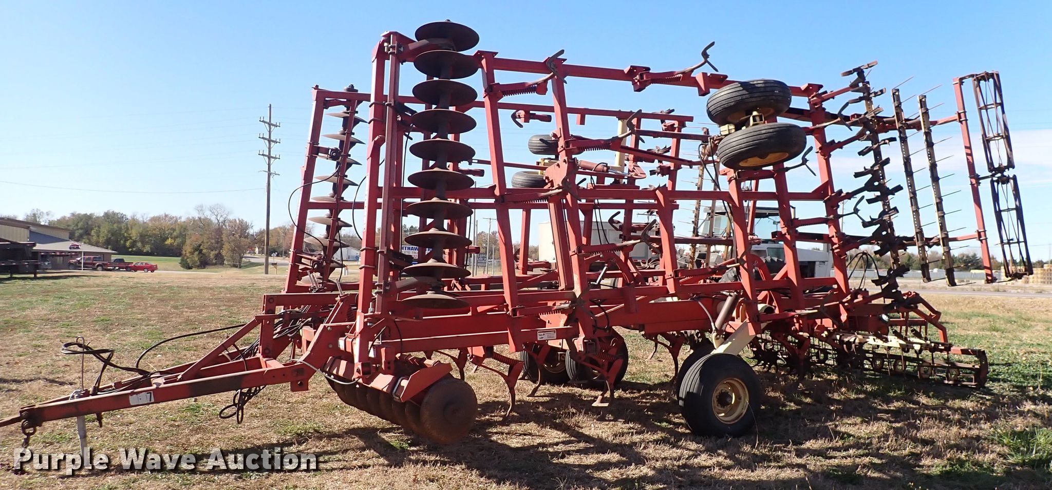 Krause 6327A mulcher finisher. Overall width: 32', Serial: 1124. Operational Shanks: 36, Sweep width: 10", Blade diameter Front: 19", Operation Hydraulic lift, Hydraulic fold, Attachments Tine harrow, Chopper reel, Rear hitch. Tires Tire size: 10.00-15. 1313 E Hwy 56. Lyons, KS 67554