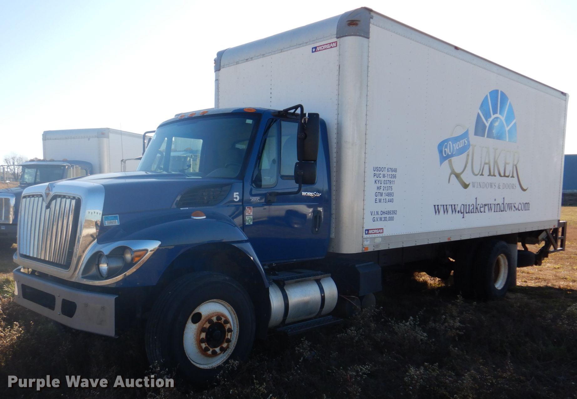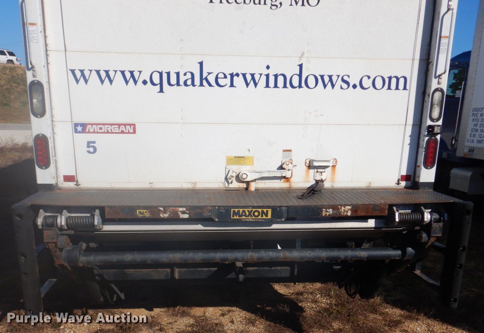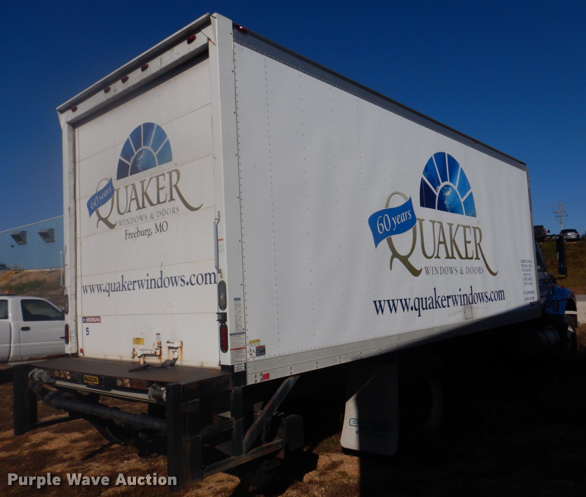 2013 International WorkStar 7300 box truck. Miles: 344,704 on odometer, VIN: 1HTZZAAN5DH486392, Unit #: 5. Engine International DT466, Displacement: 7.6L, Cylinders: 6, Fuel type: Diesel. Transmission Automatic. Chassis Axles: Single, Suspension: Spring, Brakes: Air, GVWR: 29,000 lbs, Wheelbase: 232". Interior AC, Heat. Operational Box bed Morgan GVSD09722FT, Serial: MWI51733-001, 22' L x 92" W x 95" H, Floor: Wood, End gate lift Maxon, Capacity: 3,000 lbs.. Tires Size: 11R22.5. Missouri title. Quaker Windows & Doors. 504 S Hwy 63. Freeburg, MO 65035
