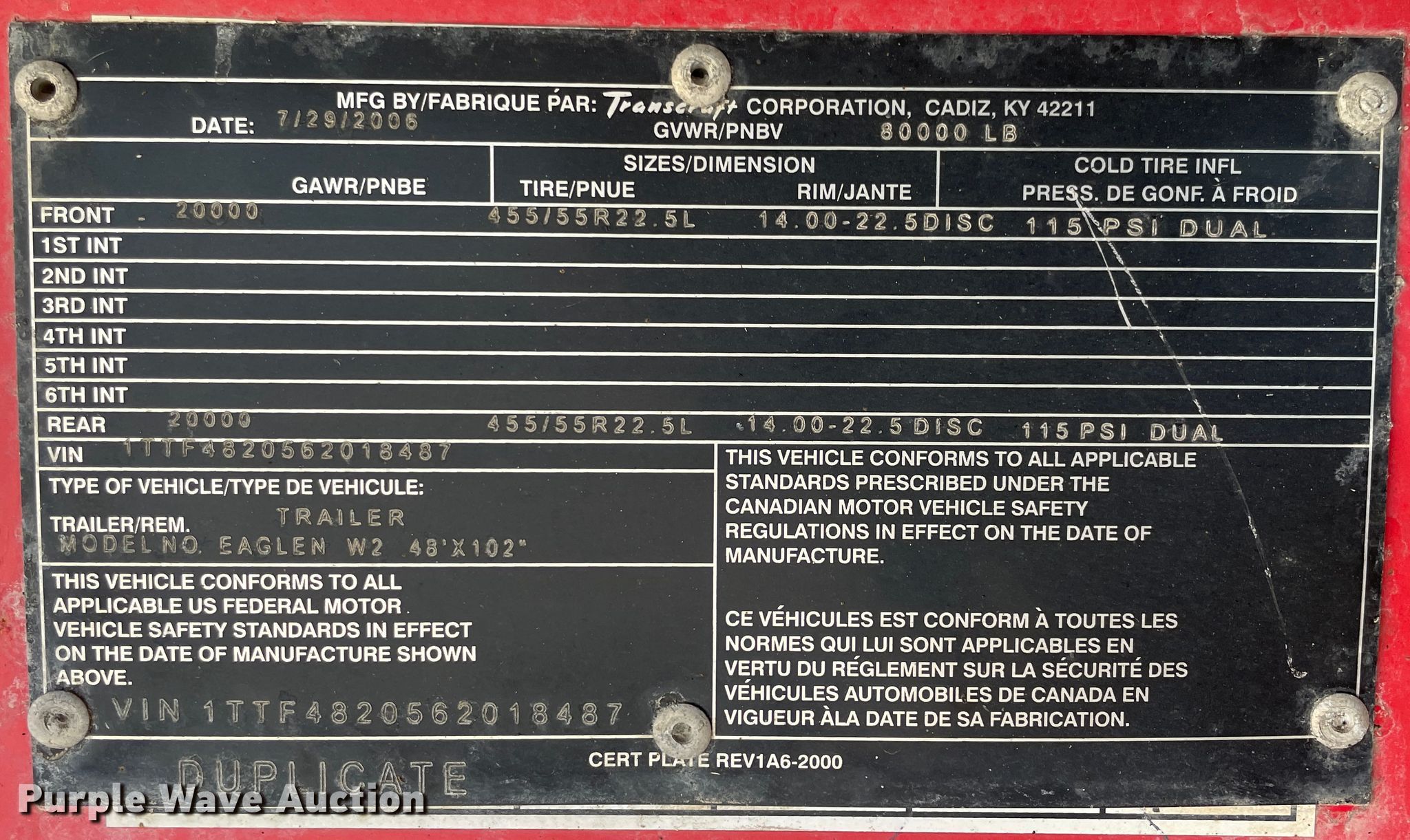 Purple Wave is selling a used Flat or Drop Deck Trailer in Oklahoma. This item is a 2006 Transcraft Eagle flatbed trailer with the following: VIN: 1TTF4820562018487