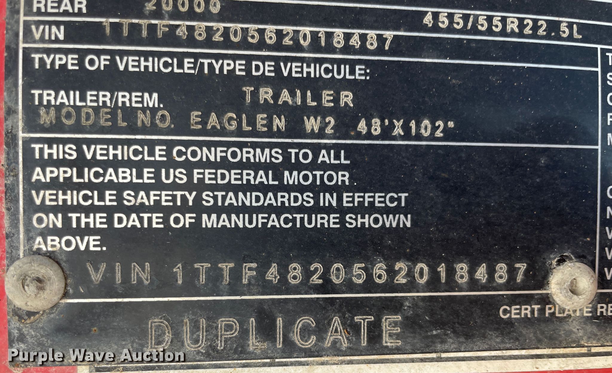2006 Transcraft Eagle flatbed trailer. VIN: 1TTF4820562018487. Dimensions Overall: 48' L x 8' W, Deck height: 4' 4". Operational Deck type: Aluminum, Wood. Chassis Landing gear: Dual, Two speed, Suspension: Air, Brakes: Air, Axles: Tandem, GVWR: 80,000 lbs, GAWR: 20,000 lbs. Tires Size: 455/55R22.5. Oklahoma title. 1020 Fort Gibson Rd. Catoosa, OK 74015