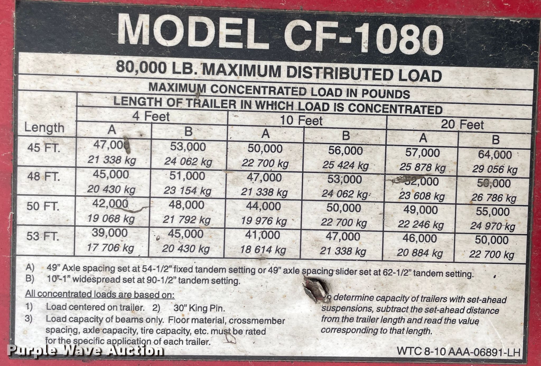 2012 Wilson CF-1080 flatbed trailer. VIN: 4WWBGB6B5CN618624. Dimensions Overall: 48' L x 8' W, Deck height: 4' 7". Operational Deck type: Aluminum, Wood. Chassis Landing gear: Dual, Two speed, Suspension: Air, Brakes: Air, Axles: Tandem, GVWR: 89,250 lbs, GAWR: 19,040 lbs. Tires Size: 295/75R22.5. Oklahoma title. 1020 Fort Gibson Rd. Catoosa, OK 74015