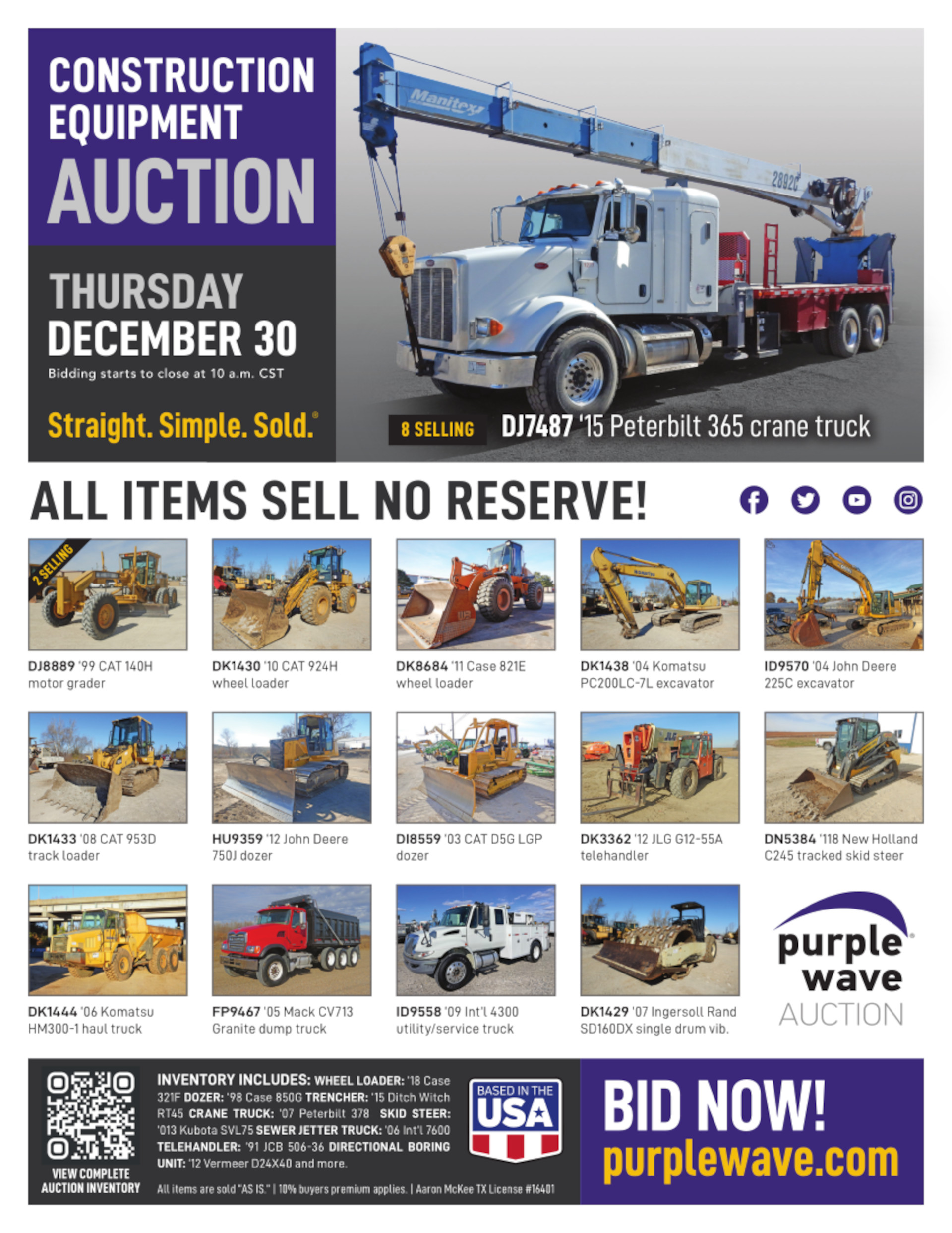 This auction is conducted by Purple Wave, Inc., whose home office is 825 Levee Drive, Manhattan, Kansas. Aaron McKee, Texas auctioneer license # 16401, operates Purple Wave, Inc. Complaints against us may be directed to the Texas Department of Licensing and Regulation, P.O. Box 12157, Austin, Texas 78711, (512) 463-6599. For additional required information, see the attached document.