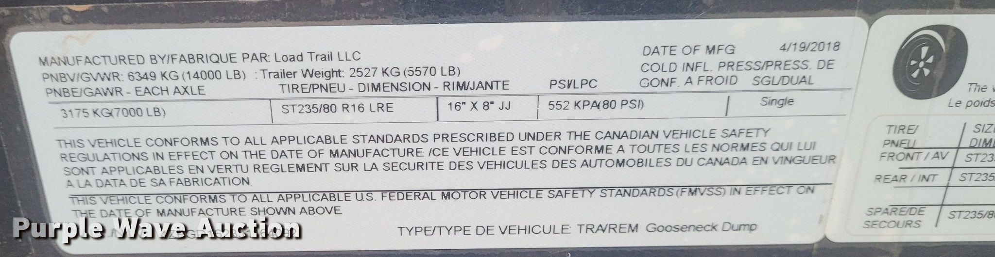 Purple Wave is selling a used Dump Trailer in Kansas. This item is a 2018 Load Trail dump trailer with the following: VIN: 4ZEGD1623J116492