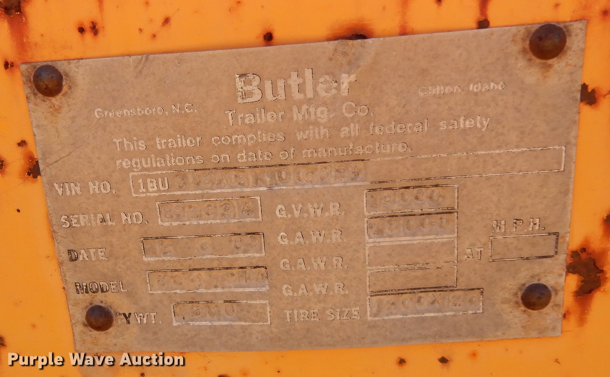 1990 Butler BC112HA reel trailer. VIN: 1BU015106K1006993. Dimensions Overall: 16' L x 8' W. Operational Reel: Single , Maximum reel width: 6', Maximum reel diameter: 83". Chassis Hitch: Pintle, Landing gear: Single, Suspension: Spring, GVWR: 15,000 lbs, GAWR: 15,000 lbs. Tires Size: 12.00-26. Transfer of ownership documentation will be a bill of sale. 7144 HWY 271 N. Gilmer, TX 75644