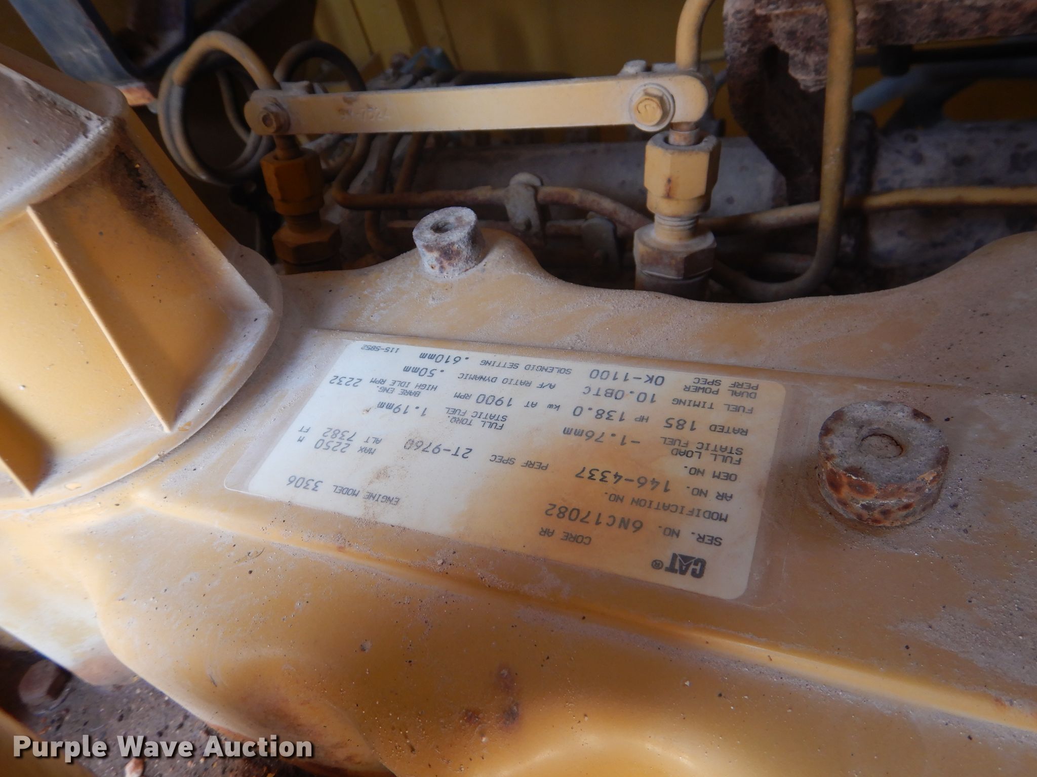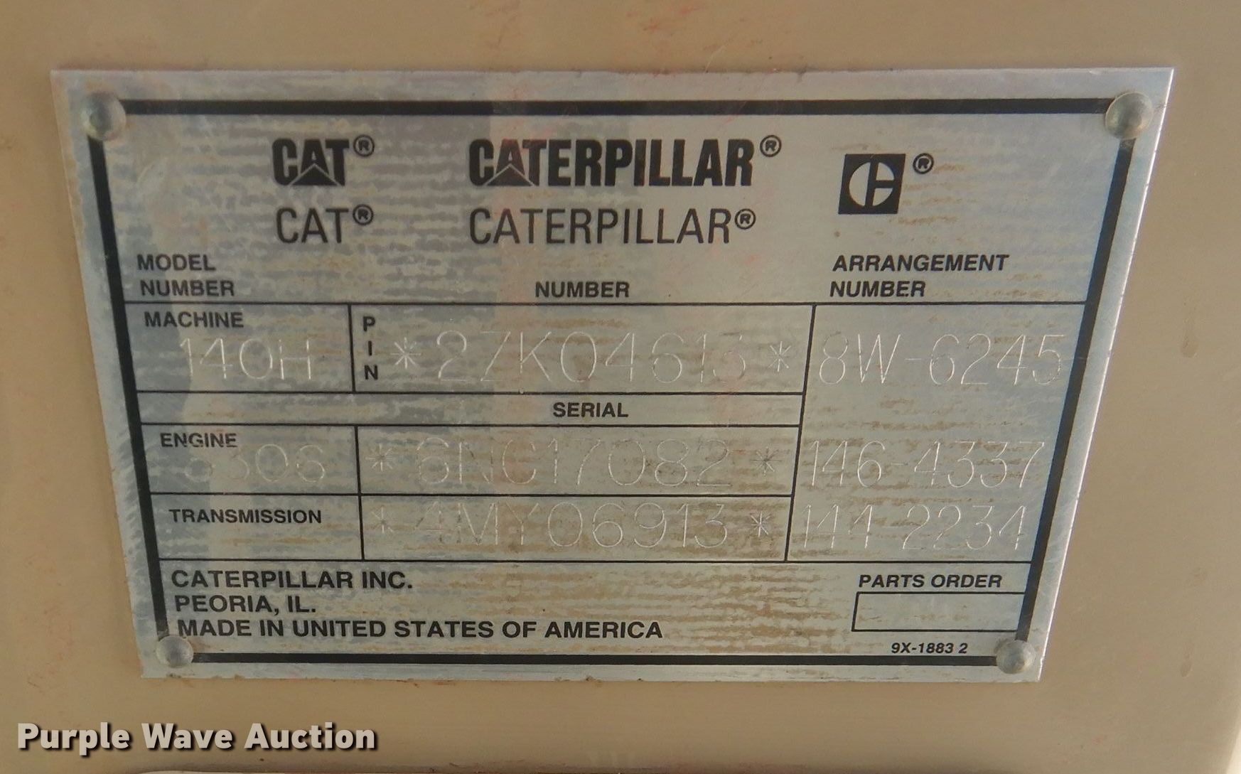 1999 Caterpillar 140H motor grader. Hours: 3,898 on meter, Serial: 2ZK04613. Engine Caterpillar 3306, Serial: 6NC17082, Displacement: 10.5L, Cylinders: 6, Fuel type: Diesel, HP: 230-350. Transmission Powershift, Direct-drive, 8F - 6R. Chassis Differential lock. Operators station EROPS AC, Heat, Hydraulic control valves: 9. Operational Moldboard: Side shift, Moldboard total length: 14', Front-mounted push block. Tires Size: 14.00R24. Notes Glass cracked. Upton County. 300 E Railroad Ave. Rankin, TX 79778