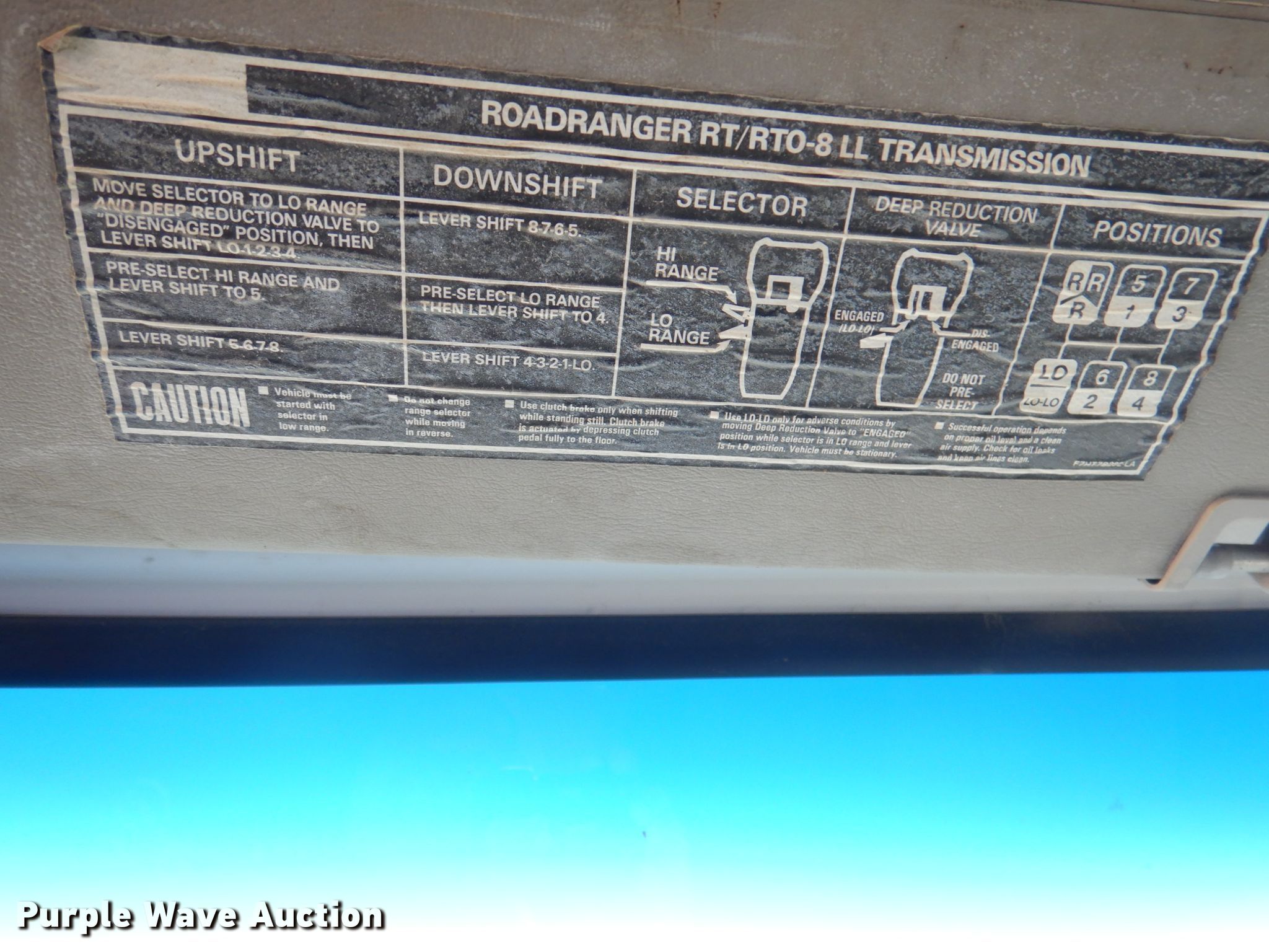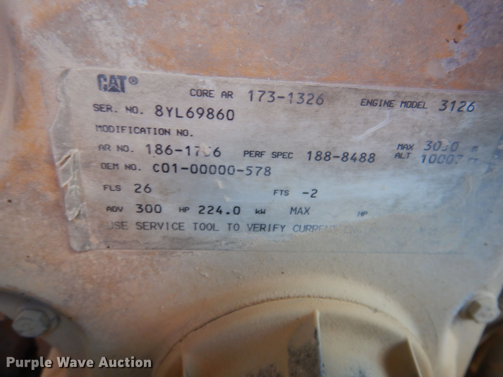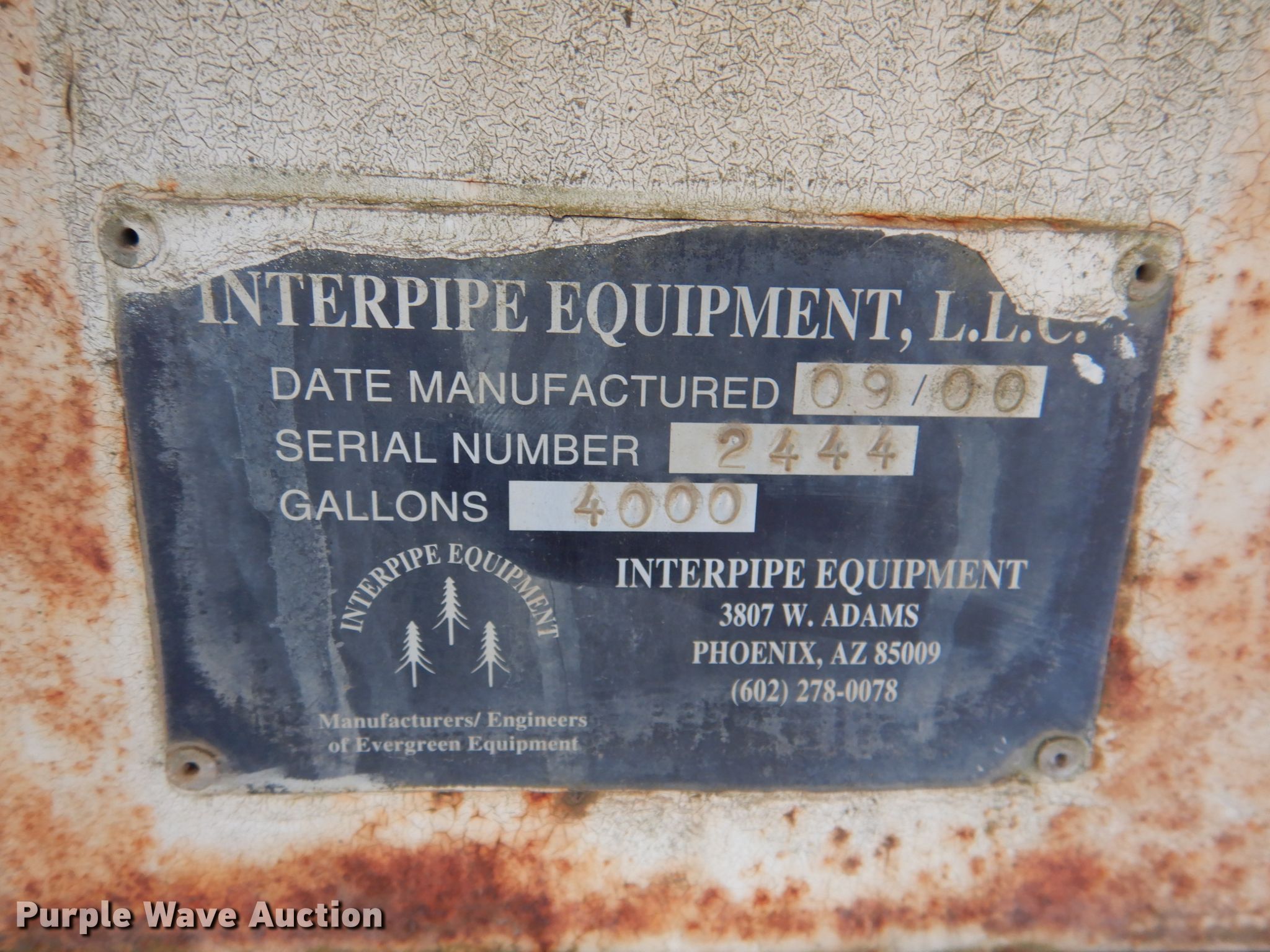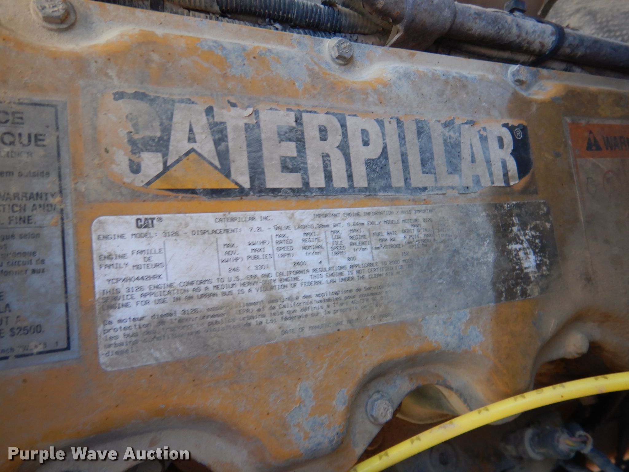 2001 Sterling LT7500 water truck. Miles: 158,563 on odometer, VIN: 2FZHATAK61AH77487. Engine Caterpillar 3126, Displacement: 7.2L, Cylinders: 6, Fuel type: Diesel, HP: 300. Transmission RoadRanger RT/RTO-8 LL, Manual, Speed: 10. Chassis Axles: Tandem, Differential lock: Inter-axle, Suspension: Spring over walking beam, Brakes: Air, PTO, GVWR: 56,000 lbs. Interior AC, Heat. Operational Bed / tank Interpipe equip, Serial: 2444, Capacity: 4,000 gallons, 16' L x 96" W, Water tank Spray bar: Front, Rear, Side discharge, Top fill. Tires Front: 315/80R22.5, Rear: 11R22.5. Notes Rear suspension bushings missing. Missouri title. Concrete Strategies, Inc.. Spring Hill, KS 66083