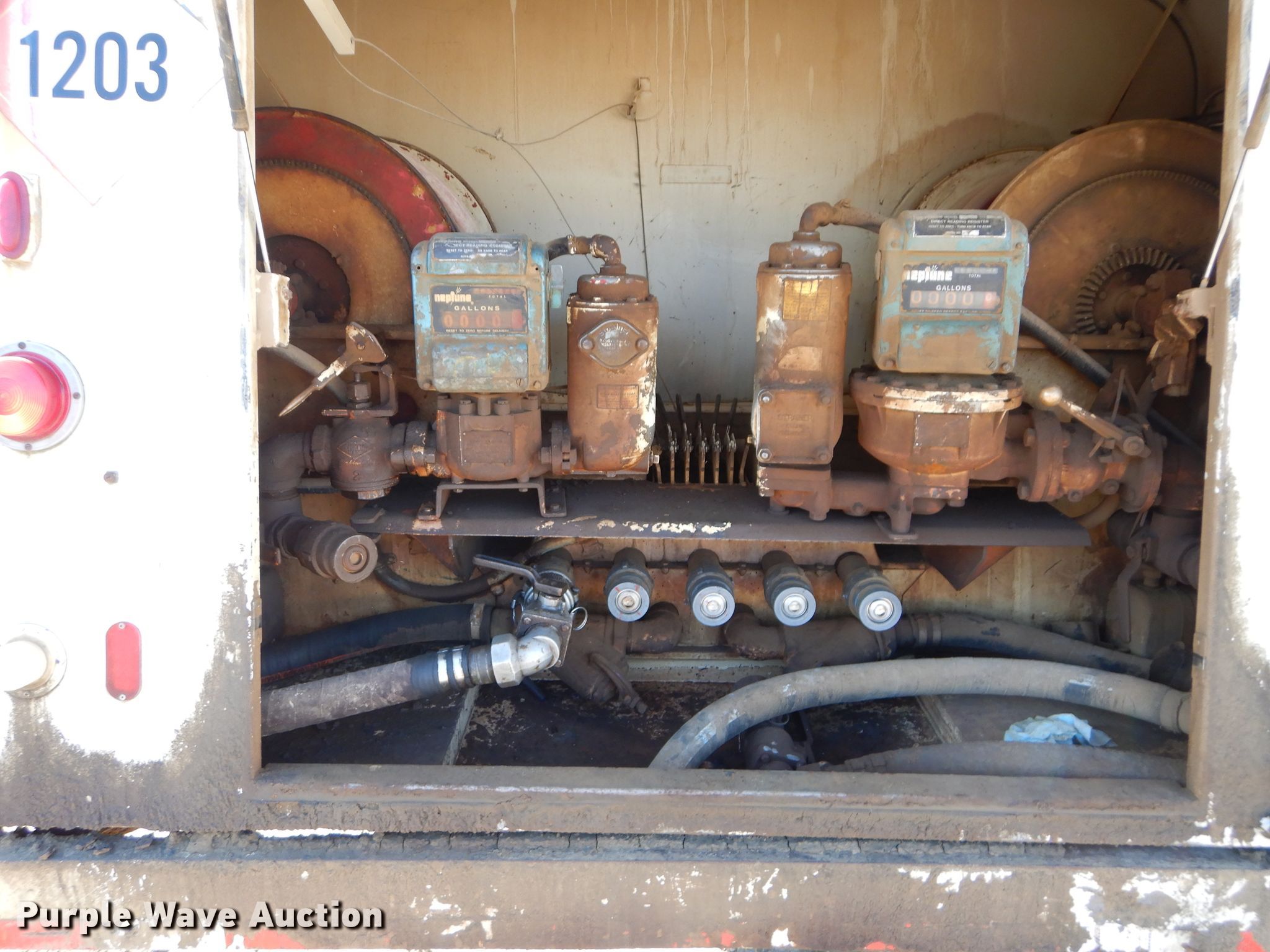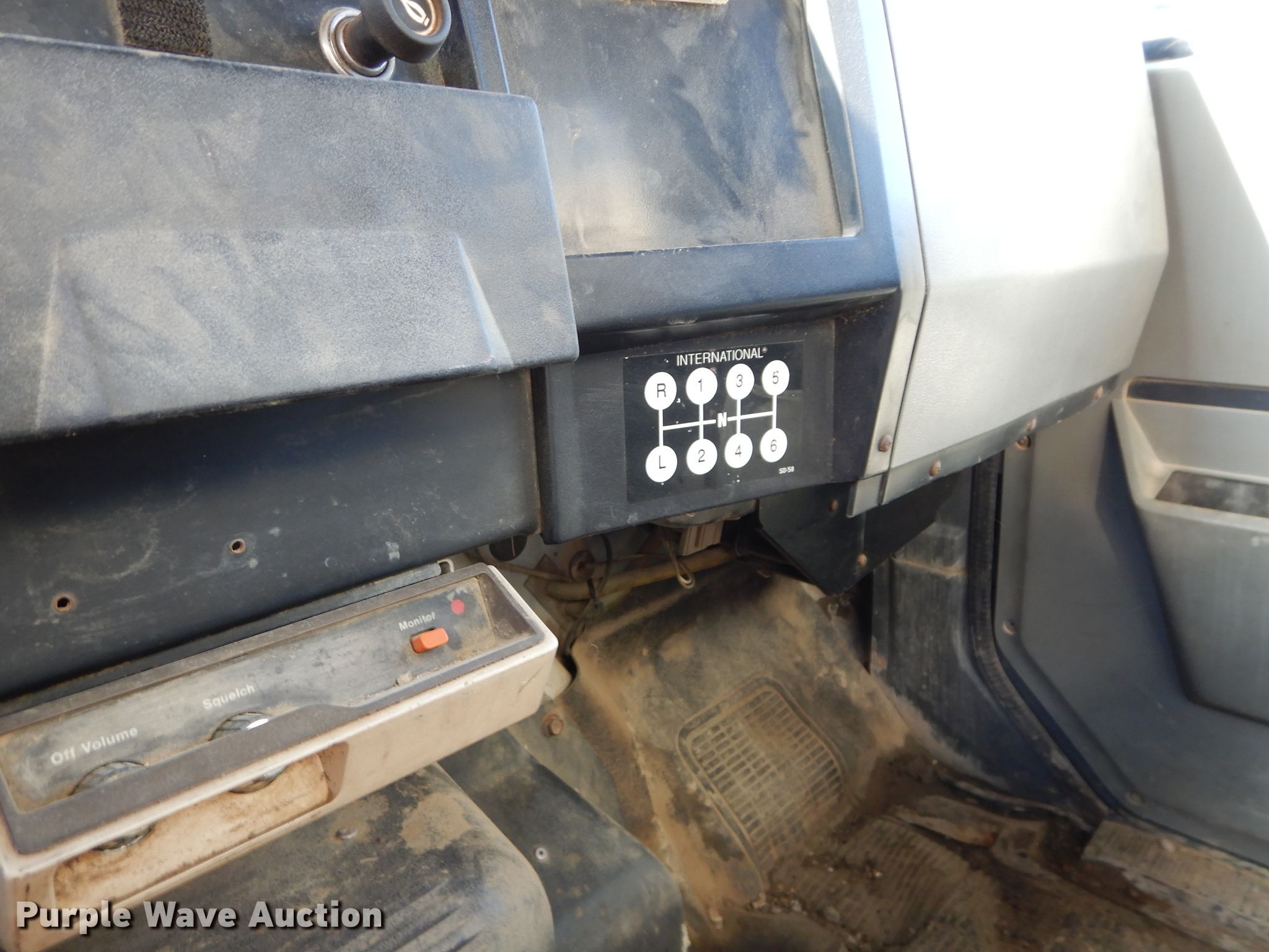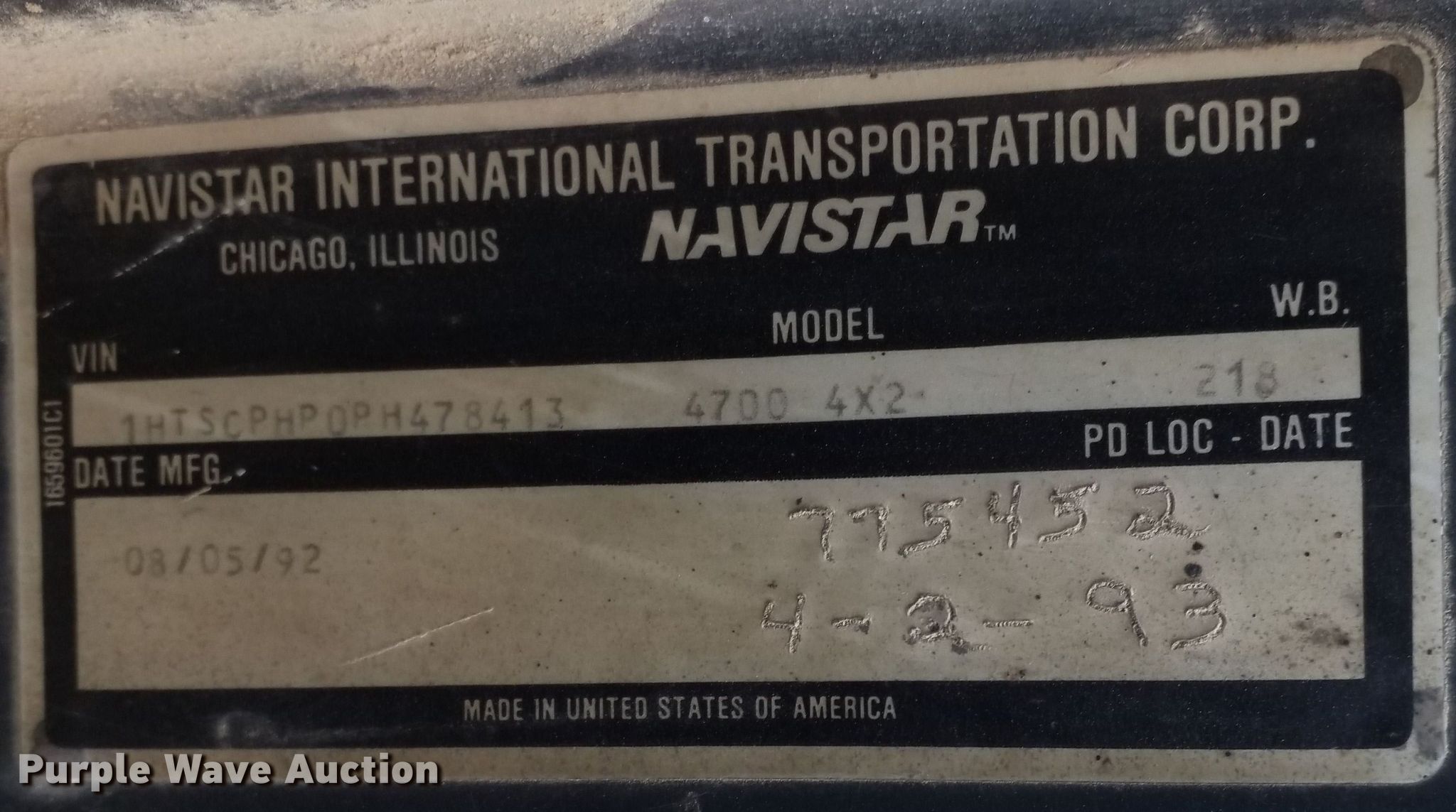 1993 International 4700 fuel truck. Miles: 364,470 on odometer, VIN: 1HTSCPHP0PH478413. Engine International DT360, Displacement: 5.9L, Cylinders: 6, Fuel type: Diesel. Transmission Manual, Speed: 7. Chassis Axles: Single, Suspension: Spring, Brakes: Hydraulic. Interior Heat. Operational Fuel system Hose reels: 2, Nozzles, Metered pumps: 2. Tires Size: 11R22.5. Notes Dash warning indicator: Brake, Dead batteries, Non-operational exterior driver door handle, Tank leaks. Kansas title. RoadBuilders Machinery & Supply Co In. 1001 S 7th St Trfy. Kansas City, KS 66105