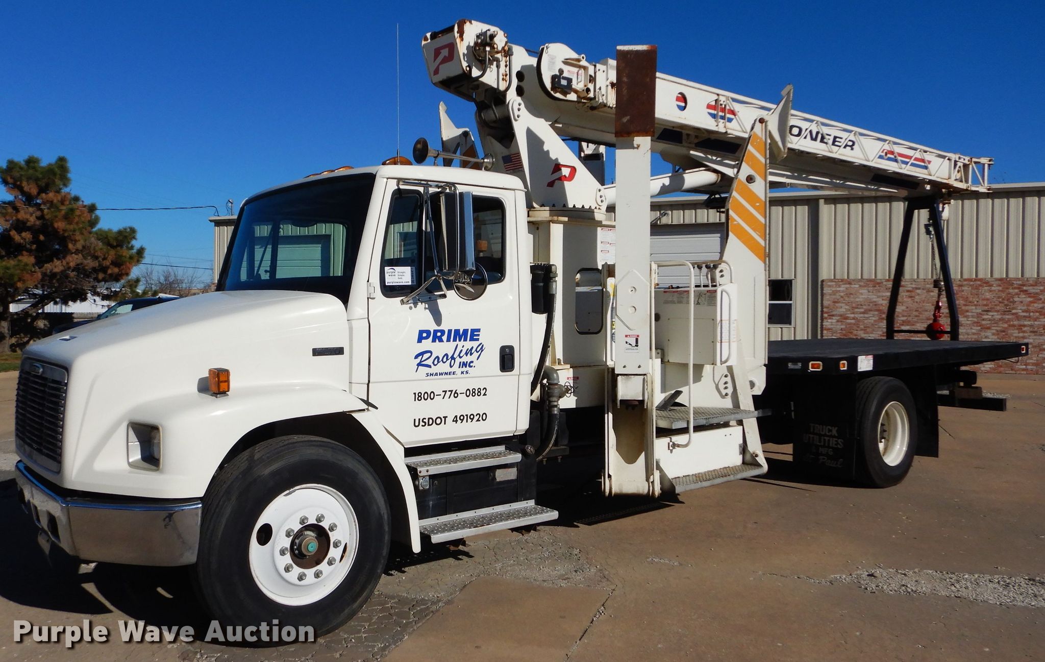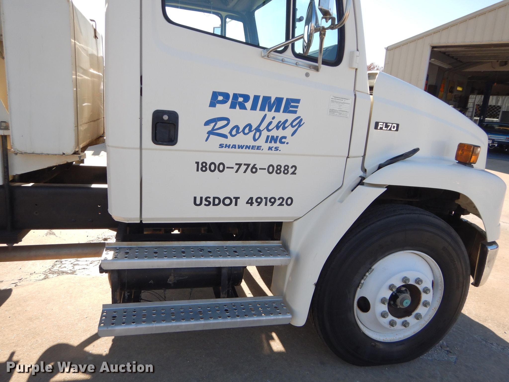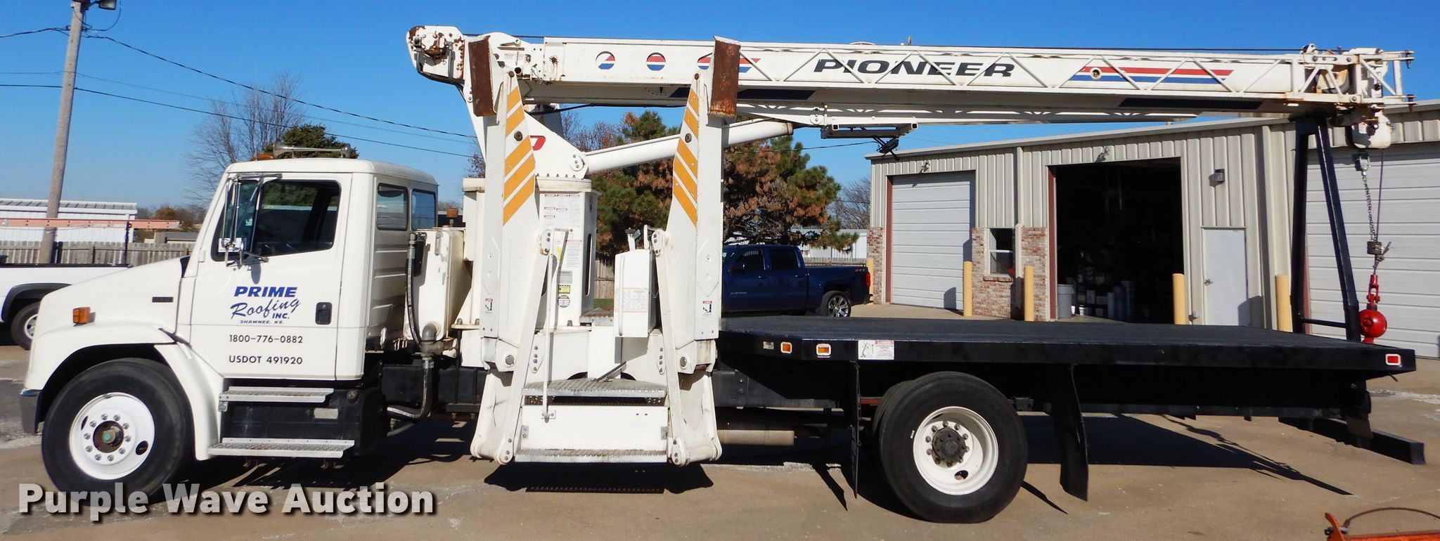 1998 Freightliner FL70 crane truck. Miles: 33,698 on odometer, Hours: 3,247 on meter, VIN: 1FV6HFBA7WH894735. Engine Cummins ISB, Displacement: 5.9L, Cylinders: 6, Fuel type: Diesel. Transmission Spicer, Manual, Speed: 7. Chassis Axles: Single, Suspension: Spring, Brakes: Air, PTO, GVWR: 33,000 lbs FAWR: 12,000 lbs, RAWR: 21,000 lbs. Interior AC, Heat. Operational Flatbed Knapheide, 16' L x 8' W, Crane Pioneer 1000 Serial: 131069701486, Boom Telescopic, Boom length: 63', Sections: 3, Maximum lift capacity: 30,000 lbs, Jib: 50', Boom controls, Crane ball & hook, Lift chart. Tires Size: 11R22.5. Kansas title. Prime Roofing Inc. 8235 Cole Pkwy. Lenexa, KS 66227